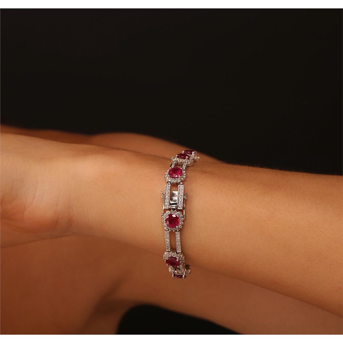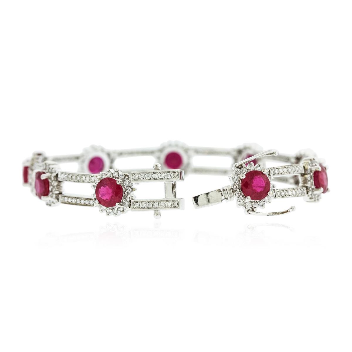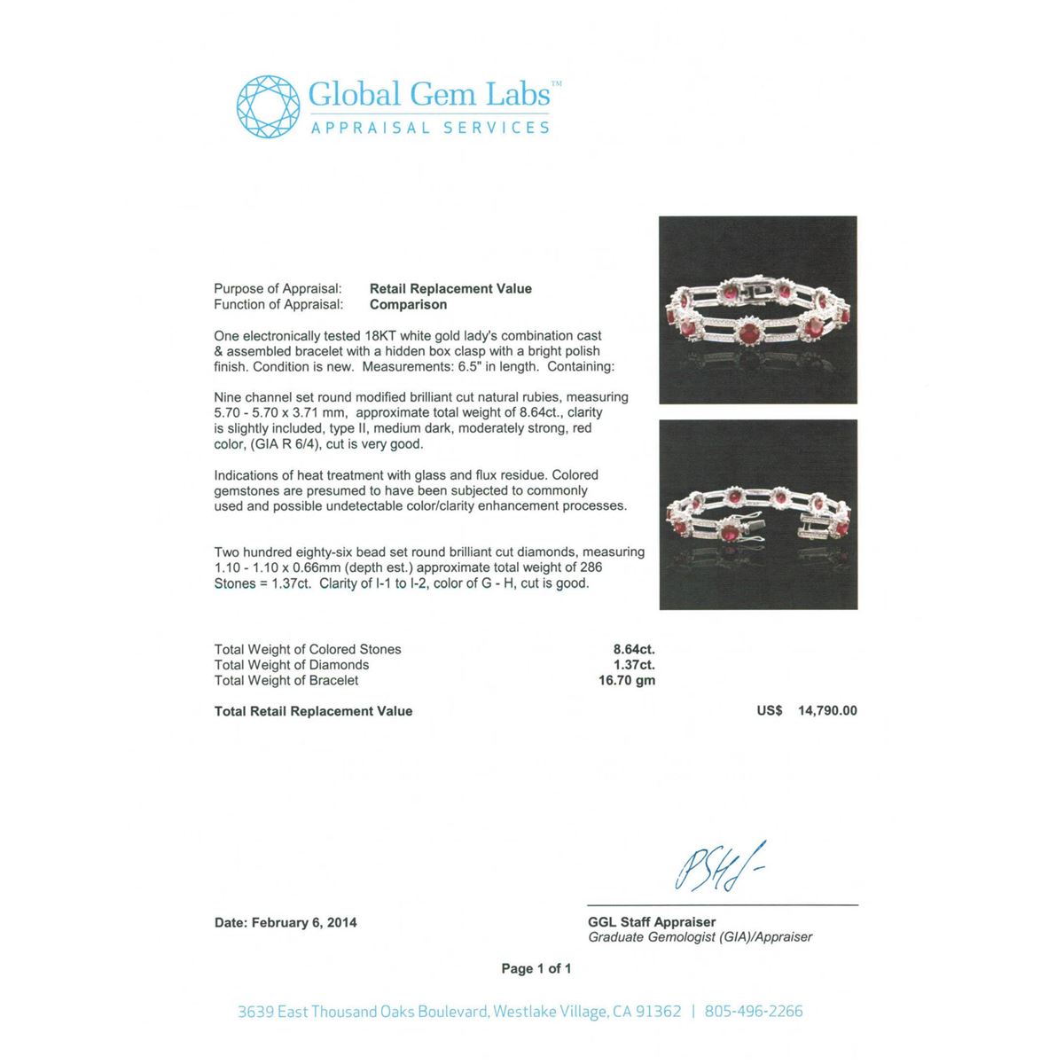 One electronically tested 18KT white gold Ladies combination cast & assembled bracelet with a hidden box clasp with a bright polish finish. Measurements: 6.5" in length. Condition is new. Containing: Nine channel set round modified brilliant cut natural rubies, measuring 5.70 - 5.70 x 3.71 mm, approximate total weight of 8.64ct., clarity is slightly included, type II, medium dark, moderately strong, red color, (GIA R 6/4), cut is very good. Indications of heat treatment with glass and flux residue. Colored gemstones are presumed to have been subjected to commonly used and possible undetectable color/clarity enhancement processes. Two Hundred Eighty-Six bead set round brilliant cut diamonds, measuring 1.10 - 1.10 x 0.66mm (depth est.) approximate total weight of 286 Stones = 1.37ct. Clarity of I-1 to I-2, Color of G - H, Cut is Good. Total Weight of Colored Stones 8.64ct. Total Weight of Diamonds 1.37ct. Total Weight of Bracelet 16.70gm. GGL Appraised at $14,790.00.