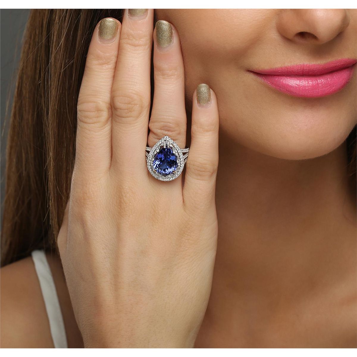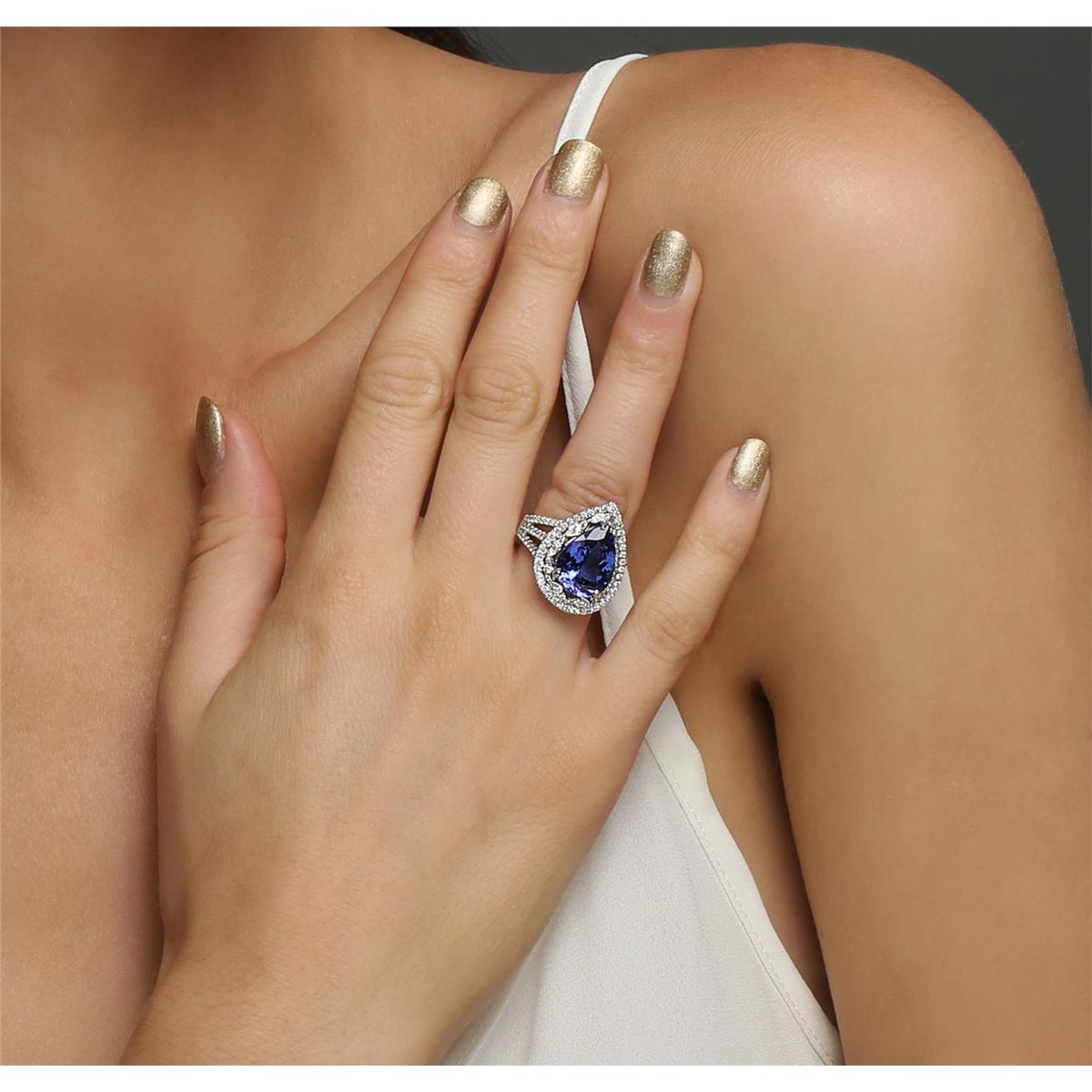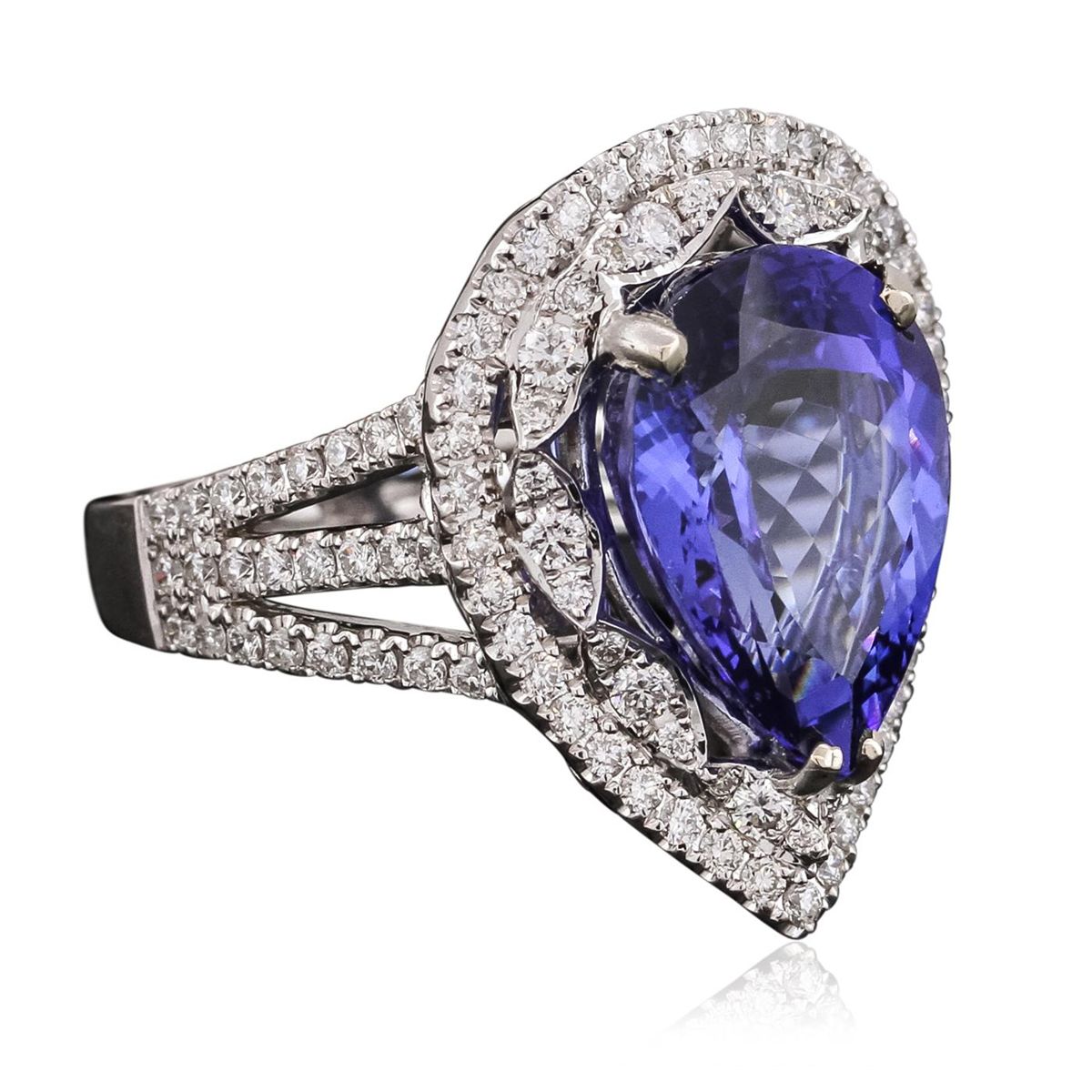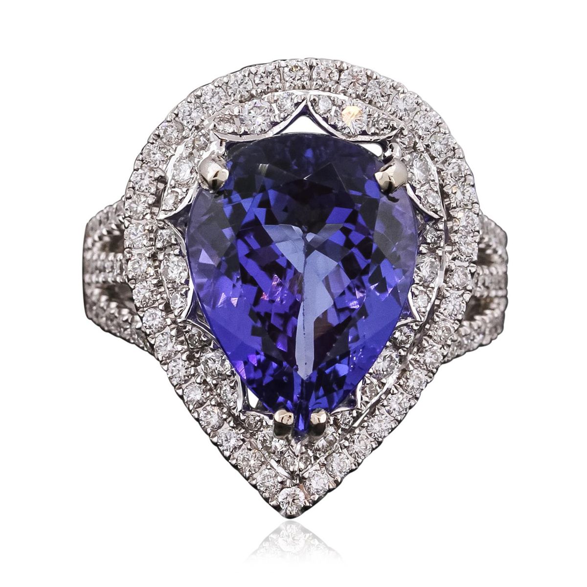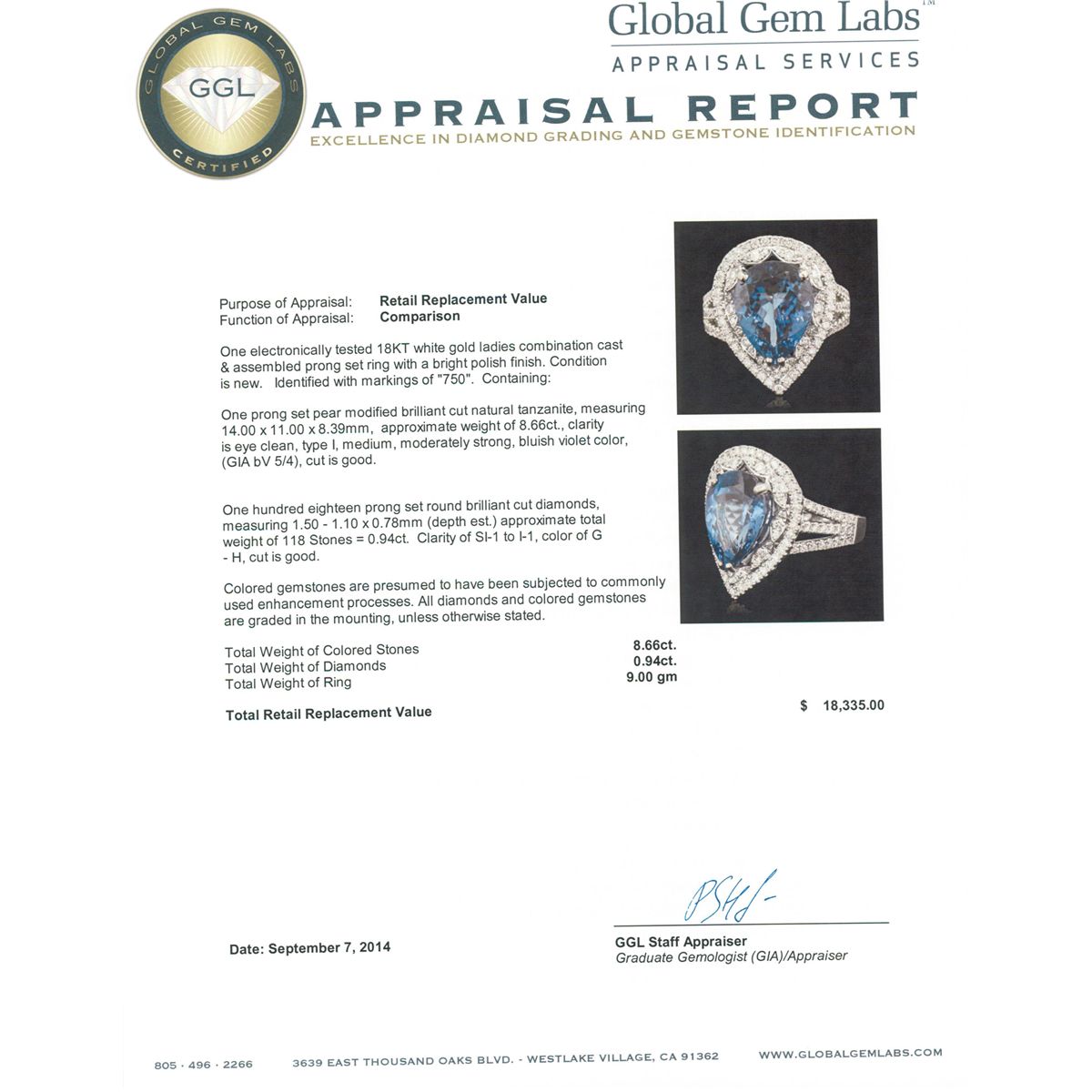 One electronically tested 18KT white gold ladies combination cast & assembled prong set ring with a bright polish finish. Identified with markings of "750". Condition is new. Containing: One prong set pear modified brilliant cut natural tanzanite, measuring 14.00 x 11.00 x 8.39mm, approximate weight of 8.66ct., clarity is eye clean, type I, medium, moderately strong, bluish violet color, (GIA bV 5/4), cut is good. One Hundred Eighteen prong set round brilliant cut diamonds, measuring 1.50 - 1.10 x 0.78mm (depth est.) approximate total weight of 118 Stones = 0.94ct. Clarity: SI-1 to I-1. Color: G - H, Cut is Good. Colored gemstones are presumed to have been subjected to commonly used enhancement processes. All diamonds and colored gemstones are graded in the mounting, unless otherwise stated. Total Weight of Colored Stones 8.66ct. Total Weight of Diamonds 0.94ct. Total Weight of Ring 9.00 grams. GGL Appraised at $18,335.00.