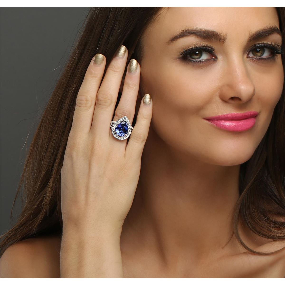 One electronically tested 18KT white gold ladies combination cast & assembled prong set ring with a bright polish finish. Identified with markings of "750". Condition is new. Containing: One prong set pear modified brilliant cut natural tanzanite, measuring 14.00 x 11.00 x 8.39mm, approximate weight of 8.66ct., clarity is eye clean, type I, medium, moderately strong, bluish violet color, (GIA bV 5/4), cut is good. One Hundred Eighteen prong set round brilliant cut diamonds, measuring 1.50 - 1.10 x 0.78mm (depth est.) approximate total weight of 118 Stones = 0.94ct. Clarity: SI-1 to I-1. Color: G - H, Cut is Good. Colored gemstones are presumed to have been subjected to commonly used enhancement processes. All diamonds and colored gemstones are graded in the mounting, unless otherwise stated. Total Weight of Colored Stones 8.66ct. Total Weight of Diamonds 0.94ct. Total Weight of Ring 9.00 grams. GGL Appraised at $18,335.00.