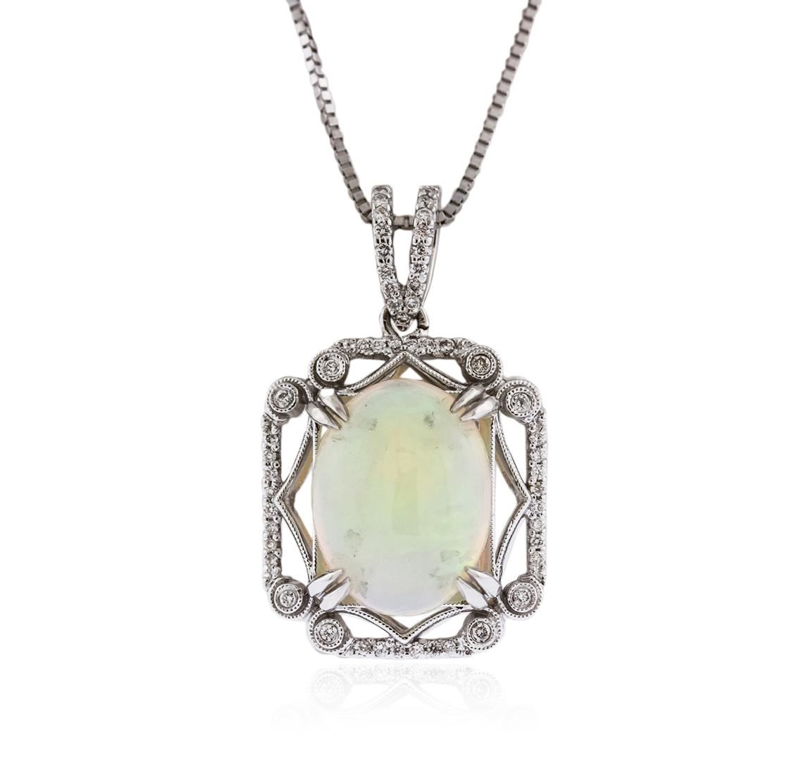 One electronically tested 18KT white gold ladies combination cast & assembled opal and diamond pendant & chain 16.0" long, thin square box link with a lobster claw clasp with a bright polish finish. Identified with markings of "18K 750". Condition is new. Containing: One crystal opal that is cut in a cabochon shaped cabochon and is prong set, measuring 15.04 mm long x 11.41 mm wide, and 8.23 mm thick and the approximate weight is 8.80 carats. The opal has a bright, green-orange play of color (fire) in a flashfire pattern; a high dome; a cut; no inclusions; consistent in its brightness and pattern; and is somewhat directional. Fifty-Five prong set round brilliant cut diamonds, measuring 1.00 - 1.00 x 0.60mm (depth est.) approximate total weight of 55 Stones = 0.20ct. Clarity: SI-2. Color: H - I, Cut is Good. All diamonds and colored gemstones are graded in the mounting, unless otherwise stated. Colored gemstones are presumed to have been subjected to commonly used enhancement processes. Total Weight of Diamonds 0.20ct. Total Weight of Opals 8.80ct. Total Weight of Pendant & Chain 10.50 grams. GGL Appraised at $5,060.00.