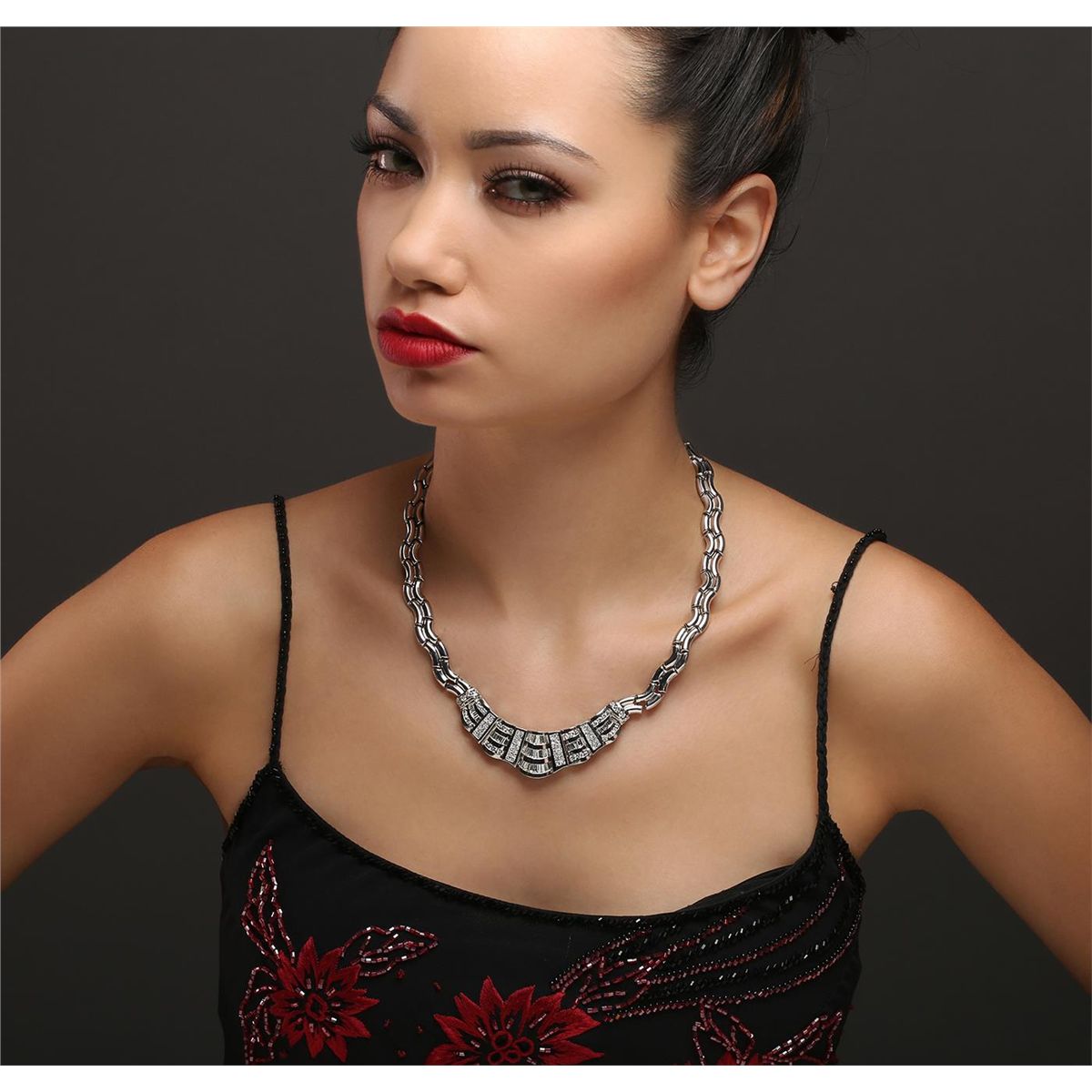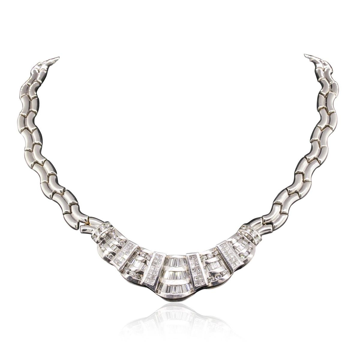 One electronically tested 18KT white gold Ladies combination cast & assembled necklace with a hidden box clasp with a bright polish finish. Condition is new. Measurements: 14" in length. Identified with markings of "750". Containing: Forty channel set baguette cut (tapered) diamonds, measuring from 2.00 x 1.50 x 1.28mm (depth est.) to 3.70 x 2.20 x 1.87mm (depth est.) approximate. Total Weight of 40 Stones = 3.04ct. Clarity: VS-2. Color: J, Cut is Good. Thirty-Six channel set round brilliant cut diamonds, measuring 3.30 - 2.50 x 1.74mm (depth est.) approximate. Total Weight of 36 Stones = 3.21ct. Clarity: VS-2 to SI-2. Color: I - J, Cut is Good. Fifty-Two invisible set princess cut diamonds, measuring 2.00 x 2.00 x 1.50mm (depth est.) approximate. Total Weight of 52 Stones = 2.56ct. Clarity: SI-1 to SI-2. Color: I - J, Cut is Good. Total Weight of Diamonds 8.81ct. Total Weight of Necklace 96.50 grams. GGL Appraised at $58,115.00.