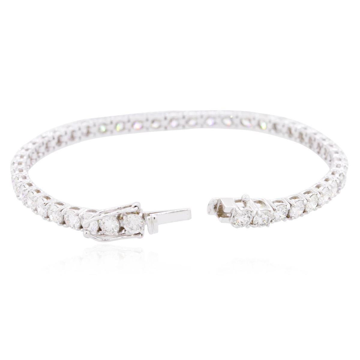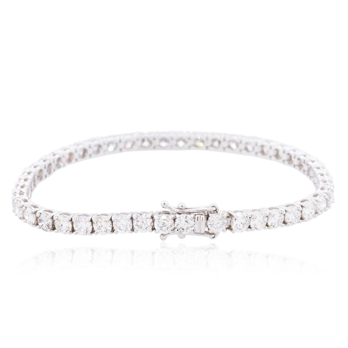 One electronically tested 18KT white gold ladies cast diamond tennis bracelet with a hidden box clasp with a bright polish finish. Measurements: 7" in length. Identified with markings of "750". Condition is new. Containing: Forty-Five prong set round brilliant cut diamonds, measuring 3.80 - 3.80 x 2.28mm (depth est.) approximate total weight of 45 Stones = 9.04ct. Clarity: SI-2 to I-1. Color: I - J, Cut is Good. All diamonds are graded in the mounting, unless otherwise stated. Total Weight of Diamonds 9.04ct. Total Weight of Tennis Bracelet 13.60 grams. GGL Appraised at $30,865.00.