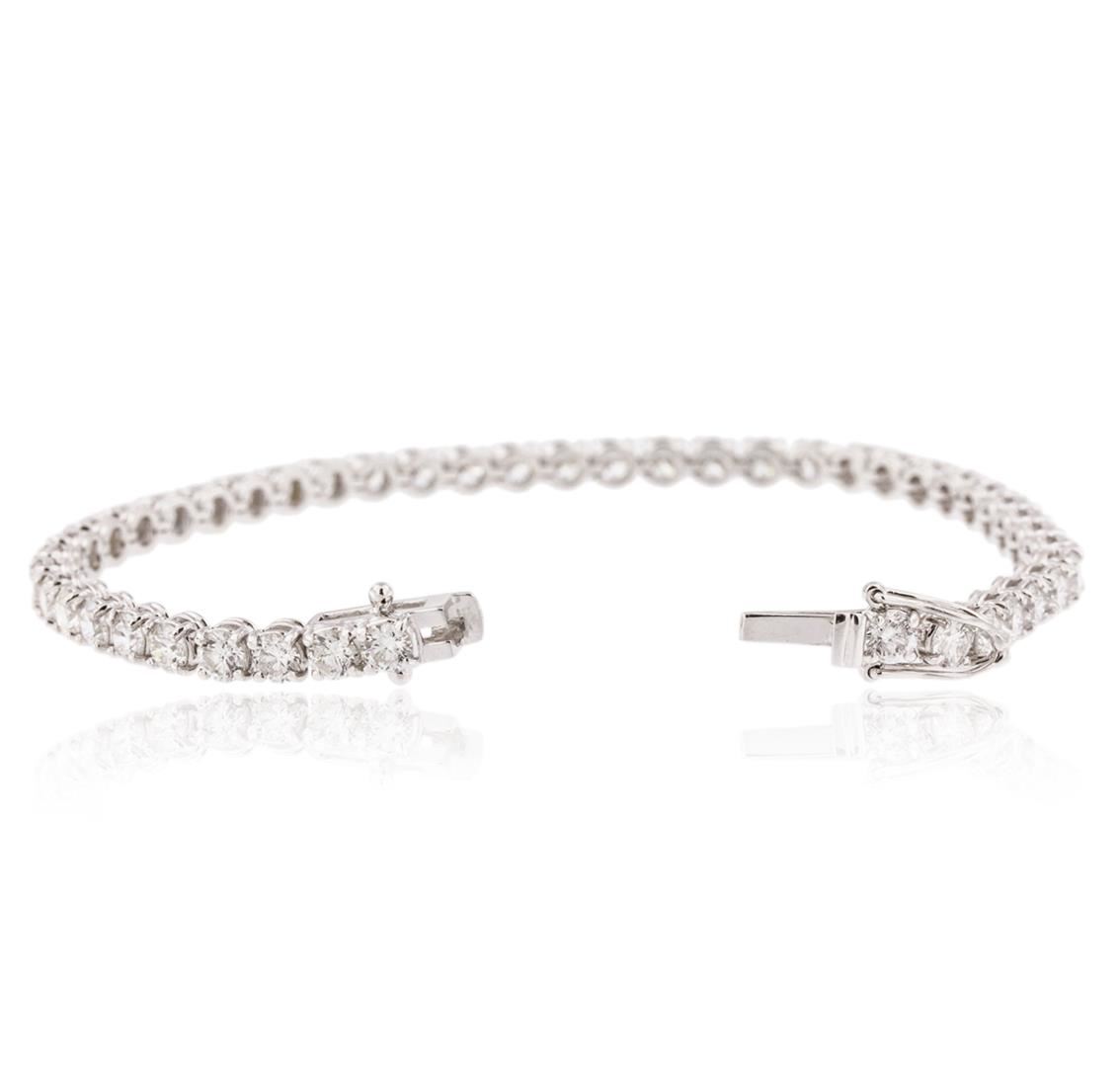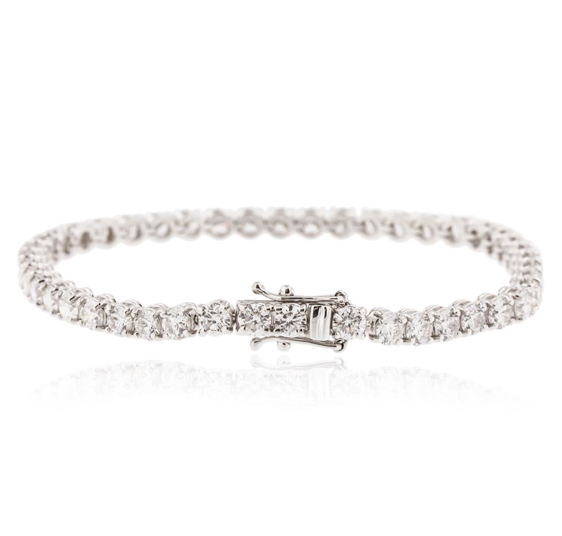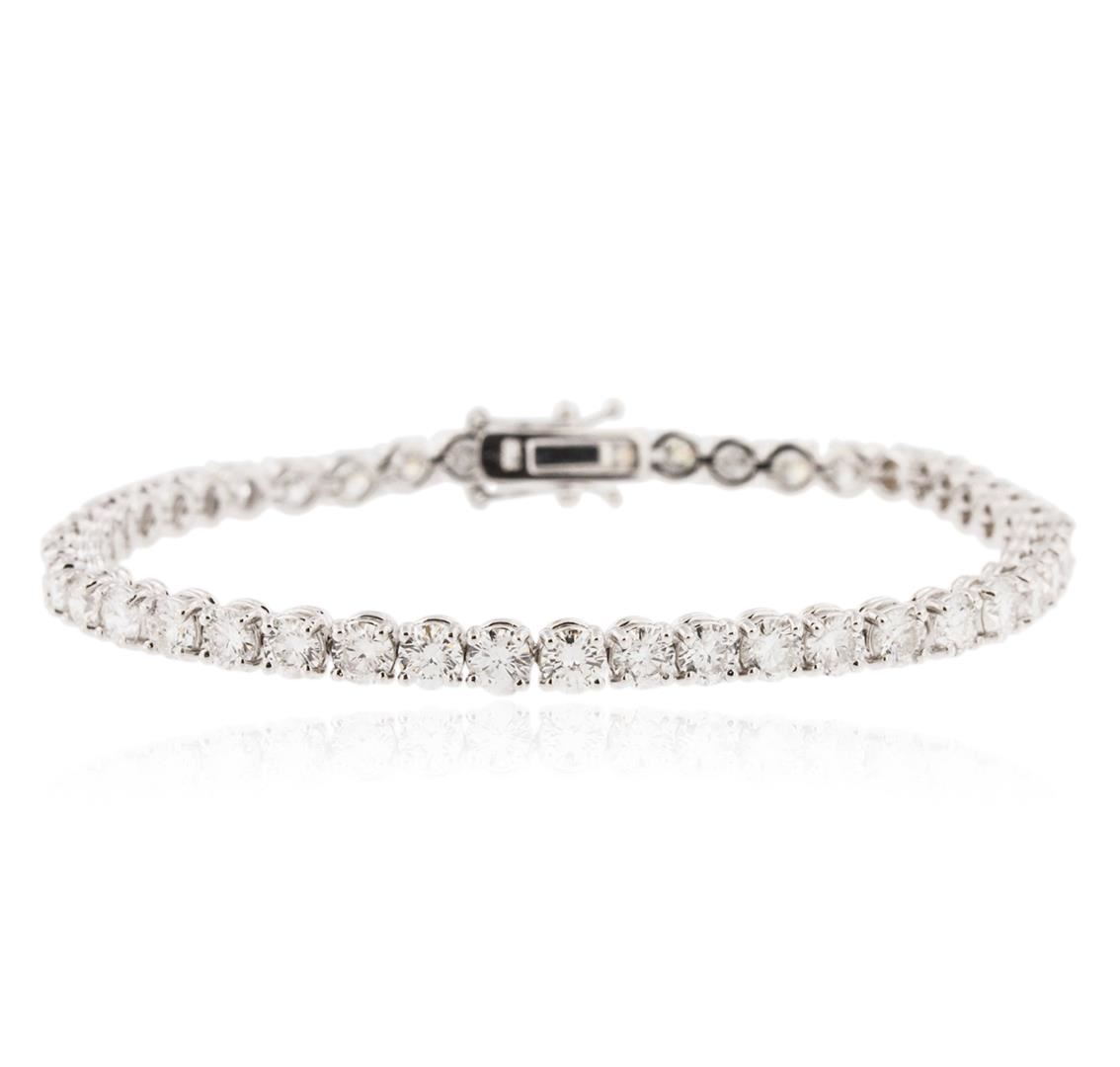 One electronically tested 18KT white gold ladies cast diamond tennis bracelet with a hidden box clasp with safety closer with a bright polish finish. Measurements: 7" in length Identified with markings of "750". Condition is new. Containing: Forty-Five prong set round brilliant cut diamonds, measuring 3.80 - 3.80 x 2.28mm (depth est.) approximate total weight of 45 Stones = 9.04ct. Clarity: SI-1 to I-1. Color: G - I, Cut is Good. All diamonds are graded in the mounting, unless otherwise stated. Total Weight of Diamonds 9.04ct. Total Weight of Tennis Bracelet 15.50 grams. GGL Appraised at $26,625.00.