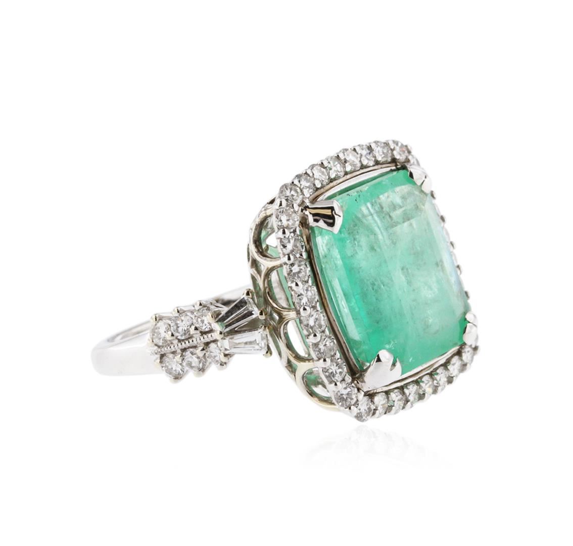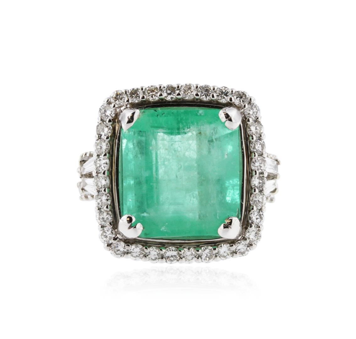One ring featuring: 18KT white gold weighing 7.65 grams containing one emerald weighing 9.14ct and diamonds weighing a total of 1.30ct.