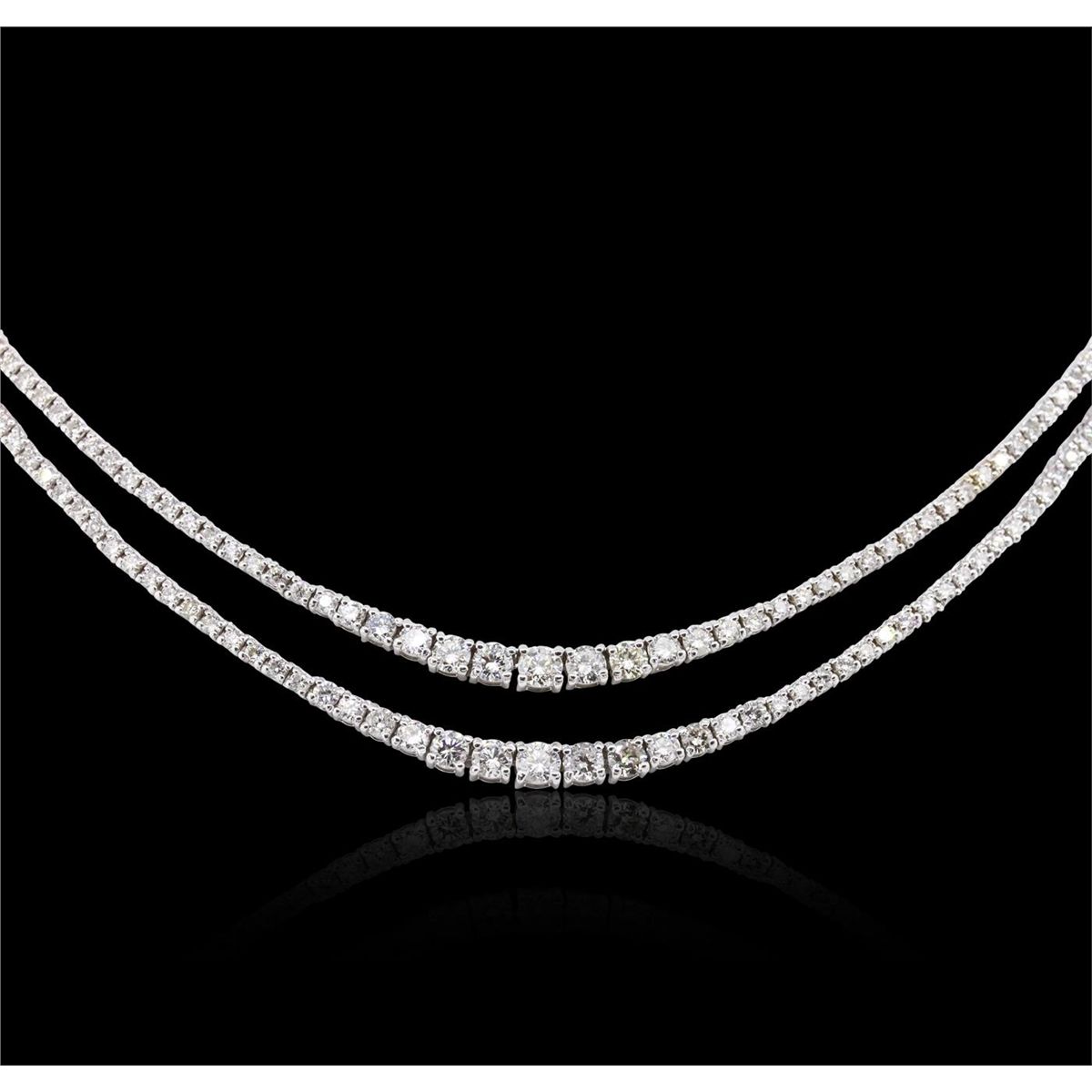 One polished, stamped, and electronically tested solid 18KT white gold necklace mounted with: 6 genuine emeralds weighing 9.22cts, and 122 genuine round diamonds weighing 5.40cts. The necklace measures 16.50 inches in length and is finished with a tension lock clasp and safety clasp. This item weighs 24.40 grams, condition is new, excellent workmanship. AIGL Appraised at $42,000.00.