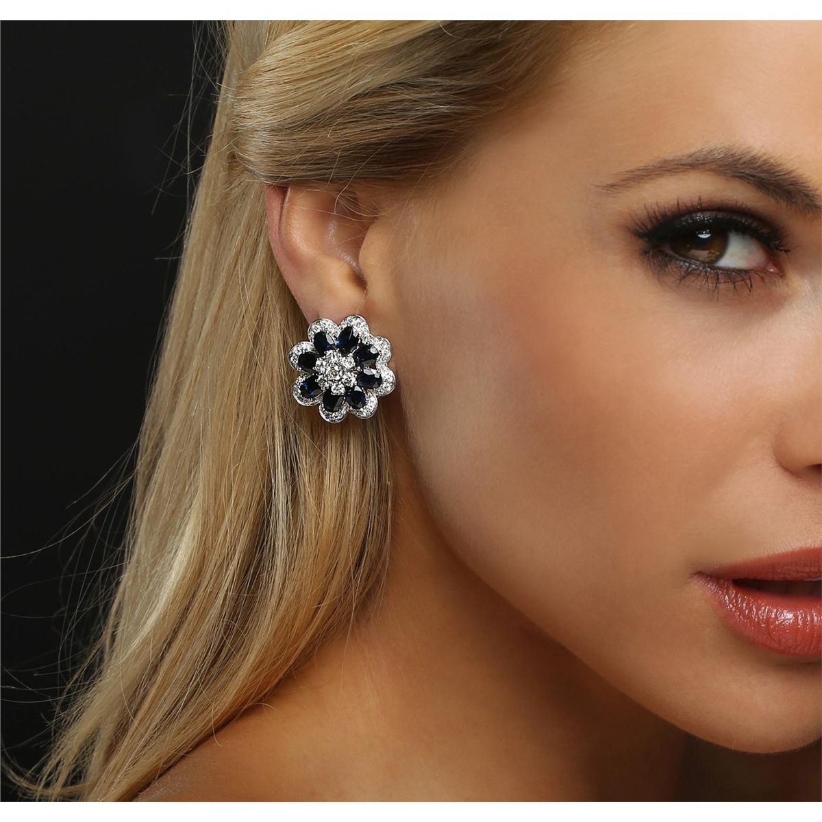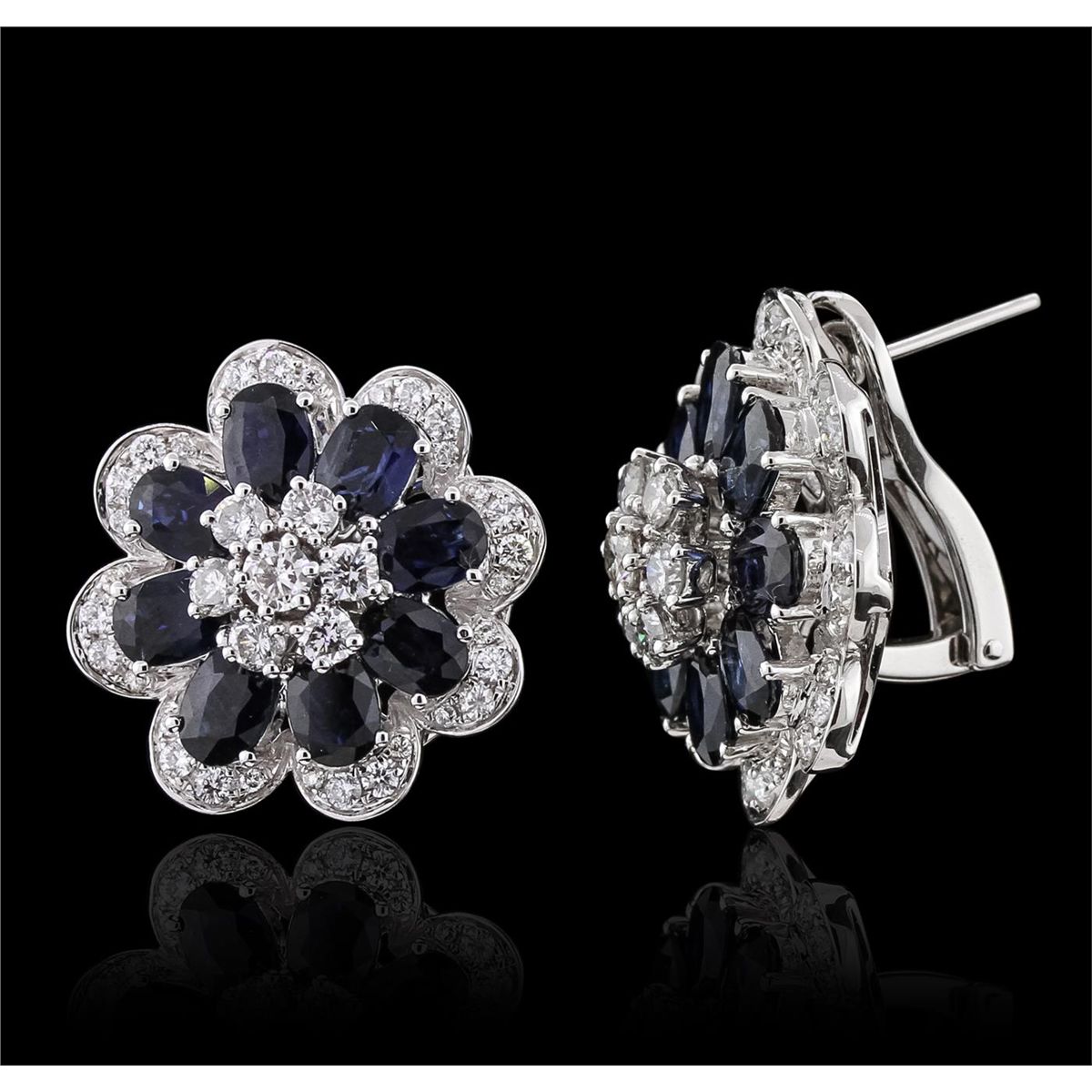 One pair electronically tested 18KT white gold ladies cast & assembled sapphire and diamond flower earrings with omega backs. Bright polish finish. Trademark is AKMS. Identified with markings of "18K". Condition is new, good workmanship. Containing: Sixteen prong set oval mixed cut natural blue sapphires, measuring 6.00 x 4.00 x 2.60mm, 12%. bulge factor, approximate total weight of 9.26ct., clarity is slightly included, type II, dark, very slightly grayish, blue color, (GIA B 7/3), cut is good. Transmitting light with a minimum of distortion, transparent. Naturally occurring internal & external characteristics are present. Measurements & the color grade are an average for the group. Graded in the setting. Seventy-Eight prong set round brilliant cut diamonds approximate total weight of 78 Stones = 2.26ct. Graded in the setting. Clarity: VS-1 to SI-1. Color: G - I. Total Weight of Colored Stones 9.26ct. Total Weight of Diamonds 2.26ct. Total Weight of Earrings 18.99 grams. AIG Appraised at $20,435.00.