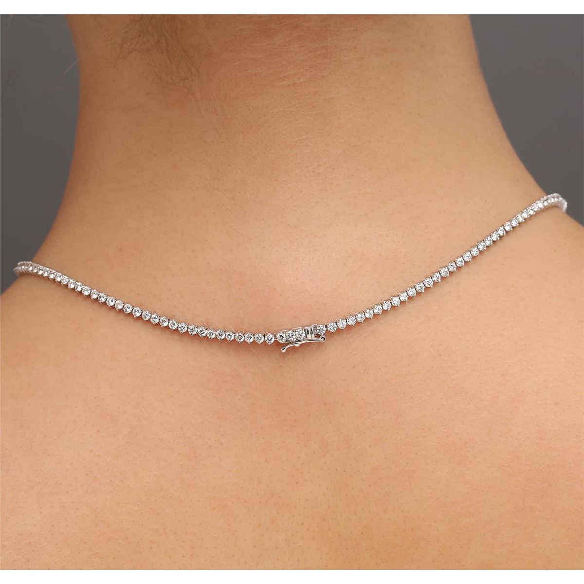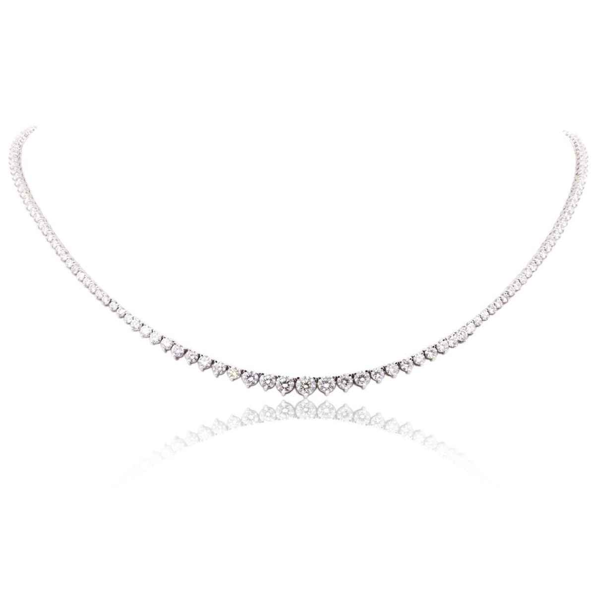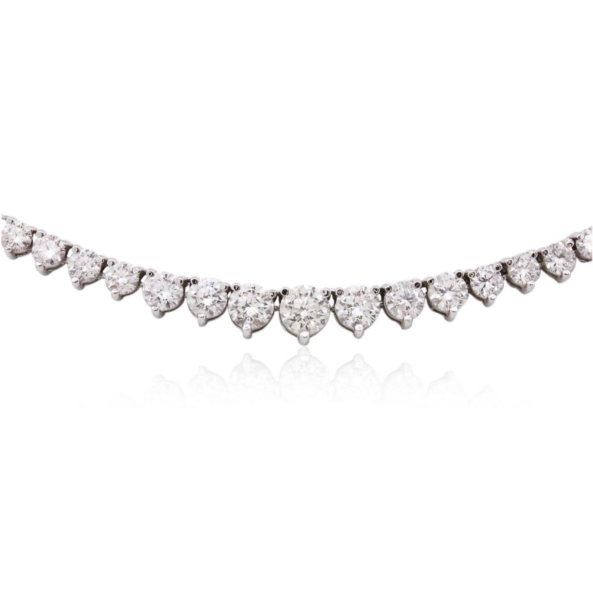 One electronically tested 18KT white gold ladies cast diamond necklace with a hidden box clasp with a bright polish finish. Measurements: 16.5" in length. Identified with markings of "750". Condition is new. Containing: Four prong set round brilliant cut diamonds, measuring 4.50 - 3.50 x 2.40mm (depth est.) approximate total weight of 4 Stones = 0.94ct. Clarity: I-1 to I-2. Color: J - K, Cut is Good. One Hundred Sixty-Six prong set round brilliant cut diamonds, measuring 2.90 - 1.90 x 1.44mm (depth est.) approximate total weight of 166 Stones = 8.40ct. Clarity: SI-2 to I-1. Color: J - K, Cut is Good. All diamonds are graded in the mounting, unless otherwise stated. Total Weight of Diamonds 9.34ct. Total Weight of Necklace 15.60 grams. GGL Appraised at $22,295.00.