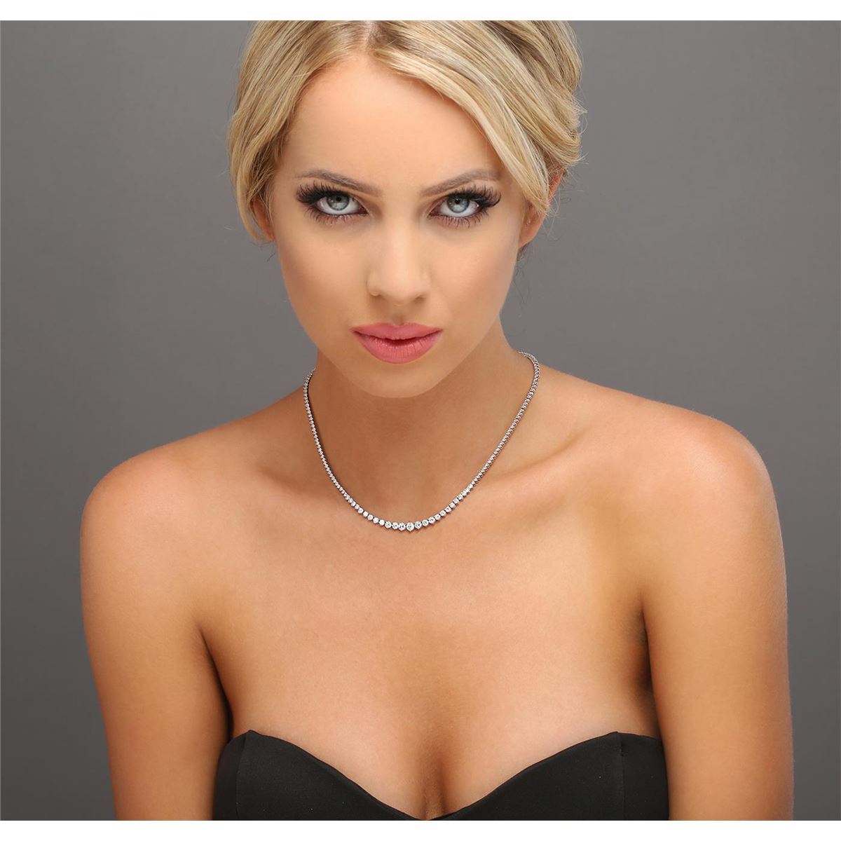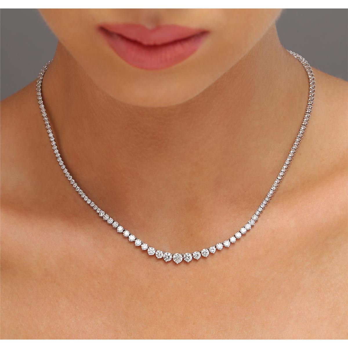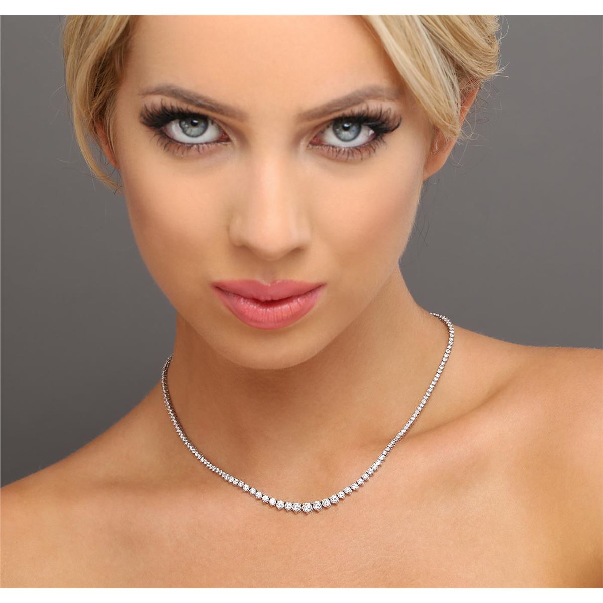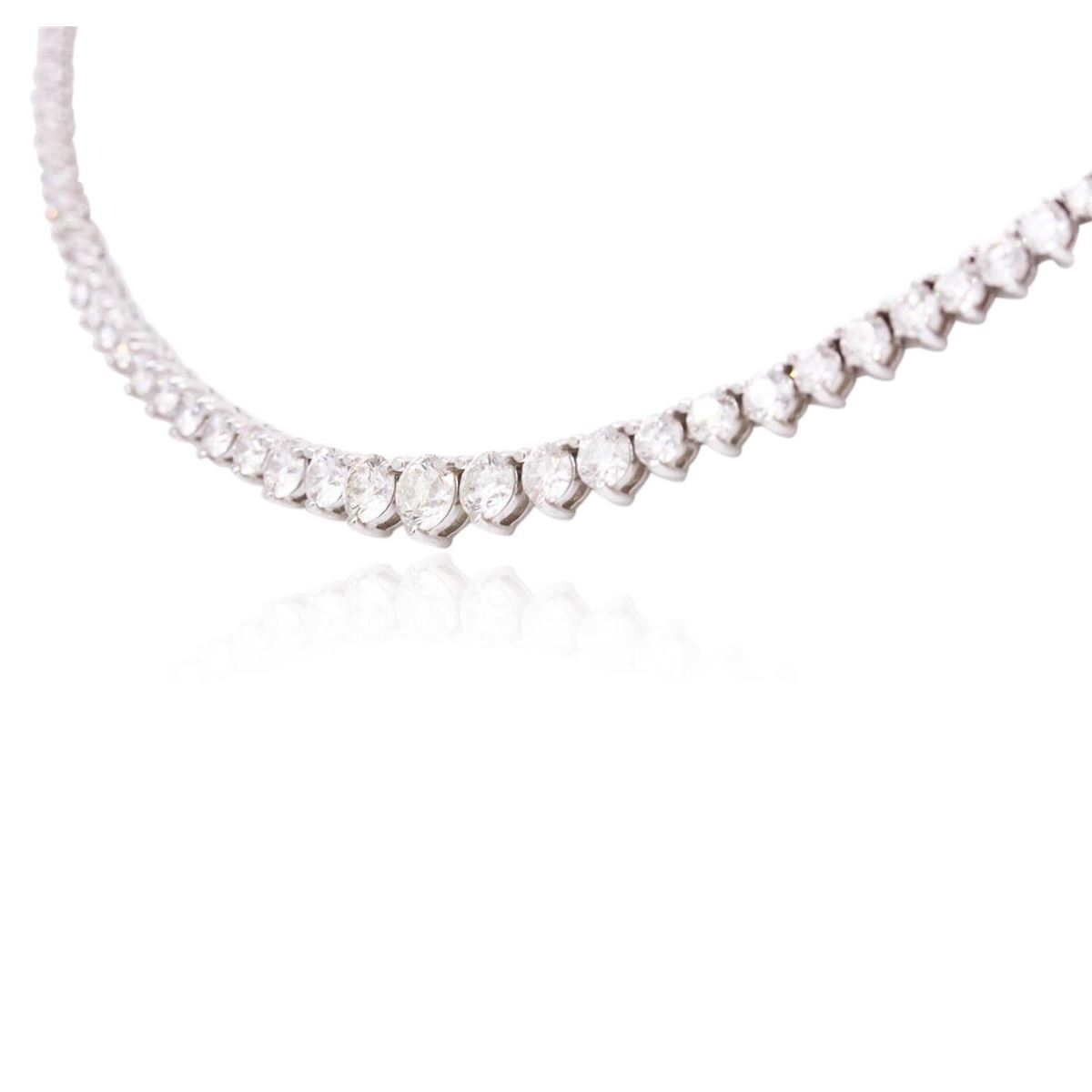 One electronically tested 18KT white gold ladies cast diamond necklace with a hidden box clasp with a bright polish finish. Measurements: 16.5" in length. Identified with markings of "750". Condition is new. Containing: Four prong set round brilliant cut diamonds, measuring 4.50 - 3.50 x 2.40mm (depth est.) approximate total weight of 4 Stones = 0.94ct. Clarity: I-1 to I-2. Color: J - K, Cut is Good. One Hundred Sixty-Six prong set round brilliant cut diamonds, measuring 2.90 - 1.90 x 1.44mm (depth est.) approximate total weight of 166 Stones = 8.40ct. Clarity: SI-2 to I-1. Color: J - K, Cut is Good. All diamonds are graded in the mounting, unless otherwise stated. Total Weight of Diamonds 9.34ct. Total Weight of Necklace 15.60 grams. GGL Appraised at $22,295.00.