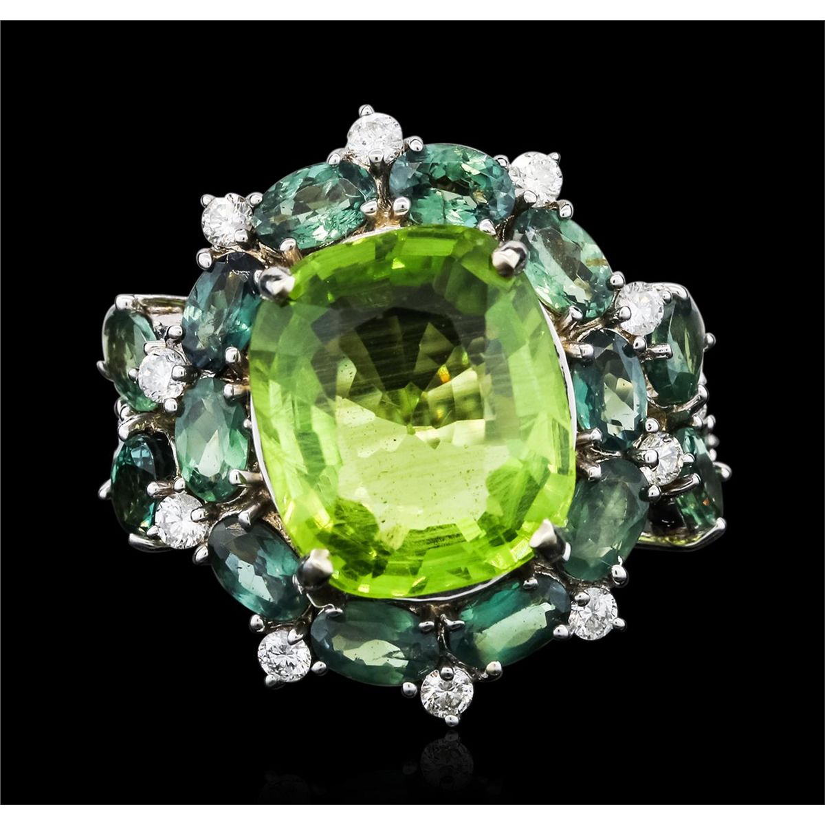 One electronically tested 18KT white gold ladies cast multi gemstone and diamond ring with a bright polish finish. The featured peridot is set within a stylized green chrysoberyl and diamond bezel supported by green chrysoberyl and diamond set shoulders, completed by a two and one-half millimeter wide band. Identified with markings of "18K". Condition is new, good workmanship. Containing: One prong set rectangular cushion mixed cut natural peridot, measuring 14.00 x 11.70 x 7.00mm, 6%. bulge factor, approximate weight of 9.54ct., clarity is slightly included, type II, medium dark, very slightly grayish, yellowish green color, (GIA yG 6/3), cut is good. Transmitting light with a minimum of distortion, transparent. Naturally occurring internal & external characteristics are present. Colored Stone Grading Report attached. Refractive index testing results of 1.65 to 1.69. This is a conclusive result for peridot. Graded in the setting. Sixteen prong set oval mixed cut natural green chrysoberyls, measuring 5.00 x 3.50 x 2.28mm, 6%. bulge factor, approximate total weight of 5.28ct., clarity is slightly included, medium dark, very slightly grayish, very slightly bluish green color, (GIA vslbG 6/3), cut is good. Transmitting light with a minimum of distortion, transparent. Naturally occurring internal & external characteristics are present. Measurements & the color grade are an average for the group. Graded in the setting. Twelve prong set round brilliant cut diamonds, measuring 2.20 - 2.20 x 1.32mm (depth est.) approximate total weight of 12 Stones = 0.56ct. Graded in the setting. Clarity: SI-1 to I-1. Color: G - I. Total Weight of Colored Stones 14.82ct. Total Weight of Diamonds 0.56ct. Total Weight of Ring 13.15 grams. AIG Appraised at $12,165.00.