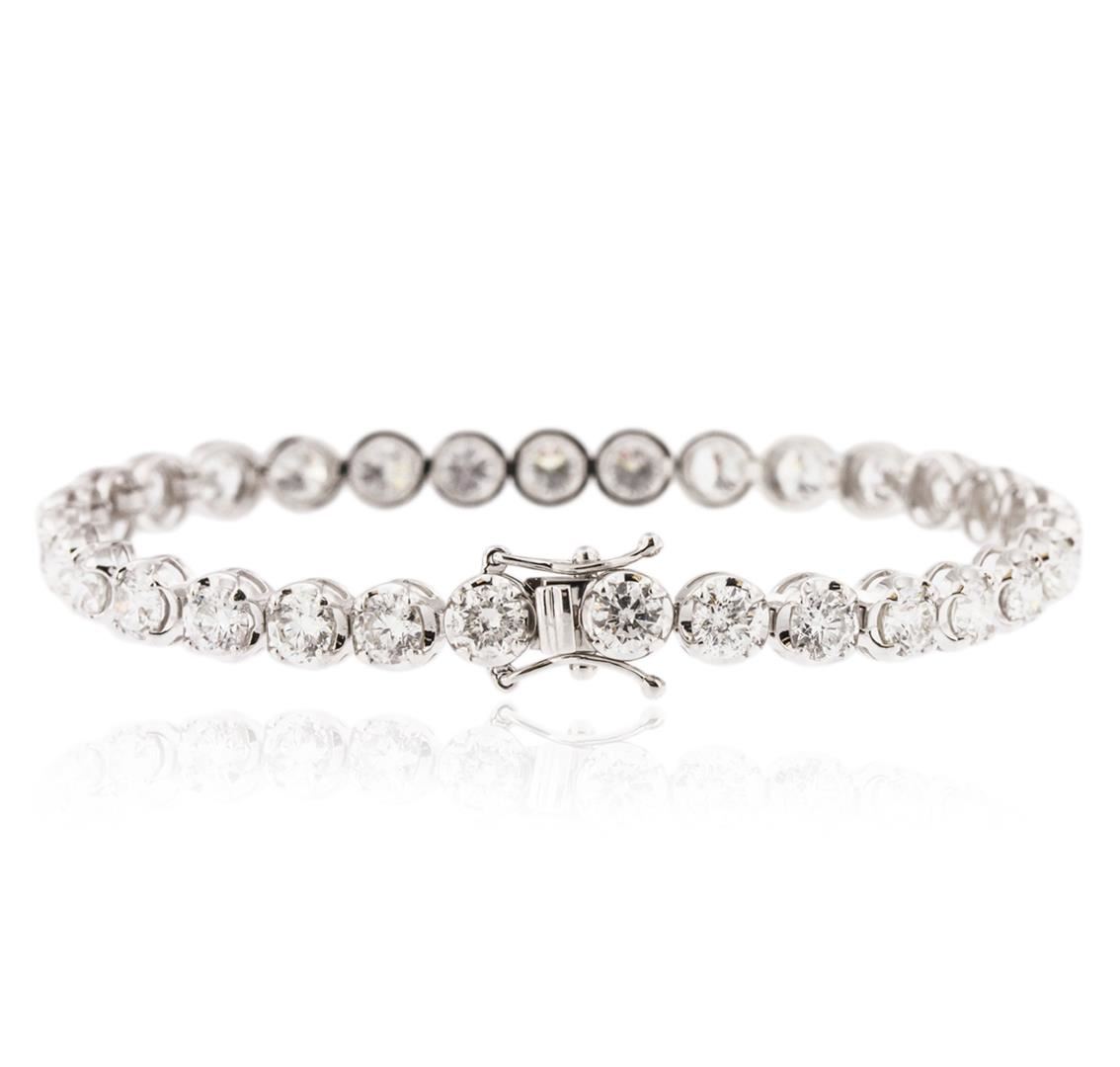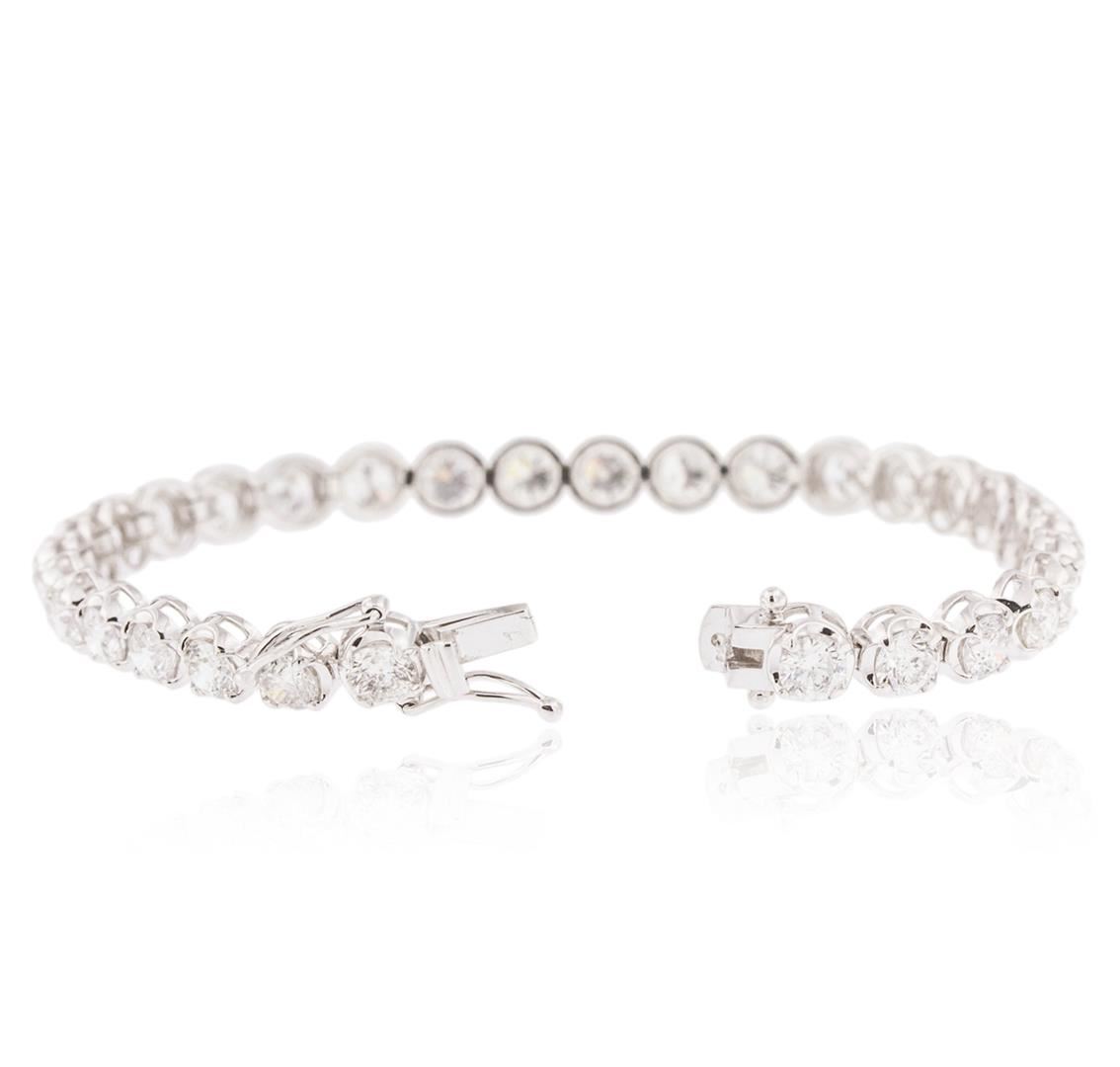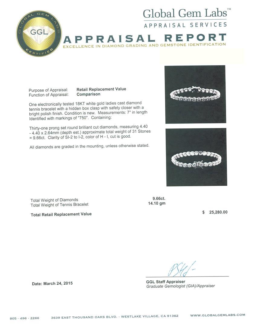One electronically tested 18KT white gold ladies cast diamond tennis bracelet with a hidden box clasp with safety closer with a bright polish finish. Measurements: 7" in length Identified with markings of "750". Condition is new. Containing: Thirty-One prong set round brilliant cut diamonds, measuring 4.40 - 4.40 x 2.64mm (depth est.) approximate total weight of 31 Stones = 9.66ct. Clarity: SI-2 to I-2. Color: H - I, Cut is Good. All diamonds are graded in the mounting, unless otherwise stated. Total Weight of Diamonds 9.66ct. Total Weight of Tennis Bracelet 14.10 grams. GGL Appraised at $25,280.00.