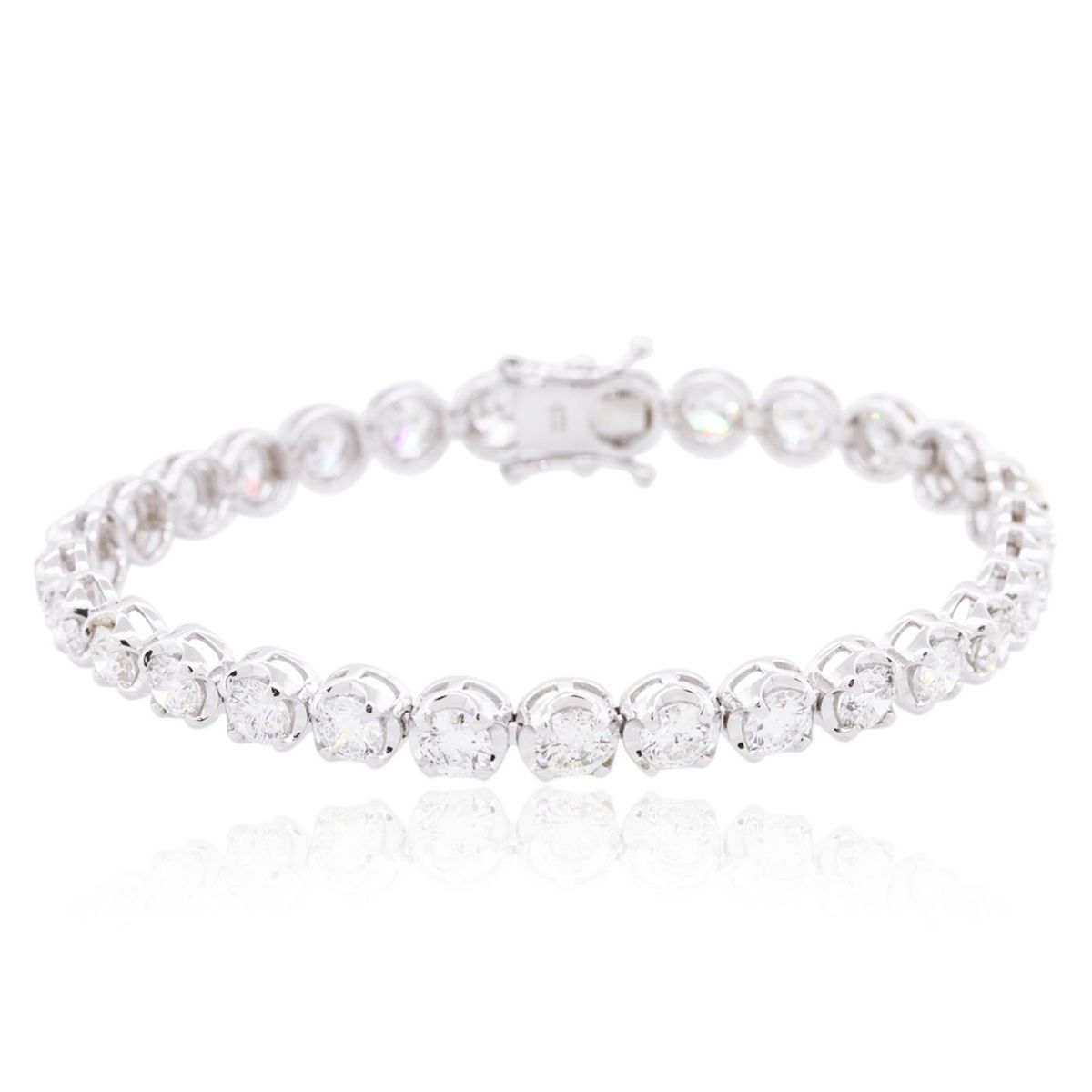 One electronically tested 18KT white gold ladies cast diamond tennis bracelet with a hidden box clasp with a bright polish finish. Measurements: 7" in length. Identified with markings of "750". Condition is new. Containing: Twenty-Nine prong set round brilliant cut diamonds, measuring 4.50 - 4.50 x 2.70mm (depth est.) approximate total weight of 29 Stones = 9.67ct. Clarity: SI-2 to I-1. Color: I - J, Cut is Good. All diamonds are graded in the mounting, unless otherwise stated. Total Weight of Diamonds 9.67ct. Total Weight of Tennis Bracelet 16.40 grams. GGL Appraised at $28,925.00.