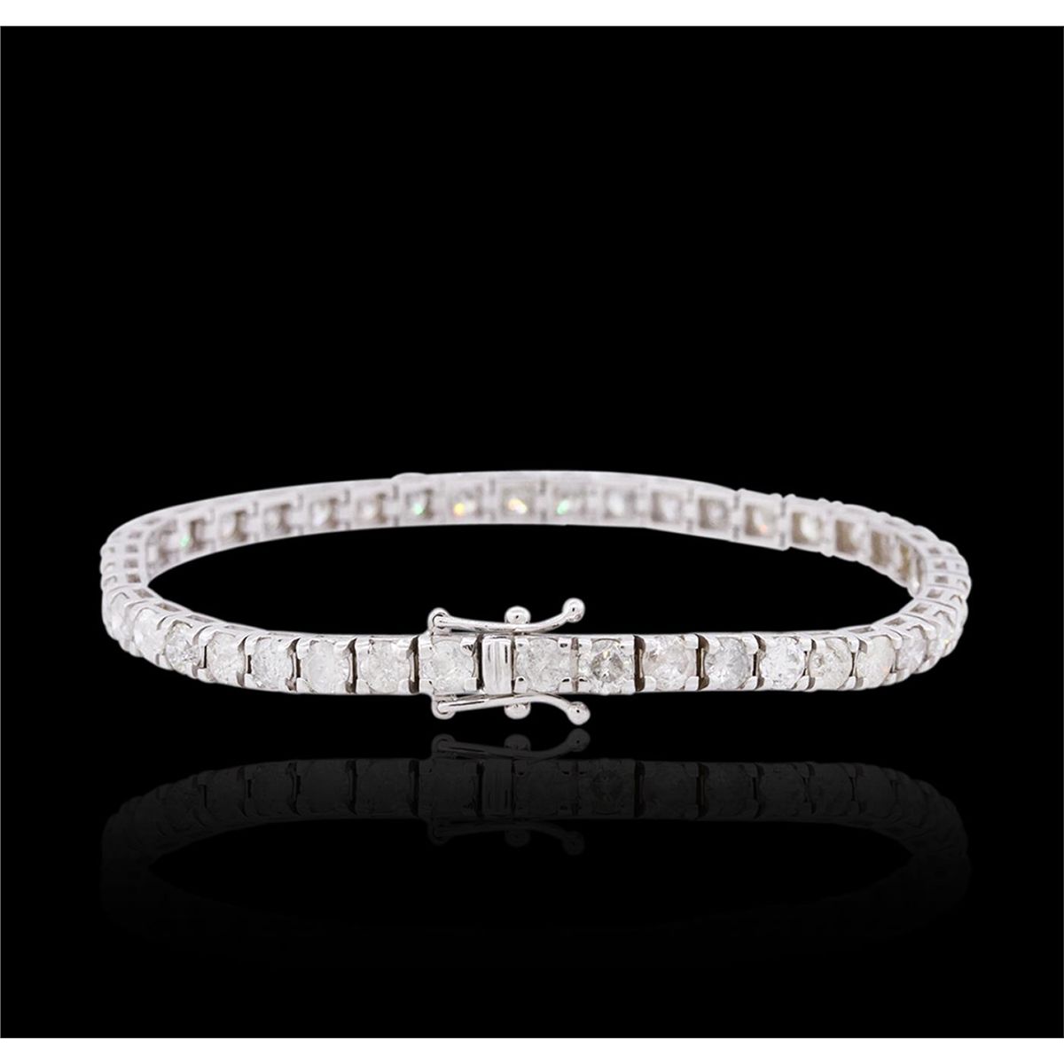 One electronically tested 18KT white gold ladies cast & assembled diamond tennis bracelet with a bright polish finish. Seven and one-quarter inch length bracelet composed of a flexible ribbon of diamonds, terminating in a concealed clasp with twin safeties. Identified with markings of "K18". Condition is new, good workmanship. Tennis bracelets & necklaces got their unusual name from an incident involving the U.S. professional tennis player Chris Evert during a tennis match in the 1980's. Evert had been wearing an expensive diamond bracelet, an inline string of individually-set diamonds. Previously these bracelets were known as eternity bracelets. When the clasp snapped during play, she asked the officials to stop the tennis match until the bracelet could be found. Since that day, bracelets and necklaces featuring an inline string of diamonds have been called tennis bracelets and tennis necklaces. Containing: Forty-Three prong set round brilliant cut diamonds, measuring 4.00 - 3.90 x 2.40mm (depth est.) approximate total weight of 43 Stones = 9.92ct. Graded in the setting. Clarity: I-2 to I-3. Color: I - K. Total Weight of Diamonds 9.92ct. Total Weight of Tennis Bracelet 15.78 grams. AIG Appraised at $23,520.00.