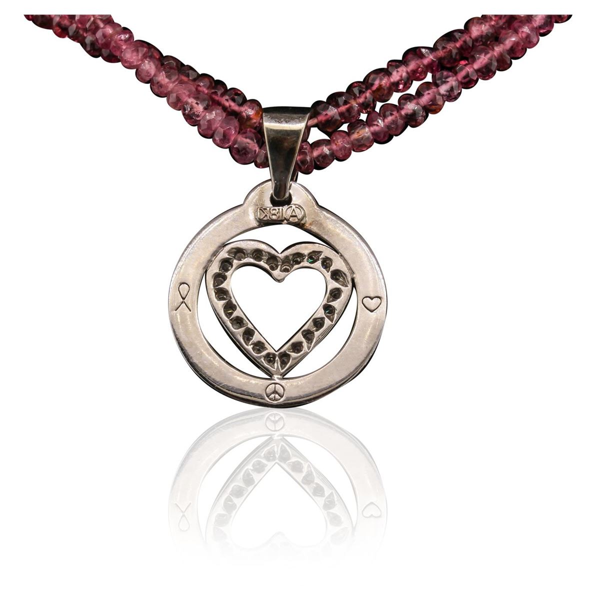 One pendant with chain featuring: 18KT White Gold, and Pave Set Round Diamond Heart Circle. Item weighs 24.50 grams.