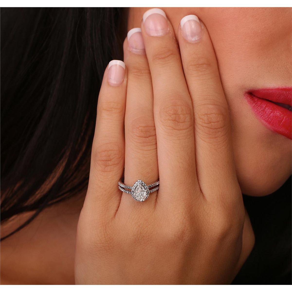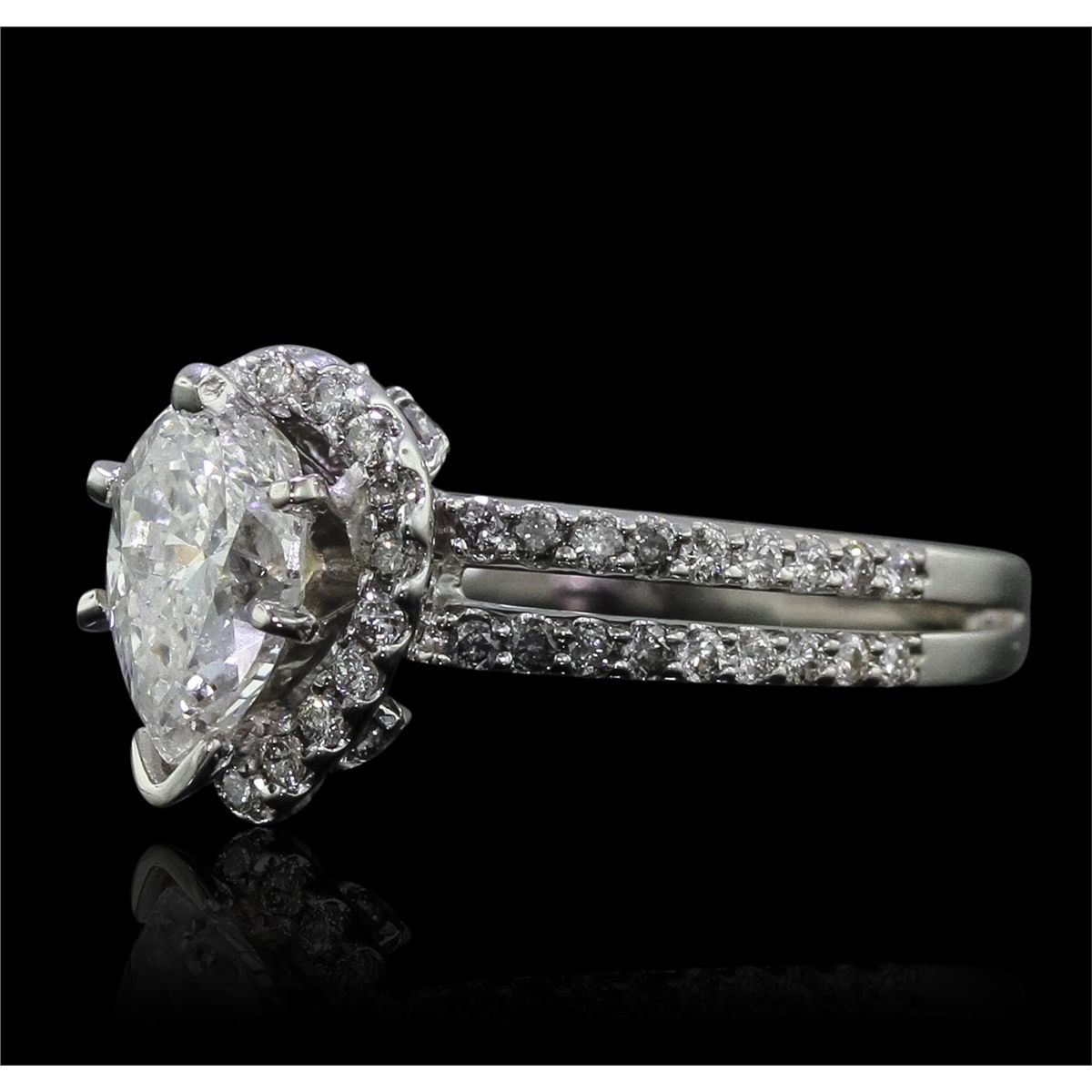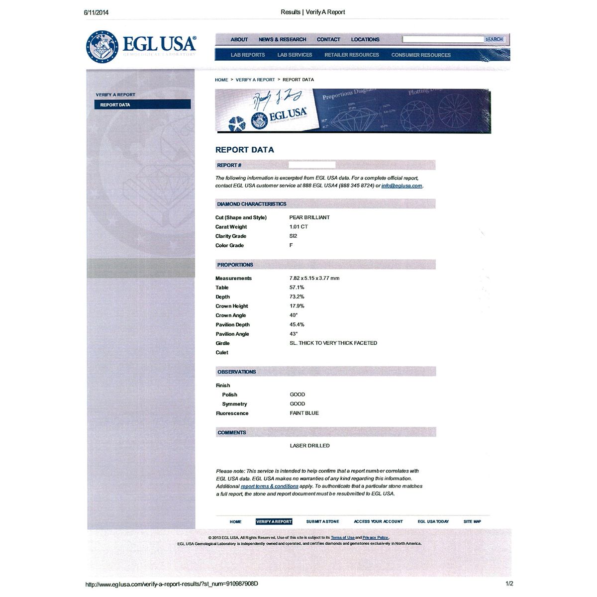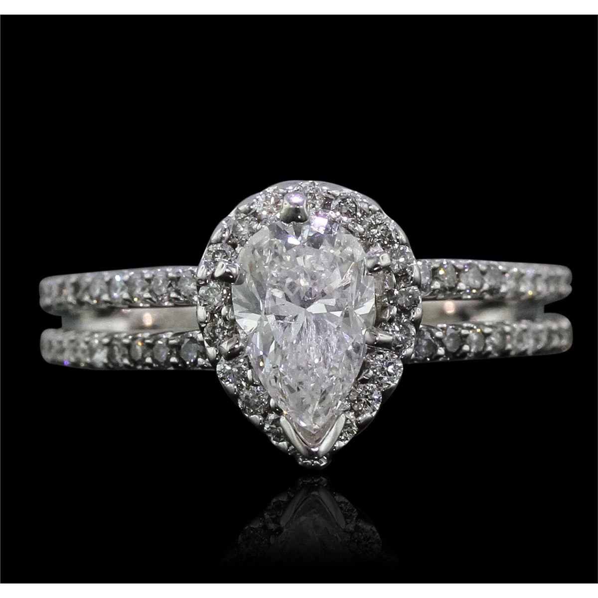 One electronically tested 18KT white gold ladies cast diamond ring with a bright polish finish. Condition is new, good workmanship. The featured diamond is set within a diamond bezel, supported by diamond set split shoulders and completed by a two and one-half millemeter wide band. Identified with markings of "18K". Containing: One prong set pear shaped cut diamond, measuring 7.82 x 5.15 x 3.77mm exact weight 1.01ct, laser drilled with a faint blue fluorescence. Graded loose prior to setting in the EGL Laboratory Report # US 910987908D. Clarity: SI-2. Color: FDepth 73.2%. Table 57.1%. Pavil. Depth%. 45.4%. Crown Angle 40.0 Degrees Five prong set round brilliant cut diamonds, measuring 1.80 - 1.70 x 1.05mm (depth est.) approximate. Total Weight of 5 Stones = 0.12ct. Graded in the setting. Clarity: SI-2 to I-1. Color: G - I Fifty-Four prong set round brilliant cut diamonds, measuring 1.20 - 1.10 x 0.69mm (depth est.) approximate. Total Weight of 54 Stones = 0.39ct. Graded in the setting. Clarity: SI-1 to I-1. Color: G - I. Total Weight of Diamonds 1.52ct. Total Weight of Ring 4.70 grams. AIGAppraised at $18,930.00.