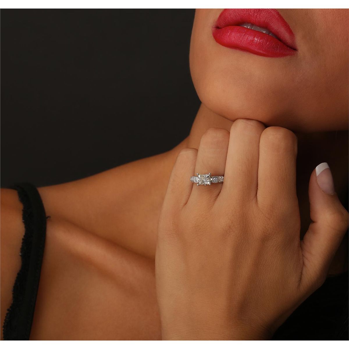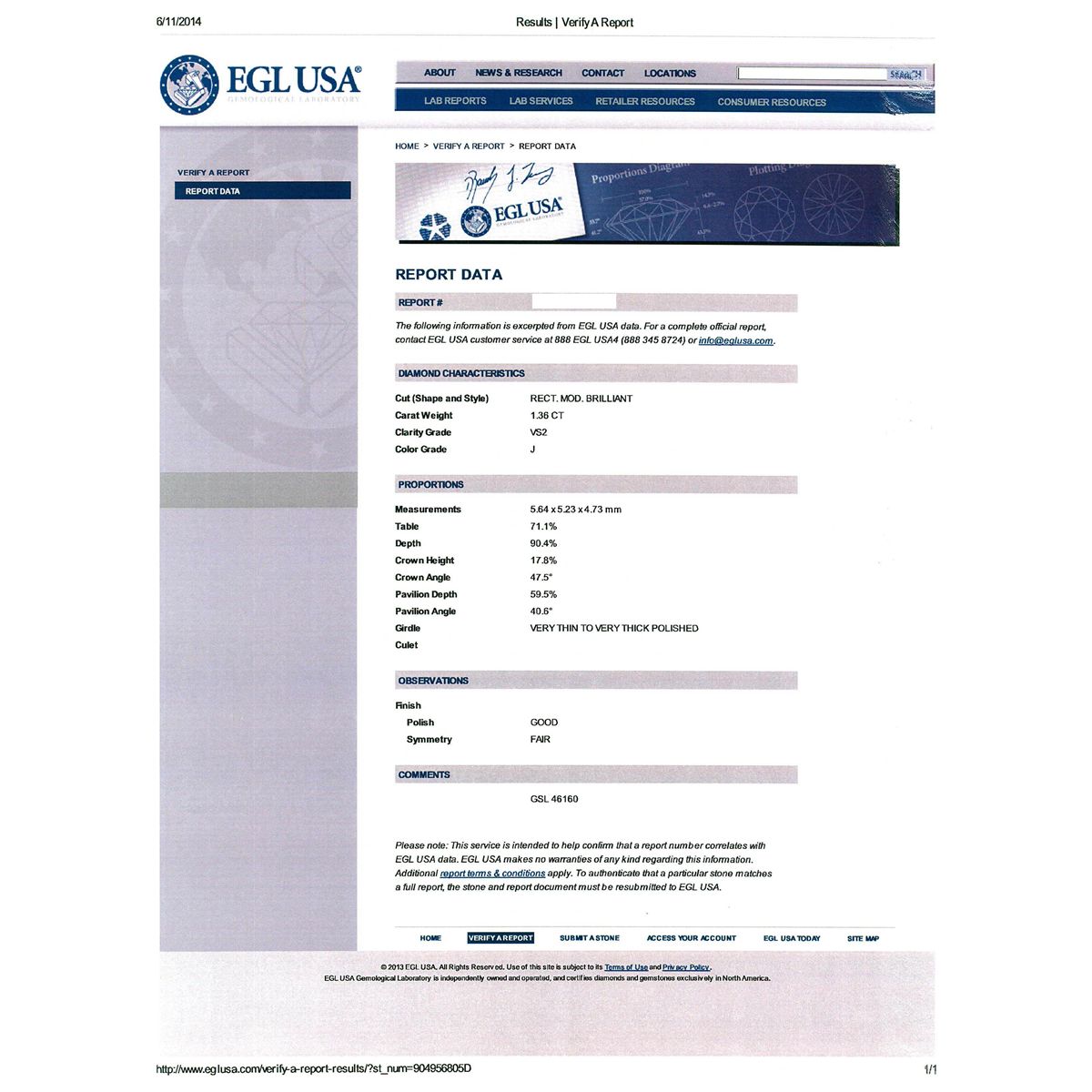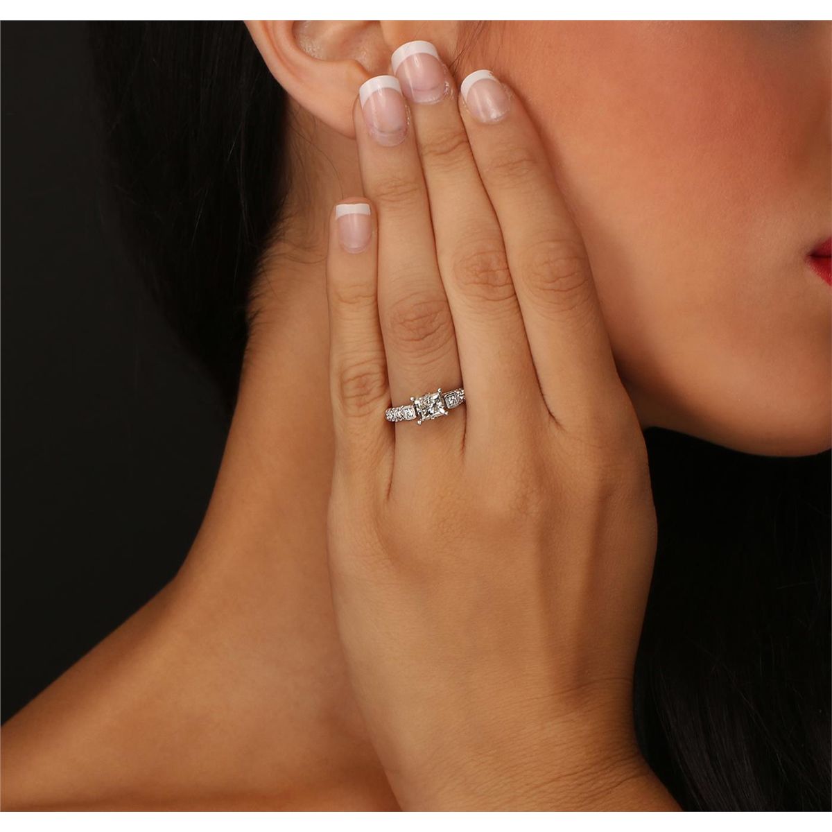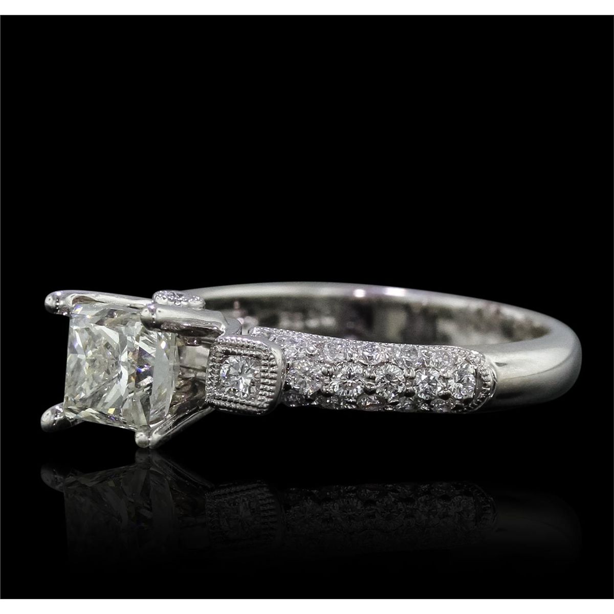 One electronically tested 18KT white gold ladies cast & assembled diamond unity ring. Condition is new, good workmanship. The featured diamond is supported by diamond set shoulders and completed by a three millimeter wide band. Bright polish finish with milgrain detailing. Identified with markings of "18K". Containing: One prong set princess cut diamond, measuring 5.64 x 5.23 x 4.73mm exact weight 1.36ct. Graded loose prior to setting in the EGL Laboratory Report # US 904956805D. Clarity: VS-2. Color: JDepth 90.4%. Table 71.1%. Pavil. Depth%. 59.5%. Crown Angle 47.5 Degrees Thirty-Eight bead & bezel set round brilliant cut diamonds, measuring 2.00 - 1.20 x 0.96mm (depth est.) approximate. Total Weight of 38 Stones = 0.55ct. Graded in the setting. Clarity: SI-1 to I-1. Color: G - I. Total Weight of Diamonds 1.91ct. Total Weight of Ring 5.00 grams. AIGAppraised at $23,850.00.