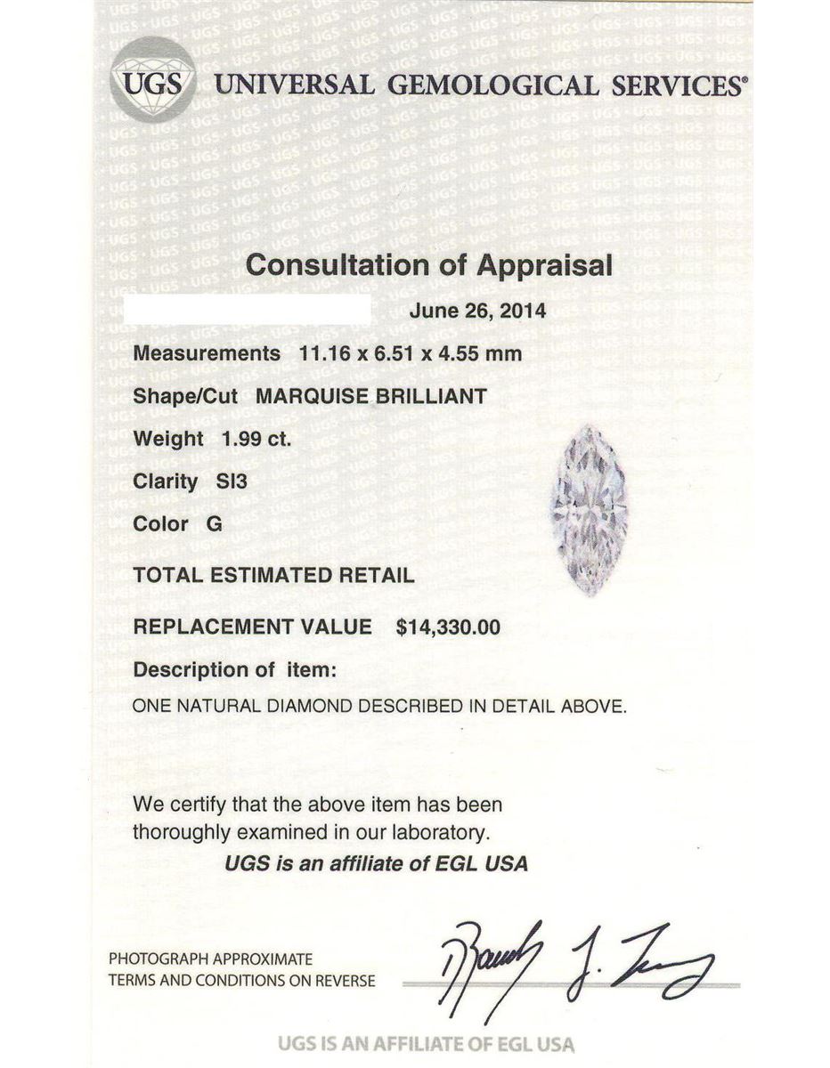 Not all Jewelry, watches or loose stones are appraised and the appraisals are provided for bidders only in certain instances at the discretion of Longfellow Auctions. Our appraisals are conducted by independent third-party appraisal firms. Such firms may be certified GIA Gemologists or have education in the industry or alternative certifications. Appraisals should be used for verification of gemstone and/or metal weight, size, and grade only, not actual value for resale or insurance purposes. Appraisal value should be not considered for actual value, as price varies greatly from retail locations and other merchants in different geographic locations. All Items auctioned by Longfellow Auctions should not be purchased with a view or expectation toward resale for appraisal price given, or to make a profit. The ultimate value for which an item can be resold may vary drastically from the appraisals listed by Longfellow Auctions.