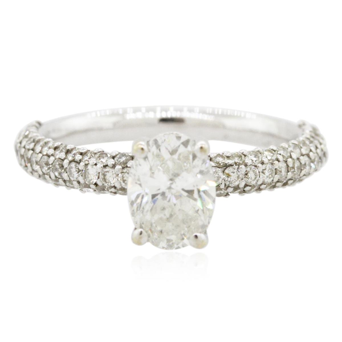One electronically tested 18KT white gold ladies cast diamond unity ring with a bright polish finish. The featured diamond is supported by diamond set shoulders, completed by a two and one-half millimeter wide band. Condition is new, good workmanship. Containing: One prong set oval shaped cut diamond, measuring 7.71 x 5.69 x 3.90mm exact weight 1.23ct. EGL Report attached. Graded loose prior to setting in the EGL Laboratory Report #US 907408710D. Clarity: SI-2. Color: G. Depth 68.5%. Table 60.0%. Pavil. Depth%. 44.6%. Eighty-Four prong set round brilliant cut diamonds, measuring 1.30 - 1.20 x 0.75mm (depth est.) approximate total weight of 84 Stones = 0.69ct. Graded in the setting. Clarity: VS-2 to SI-2. Color: G - I. Total Weight of Diamonds 1.92ct. Total Weight of Ring 3.59 grams. AIG Appraised at $17,320.00.