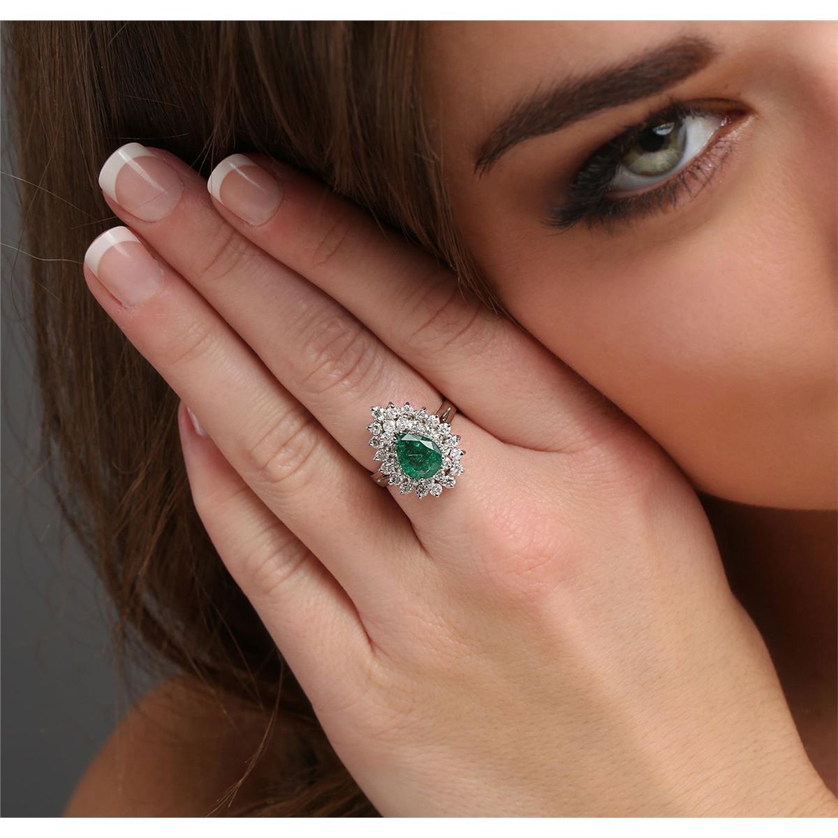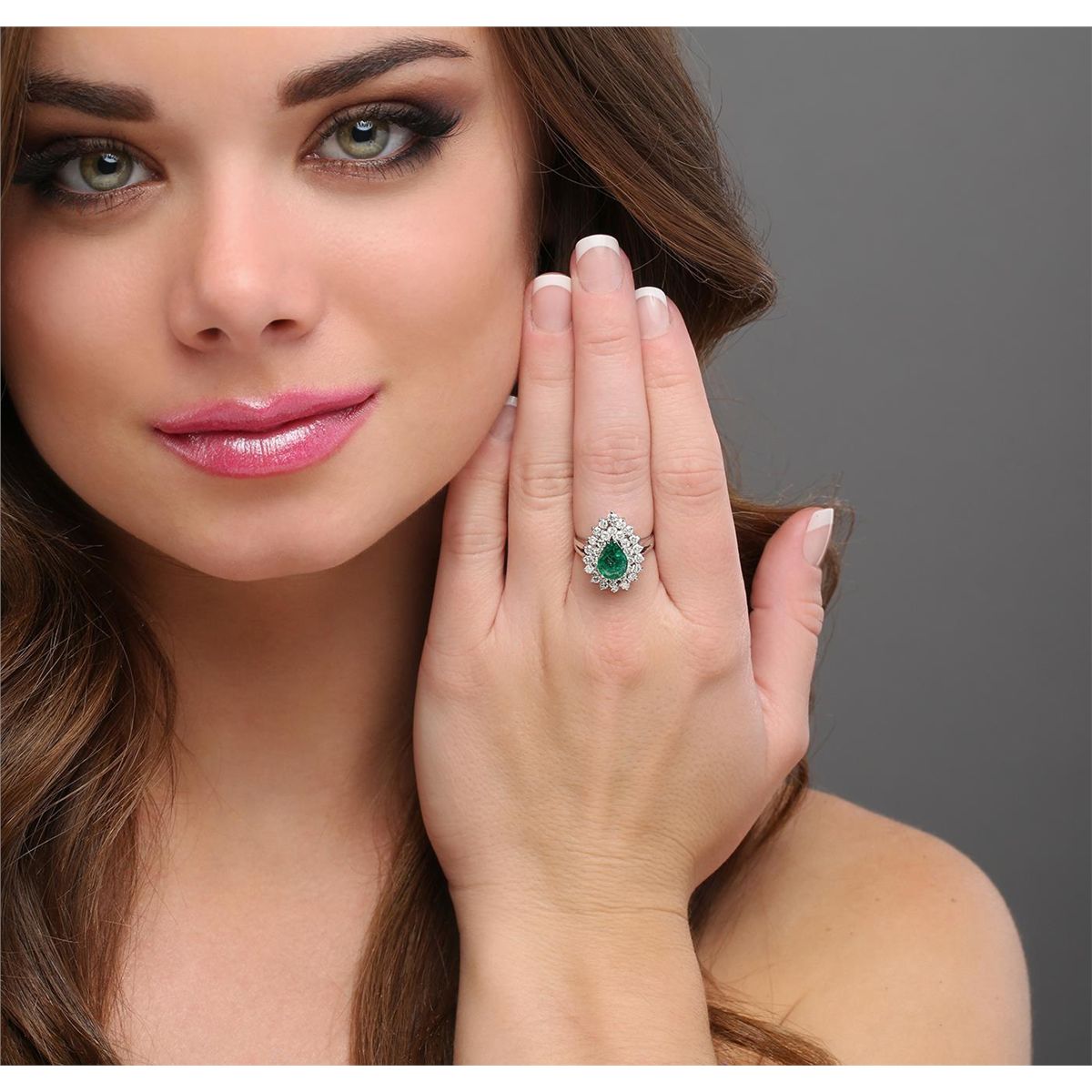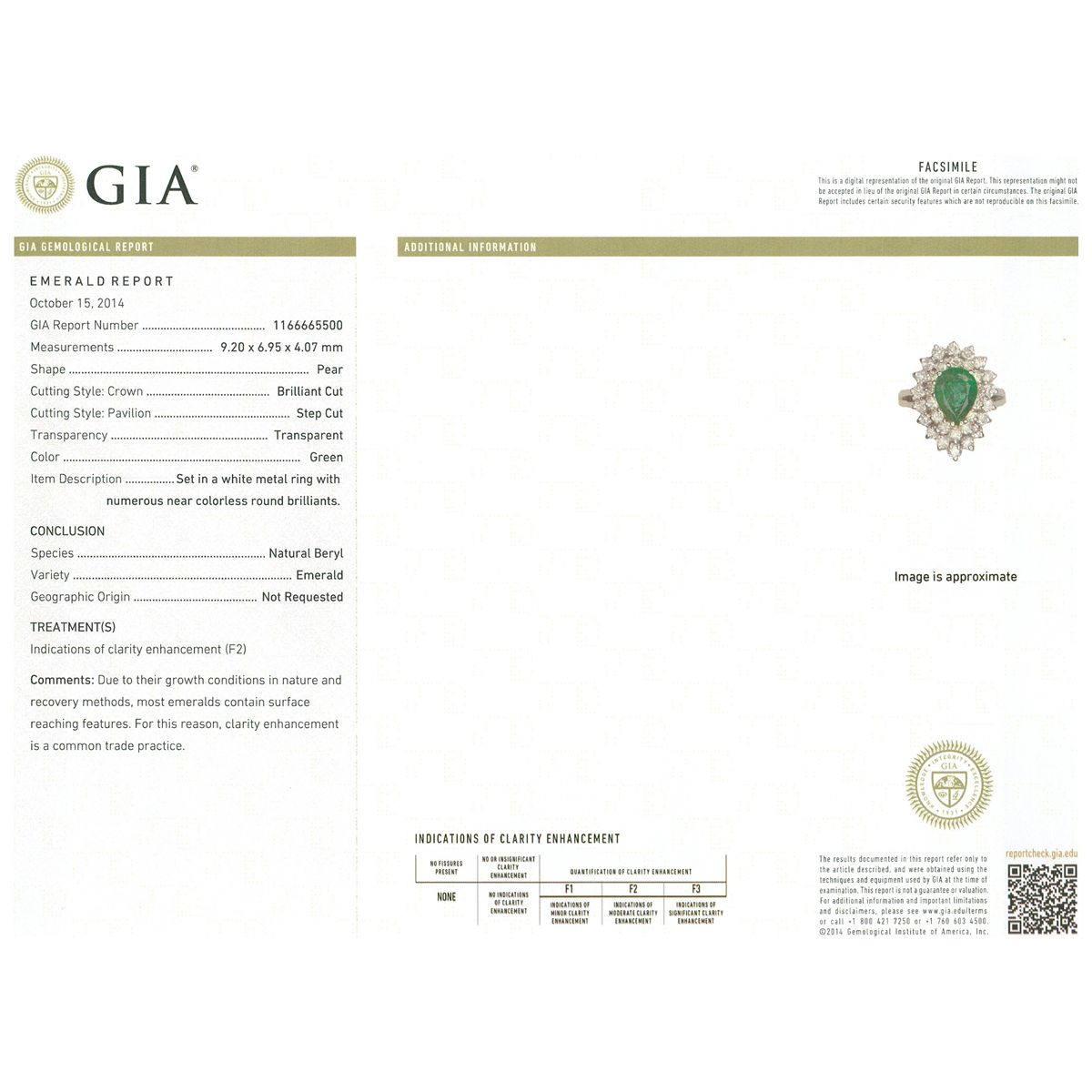 One electronically tested 18KT white gold ladies cast emerald and diamond ring with a bright polish finish. The featured emerald is set within two tiered diamond bezels supported by split shoulders, completed by a two and one-half millimeter wide band. Identified with markings of "18K". Condition is new, good workmanship. Containing: One prong set pear mixed cut natural emerald, measuring 9.20 x 6.95 x 4.07mm, 6% bulge factor, approximate weight of 1.50ct., clarity is heavily included, type III, medium dark, moderately strong, green color, (GIA G 6/4), cut is good. Transmitting light somewhat diffusely, transparent to translucent. Naturally occurring internal & external characteristics are present. Indications of moderate clarity enhancement. GIA Emerald Report attached. Graded in the GIA Laboratory, Report #1166665500.Thirty-Two prong set round brilliant cut diamonds, measuring 2.20 - 2.00 x 1.26mm (depth est.) approximate total weight of 32 Stones = 1.18ct. Graded in the setting. Clarity: I-2 to I-3. Color: H - J. Total Weight of Colored Stones 1.50ct. Total Weight of Diamonds 1.18ct. Total Weight of Ring 6.14 grams. AIG Appraised at $5,195.00.