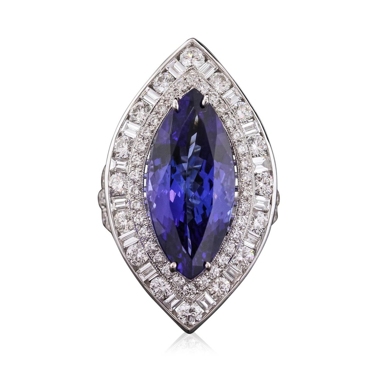 One electronically tested 18KT white gold ladies combination cast & assembled prong set ring with a split shank with a bright polish finish. Identified with markings of "750 18K". Condition is new. Containing: One prong set marquise modified brilliant cut natural tanzanite, measuring 22.29 x 10.31 x 7.12mm, exact weight 10.54ct., clarity is eye clean, type I, medium dark, moderately strong, bluish violet color, (GIA bV 6/4), cut is good. Graded loose prior to setting by GIA Gemological Laboratory, GIA Laboratory Report # 2161452330.Sixteen prong set round brilliant cut diamonds, measuring 2.80 - 2.80 x 1.68mm (depth est.) approximate total weight of 16 Stones = 1.29ct. Clarity: SI-1 to SI-2. Color: H - I, Cut is Very Good. Sixteen prong set baguette cut diamonds, measuring from 2.00 x 1.30 x 1.11mm (depth est.) to 2.50 x 1.50 x 1.28mm (depth est.) approximate total weight of 16 Stones = 0.76ct. Clarity: VS-1. Color: I - J, Cut is Good. Seventy prong set round brilliant cut diamonds, measuring 1.80 - 1.50 x 0.99mm (depth est.) approximate total weight of 70 Stones = 1.45ct. Clarity: SI-1 to SI-2. Color: H - I, Cut is Good. All diamonds and colored gemstones are graded in the mounting, unless otherwise stated, Colored gemstones are presumed to have been subjected to commonly used enhancement processes. Total Weight of Colored Stones 10.54ct. Total Weight of Diamonds 3.49ct. Total Weight of Ring 12.30 grams. GGL Appraised at $38,025.00.