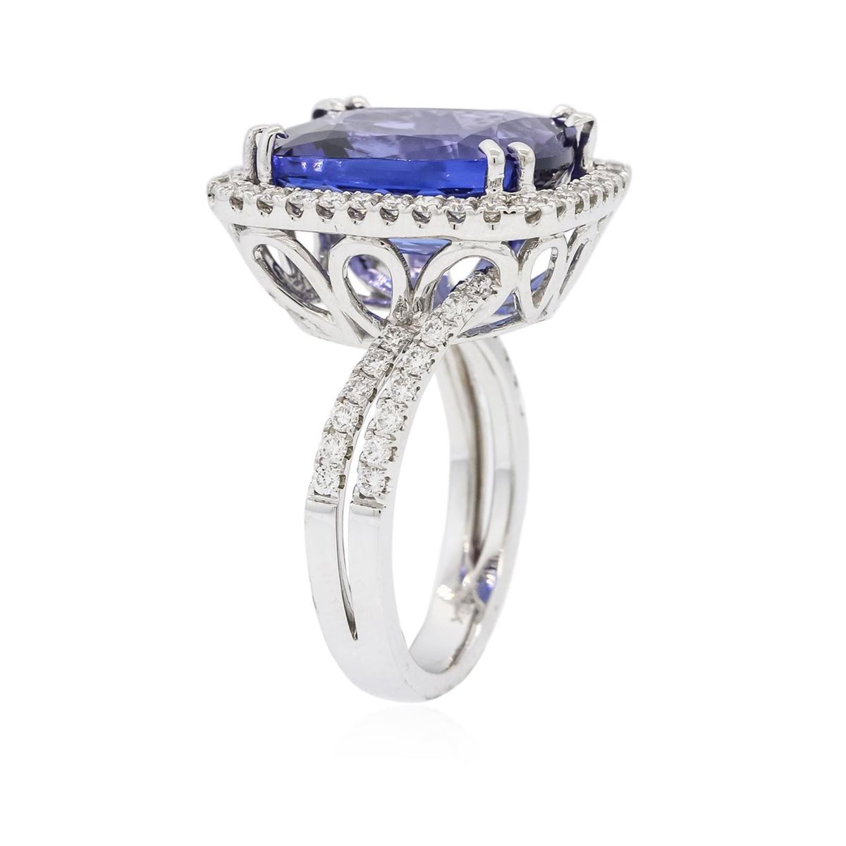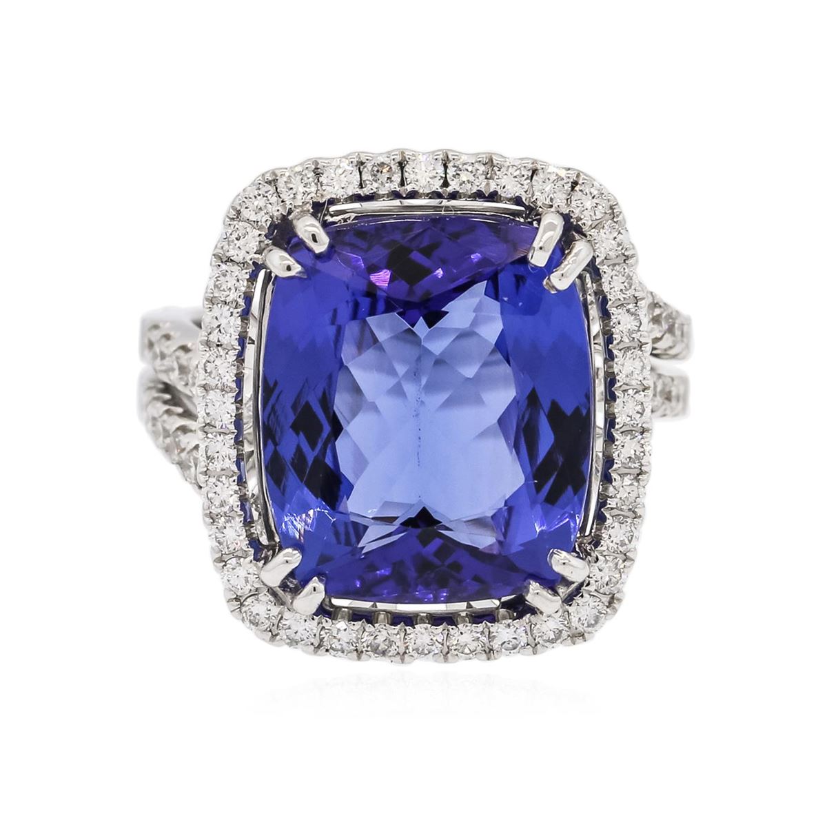 One electronically tested 18KT white gold ladies combination cast & assembled prong set ring with a split shank with a bright polish finish. Identified with markings of "750 UCG". Condition is new. Containing: One prong set rectangular cushion modified brilliant cut natural tanzanite, measuring 14.76 x 12.50 x 6.69mm, exact weight 10.65ct., clarity is eye clean, type I, medium, moderately strong, violetish blue color, (GIA vB 5/4), cut is excellent. Graded loose prior to setting by GIA Gemological Laboratory, GIA Laboratory Report # 2161453342.Sixty-Four prong set round brilliant cut diamonds, measuring 1.50 - 1.50 x 0.90mm (depth est.) approximate total weight of 64 Stones = 0.86ct. Clarity: SI-1 to SI-2. Color: H - I, Cut is Good. Colored gemstones are presumed to have been subjected to commonly used enhancement processes. All diamonds and colored gemstones are graded in the mounting, unless otherwise stated. Total Weight of Colored Stones 10.65ct. Total Weight of Diamonds 0.86ct. Total Weight of Ring 10.50 grams. GGL Appraised at $31,145.00.