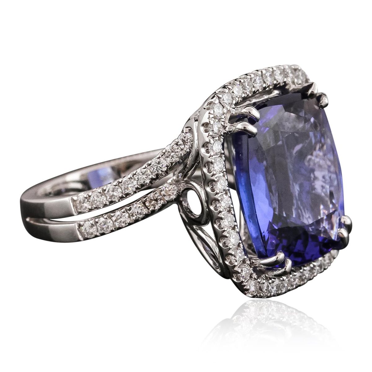 One electronically tested 18KT white gold ladies combination cast & assembled prong set ring with a split shank with a bright polish finish. Identified with markings of "750 UCG". Condition is new. Containing: One prong set rectangular cushion modified brilliant cut natural tanzanite, measuring 14.76 x 12.50 x 6.69mm, exact weight 10.65ct., clarity is eye clean, type I, medium, moderately strong, violetish blue color, (GIA vB 5/4), cut is excellent. Graded loose prior to setting by GIA Gemological Laboratory, GIA Laboratory Report # 2161453342.Sixty-Four prong set round brilliant cut diamonds, measuring 1.50 - 1.50 x 0.90mm (depth est.) approximate total weight of 64 Stones = 0.86ct. Clarity: SI-1 to SI-2. Color: H - I, Cut is Good. Colored gemstones are presumed to have been subjected to commonly used enhancement processes. All diamonds and colored gemstones are graded in the mounting, unless otherwise stated. Total Weight of Colored Stones 10.65ct. Total Weight of Diamonds 0.86ct. Total Weight of Ring 10.50 grams. GGL Appraised at $31,145.00.