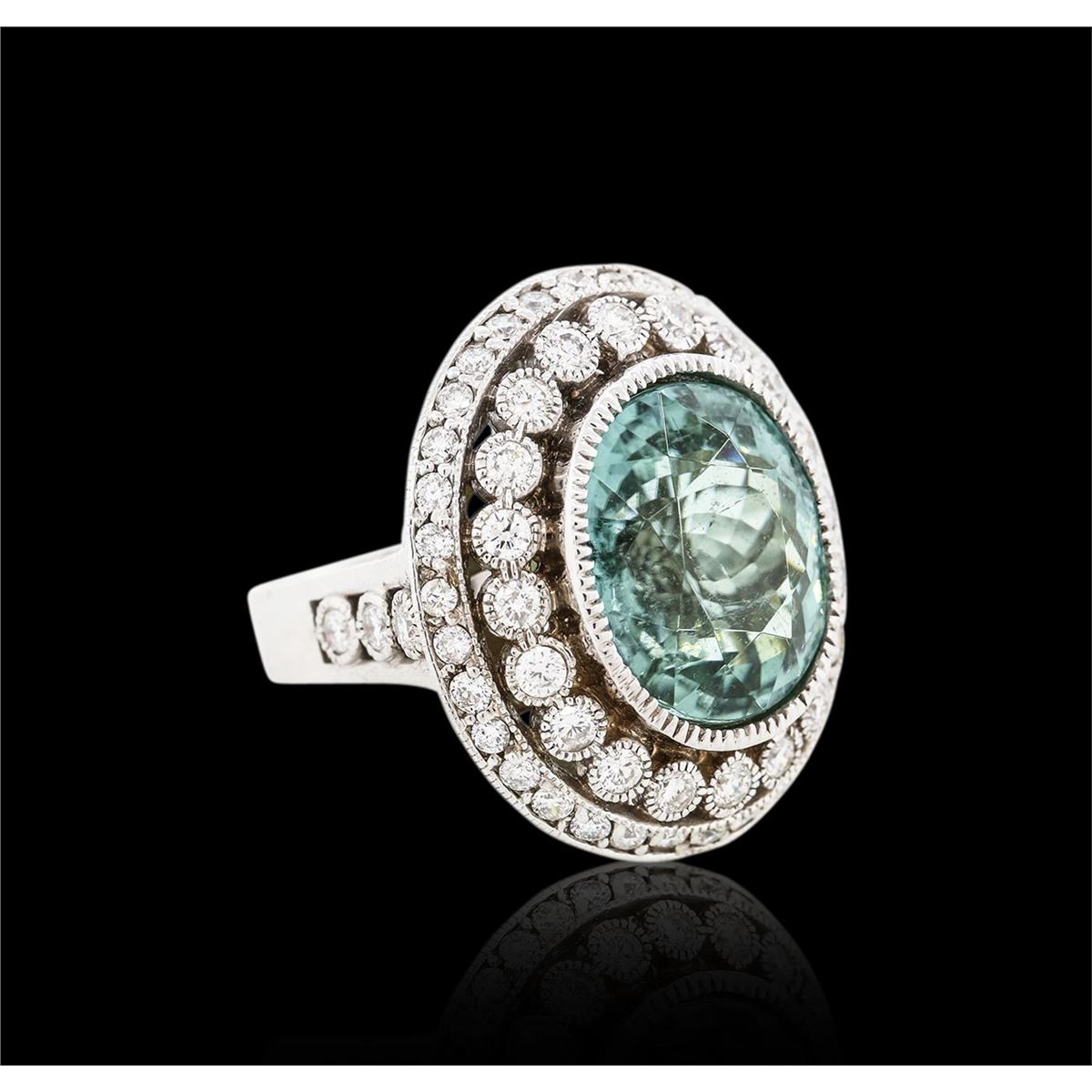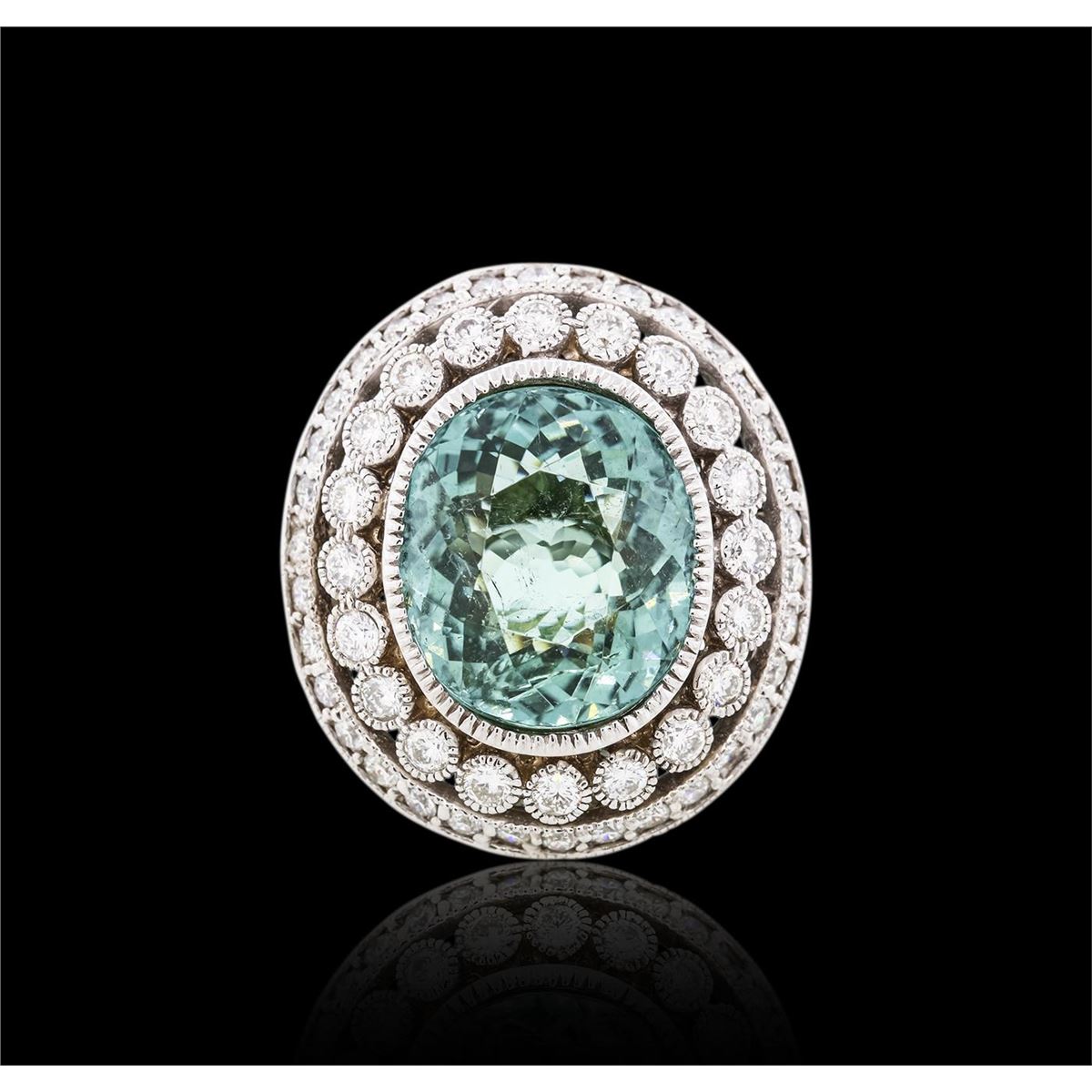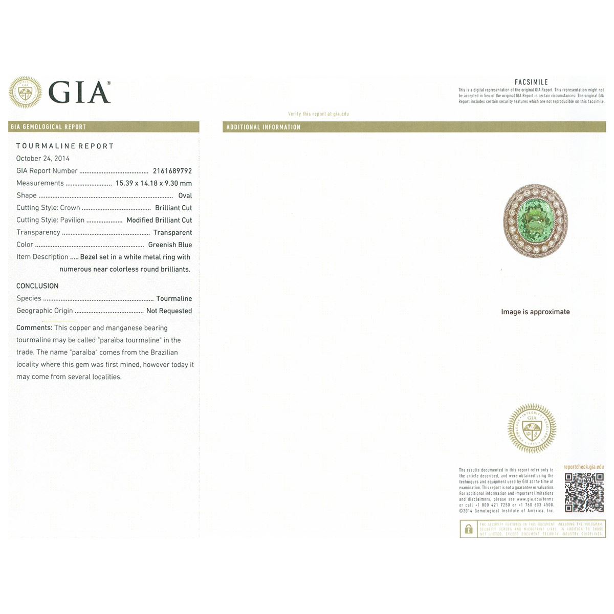 One electronically tested 18KT white gold ladies cast tourmaline & diamond ring with a bright finish.  The featured tourmaline is set within tiered diamond bezels, supported by an elaborate white gold lattice under gallery and diamond set shoulders, completed by a four millimeter wide band. Identified with markings of "18K". Containing: One bezel set oval mixed cut natural cuprian tourmaline, measuring 15.39 x 14.18 x 9.30mm, approximate weight of 12.44ct., clarity is slightly included, medium dark, slightly grayish, greenish blue color, (GIA gB 6/2), cut is good. Transmitting light with no distortion, transparent. Naturally occurring internal & external characteristics are present. Graded in the GIA Laboratory, Report # 2161689792. This copper and manganese bearing tourmaline maybe called "Paraiba tourmaline" in the trade. The name "Paraiba" comes from the Brazilian locality where this gem was first mined, however today it may come from several localities. Sixty bezel and prong set round brilliant cut diamonds, measuring 2.50 - 1.90 x 1.32mm (depth est.) approximate total weight of 60 Stones = 2.50ct.  Graded in the setting. Clarity SI-1 to I-1. Color G - H. Total Weight of Colored Stones 12.44ct. Total Weight of Diamonds 2.50ct. Total Weight of Ring 18.87 grams. AIG Appraised at $67,000.00.