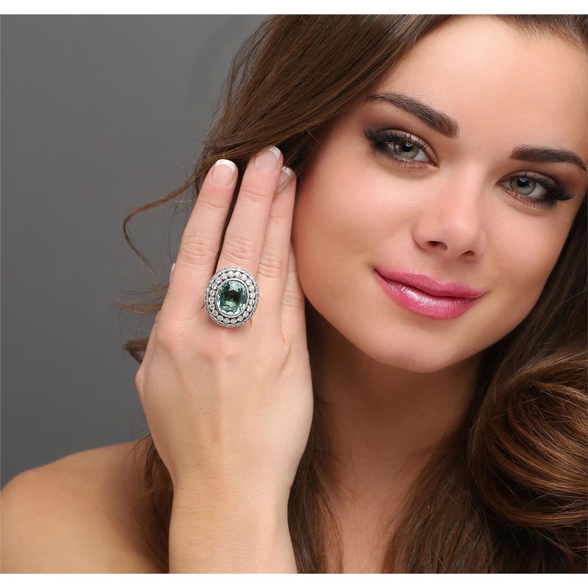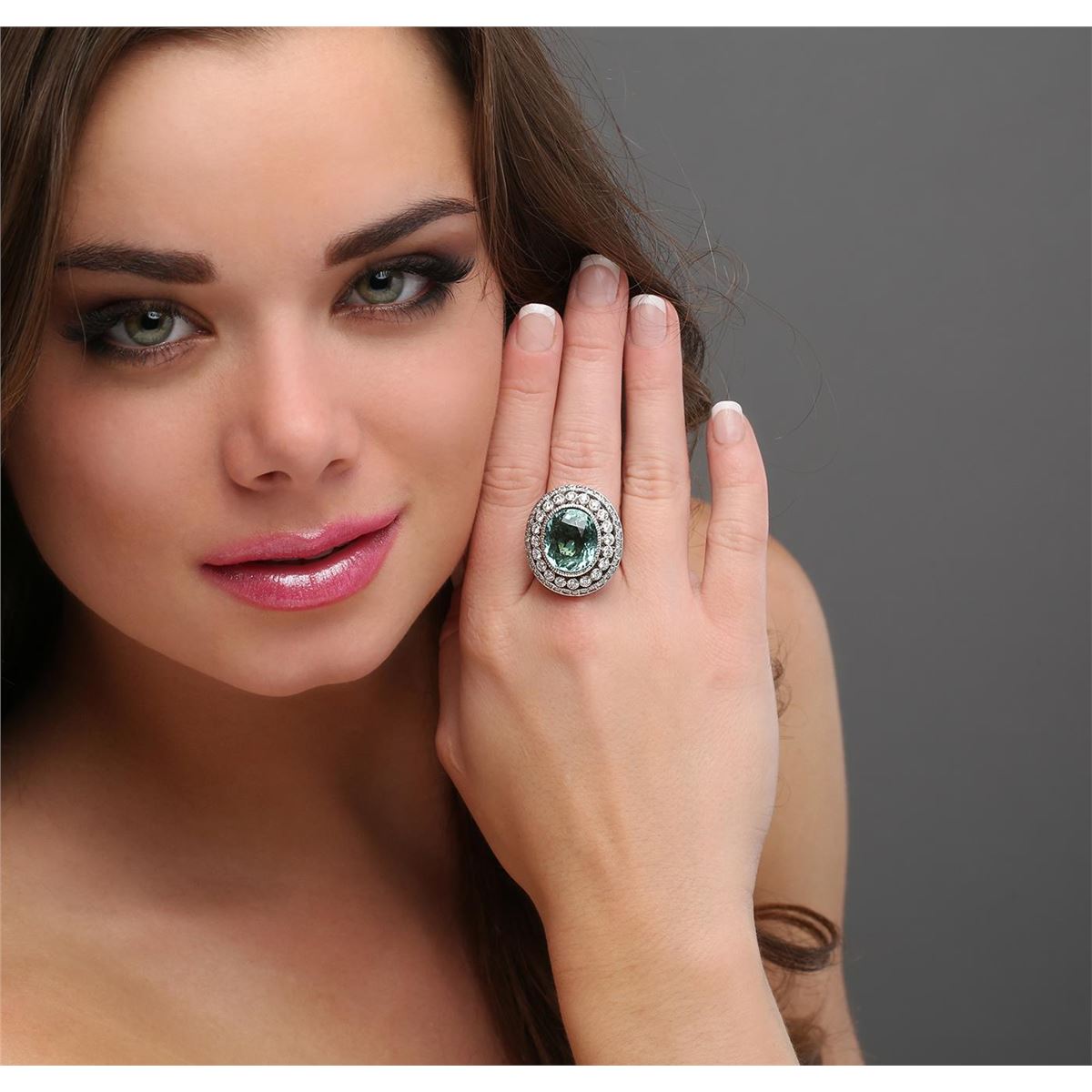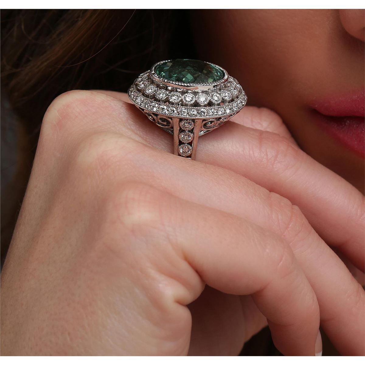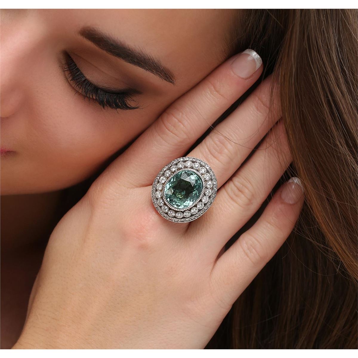 One electronically tested 18KT white gold ladies cast tourmaline & diamond ring with a bright finish.  The featured tourmaline is set within tiered diamond bezels, supported by an elaborate white gold lattice under gallery and diamond set shoulders, completed by a four millimeter wide band. Identified with markings of "18K". Containing: One bezel set oval mixed cut natural cuprian tourmaline, measuring 15.39 x 14.18 x 9.30mm, approximate weight of 12.44ct., clarity is slightly included, medium dark, slightly grayish, greenish blue color, (GIA gB 6/2), cut is good. Transmitting light with no distortion, transparent. Naturally occurring internal & external characteristics are present. Graded in the GIA Laboratory, Report # 2161689792. This copper and manganese bearing tourmaline maybe called "Paraiba tourmaline" in the trade. The name "Paraiba" comes from the Brazilian locality where this gem was first mined, however today it may come from several localities. Sixty bezel and prong set round brilliant cut diamonds, measuring 2.50 - 1.90 x 1.32mm (depth est.) approximate total weight of 60 Stones = 2.50ct.  Graded in the setting. Clarity SI-1 to I-1. Color G - H. Total Weight of Colored Stones 12.44ct. Total Weight of Diamonds 2.50ct. Total Weight of Ring 18.87 grams. AIG Appraised at $67,000.00.