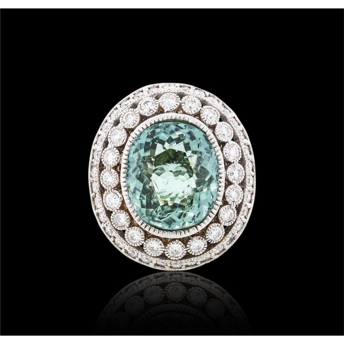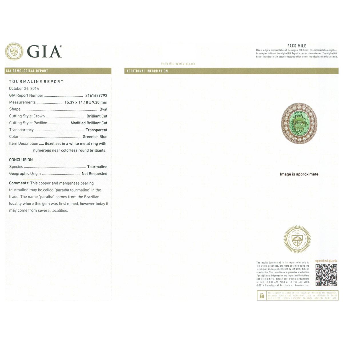 One electronically tested 18KT white gold ladies cast tourmaline & diamond ring with a bright finish. The featured tourmaline is set within tiered diamond bezels, supported by an elaborate white gold lattice under gallery and diamond set shoulders, completed by a four millimeter wide band. Identified with markings of "18K". Containing: One bezel set oval mixed cut natural cuprian tourmaline, measuring 15.39 x 14.18 x 9.30mm, approximate weight of 12.44ct., clarity is slightly included, medium dark, slightly grayish, greenish blue color, (GIA gB 6/2), cut is good. Transmitting light with no distortion, transparent. Naturally occurring internal & external characteristics are present. Graded in the GIA Laboratory, Report # 2161689792. This copper and manganese bearing tourmaline maybe called "Paraiba tourmaline" in the trade. The name "Paraiba" comes from the Brazilian locality where this gem was first mined, however today it may come from several localities. Sixty bezel and prong set round brilliant cut diamonds, measuring 2.50 - 1.90 x 1.32mm (depth est.) approximate total weight of 60 Stones = 2.50ct. Graded in the setting. Clarity SI-1 to I-1. Color G - H. Total Weight of Colored Stones 12.44ct. Total Weight of Diamonds 2.50ct. Total Weight of Ring 18.87 grams. AIG Appraised at $67,000.00.