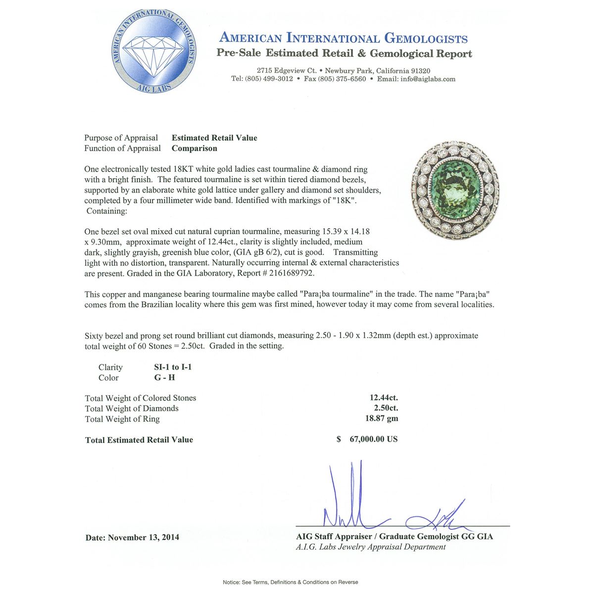 One electronically tested 18KT white gold ladies cast tourmaline & diamond ring with a bright finish. The featured tourmaline is set within tiered diamond bezels, supported by an elaborate white gold lattice under gallery and diamond set shoulders, completed by a four millimeter wide band. Identified with markings of "18K". Containing: One bezel set oval mixed cut natural cuprian tourmaline, measuring 15.39 x 14.18 x 9.30mm, approximate weight of 12.44ct., clarity is slightly included, medium dark, slightly grayish, greenish blue color, (GIA gB 6/2), cut is good. Transmitting light with no distortion, transparent. Naturally occurring internal & external characteristics are present. Graded in the GIA Laboratory, Report # 2161689792. This copper and manganese bearing tourmaline maybe called "Paraiba tourmaline" in the trade. The name "Paraiba" comes from the Brazilian locality where this gem was first mined, however today it may come from several localities. Sixty bezel and prong set round brilliant cut diamonds, measuring 2.50 - 1.90 x 1.32mm (depth est.) approximate total weight of 60 Stones = 2.50ct. Graded in the setting. Clarity SI-1 to I-1. Color G - H. Total Weight of Colored Stones 12.44ct. Total Weight of Diamonds 2.50ct. Total Weight of Ring 18.87 grams. AIG Appraised at $67,000.00.
