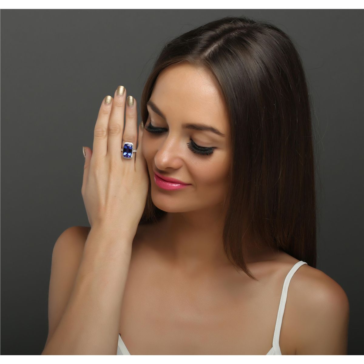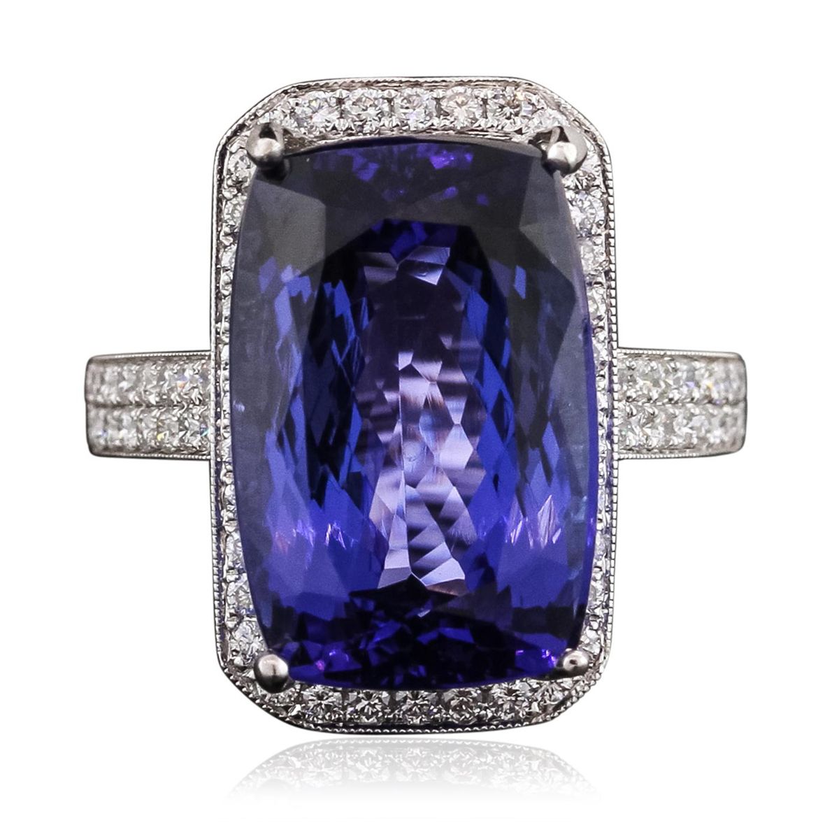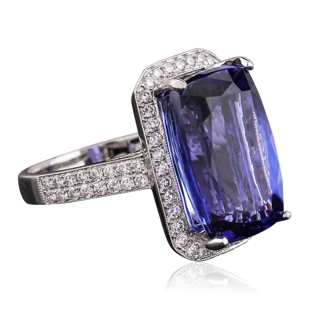 One electronically tested 18KT white gold ladies combination cast & assembled prong set ring with a flat shank with a bright polish finish. Identified with markings of "750 18K". Condition is new. Containing: Sixty-Eight prong set round brilliant cut diamonds, measuring 1.30 - 1.30 x 0.78mm (depth est.) approximate total weight of 68 Stones = 0.69ct. Clarity: SI-1 to SI-2. Color: H - I, Cut is Good. One prong set rectangular cushion modified brilliant cut natural tanzanite, measuring 16.36 x 10.83 x 8.06mm, exact weight 13.23ct., clarity is eye clean, type I, medium, moderately strong, violet color, (GIA V 5/4), cut is excellent. Graded loose prior to setting by GIA Gemological Laboratory, GIA Laboratory Report # 1166453344All diamonds are graded in the mounting, unless otherwise stated, Colored gemstones are presumed to have been subjected to commonly used enhancement processes. Total Weight of Colored Stones 13.23ct. Total Weight of Diamonds 0.69ct. Total Weight of Ring 7.70 grams. GGL Appraised at $35,350.00.