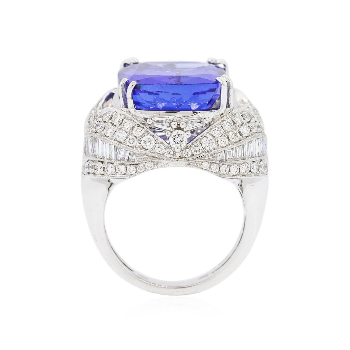 One electronically tested 18KT white gold ladies combination cast & assembled prong set ring with a flat shank with rounded edges with a bright polish finish. Identified with markings of "750 18K". Condition is new. Containing: One prong set rectangular cushion modified brilliant cut natural tanzanite, measuring 16.09 x 14.00 x 8.54mm, exact weight 15.08ct., clarity is eye clean, type I, medium, moderately strong, bluish violet color, (GIA bV 5/4), cut is very good. Graded loose prior to setting by GIA Gemological Laboratory, GIA Laboratory Report # 2161453349.One Hundred Twelve prong set round brilliant cut diamonds, measuring 2.00 - 1.40 x 1.02mm (depth est.) approximate total weight of 112 Stones = 1.51ct. Clarity: SI-1. Color: H - I, Cut is Good. Fifty channel set baguette cut diamonds, measuring from 1.30 x 1.00 x 0.85mm (depth est.) to 2.30 x 1.10 x 0.94mm (depth est.) approximate total weight of 50 Stones = 0.89ct. Clarity: VS-2. Color: H - I, Cut is Good. All diamonds are graded in the mounting, unless otherwise stated, Colored gemstones are presumed to have been subjected to commonly used enhancement processes. Total Weight of Colored Stones 15.08ct. Total Weight of Diamonds 2.40ct. Total Weight of Ring 17.50 grams. GGL Appraised at $49,265.00.