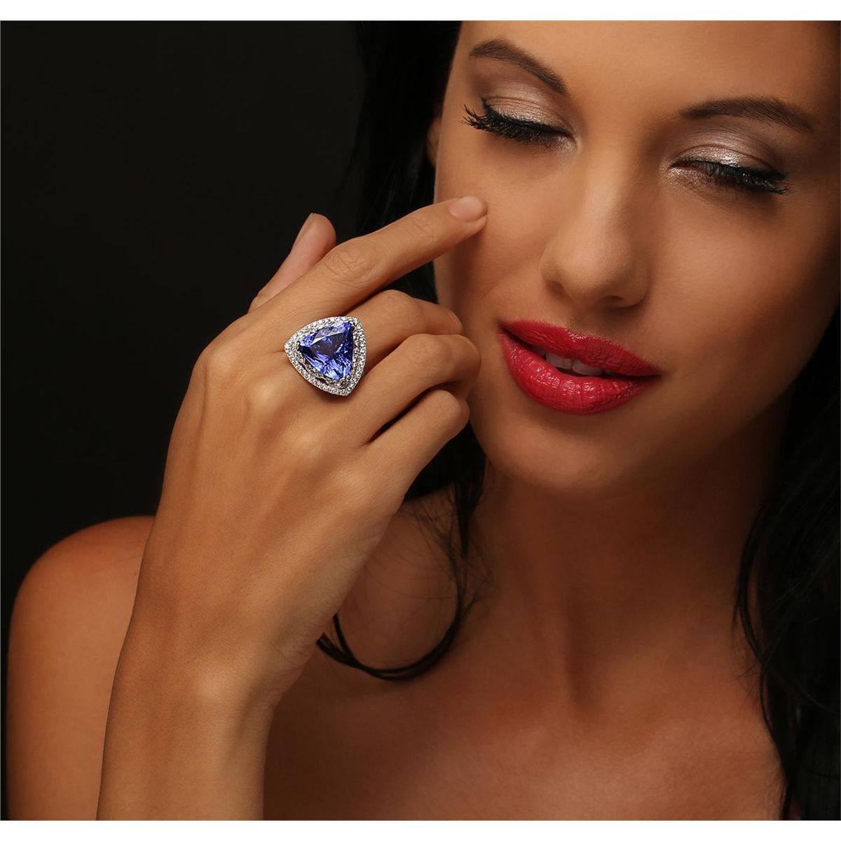 One electronically tested 18KT white gold ladies cast tanzanite and diamond ring. The featured tanzanite is set within two tiered diamond bezels supported by diamond set three-way split shoulders, completed by a two and one-half millimeter wide band. Bright polish finish with milgrain detailing. Trademark is UCG. Identified with markings of "750". Containing: One prong set triangle modified brilliant cut natural tanzanite, measuring 16.10 x 16.34 x 9.63mm, exact weight 15.23ct., clarity is eye clean, type I, medium dark, moderately strong, violet color, (GIA V 6/4), cut is good. Transmitting light with no distortion, transparent. GIA Gemological Report attached. Graded loose prior to setting in the GIA Laboratory, Report #6167212003.Tanzanite is a very rare gemstone that is only found in the country of Tanzania. Originally discovered in 1967. Tiffany & Company, named the stone Tanzanite. It is found in the Usumburu Mountains that border the Umba Valley of northern Tanzania. Tanzanite occurs in gray, brown, violet, blue, reddish-purple, & green. The gem is interesting because of its exceptional pleochroism. Rotated in different directions a tanzanite will exhibit multiple changes of color. Tanzanite has a low tolerance to ultrasonic cleaning, and should not be cleaned using this method. One Hundred Eleven prong set round brilliant cut diamonds, measuring 2.50 - 1.40 x 1.17mm (depth est.) approximate total weight of 111 Stones = 2.00ct. Graded in the setting. Clarity: VS-2 to SI-2 . Color: G - I. Total Weight of Colored Stones 15.23ct. Total Weight of Diamonds 2.00ct. Total Weight of Ring 11.18 grams. AIG Appraised at $47,370.00.