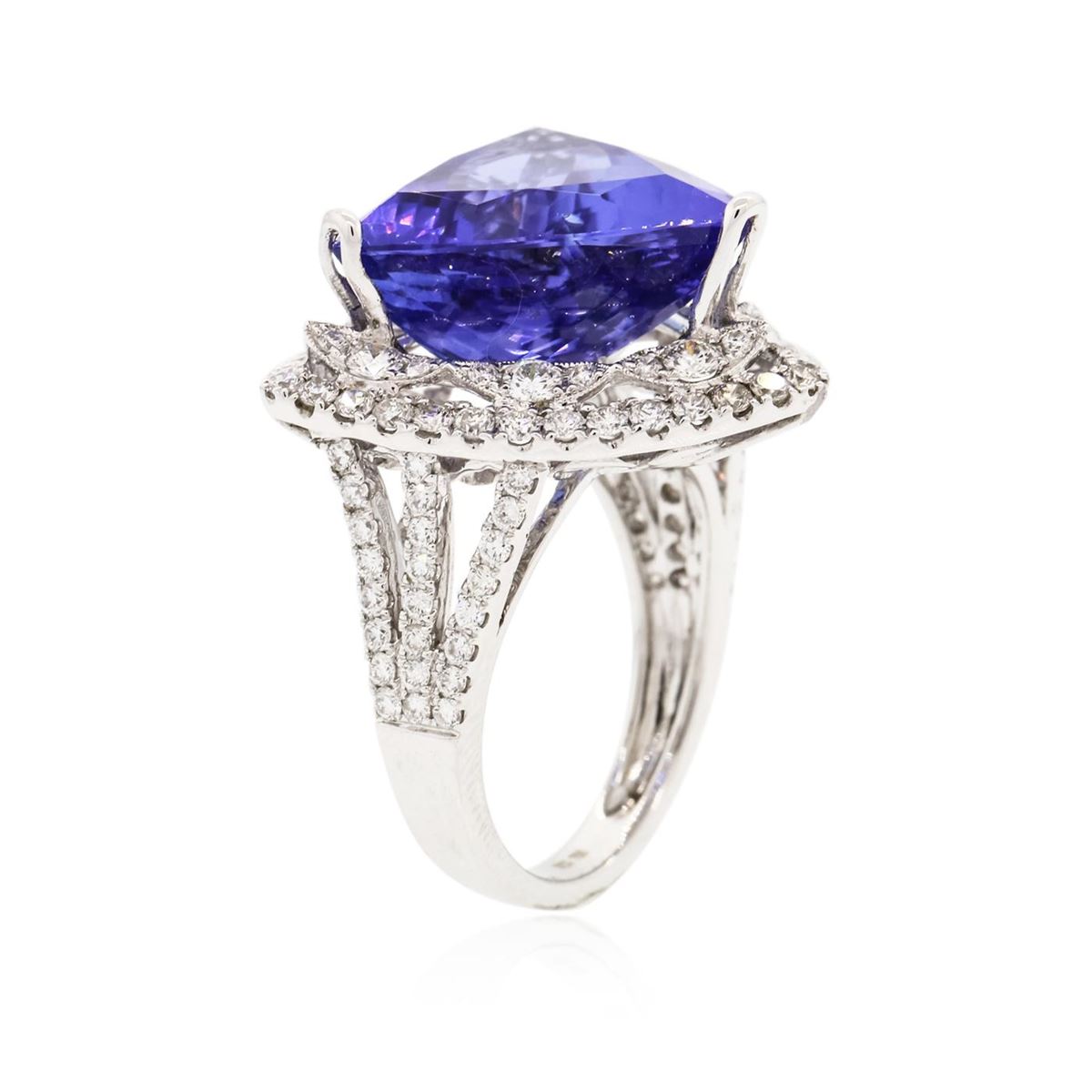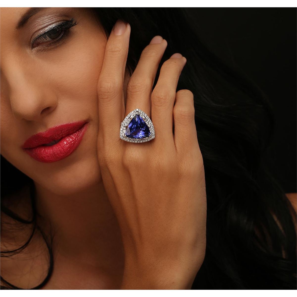One electronically tested 18KT white gold ladies cast tanzanite and diamond ring. The featured tanzanite is set within two tiered diamond bezels supported by diamond set three-way split shoulders, completed by a two and one-half millimeter wide band. Bright polish finish with milgrain detailing. Trademark is UCG. Identified with markings of "750". Containing: One prong set triangle modified brilliant cut natural tanzanite, measuring 16.10 x 16.34 x 9.63mm, exact weight 15.23ct., clarity is eye clean, type I, medium dark, moderately strong, violet color, (GIA V 6/4), cut is good. Transmitting light with no distortion, transparent. GIA Gemological Report attached. Graded loose prior to setting in the GIA Laboratory, Report #6167212003.Tanzanite is a very rare gemstone that is only found in the country of Tanzania. Originally discovered in 1967. Tiffany & Company, named the stone Tanzanite. It is found in the Usumburu Mountains that border the Umba Valley of northern Tanzania. Tanzanite occurs in gray, brown, violet, blue, reddish-purple, & green. The gem is interesting because of its exceptional pleochroism. Rotated in different directions a tanzanite will exhibit multiple changes of color. Tanzanite has a low tolerance to ultrasonic cleaning, and should not be cleaned using this method. One Hundred Eleven prong set round brilliant cut diamonds, measuring 2.50 - 1.40 x 1.17mm (depth est.) approximate total weight of 111 Stones = 2.00ct. Graded in the setting. Clarity: VS-2 to SI-2 . Color: G - I. Total Weight of Colored Stones 15.23ct. Total Weight of Diamonds 2.00ct. Total Weight of Ring 11.18 grams. AIG Appraised at $47,370.00.
