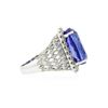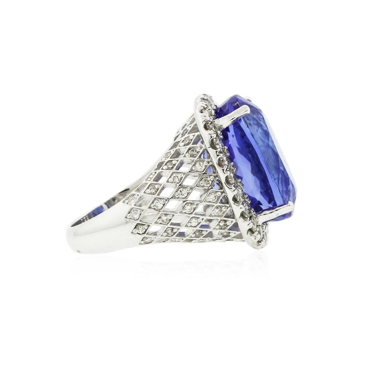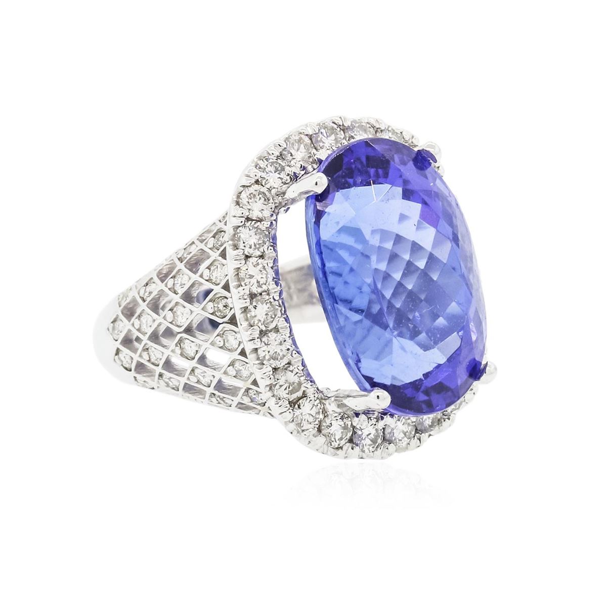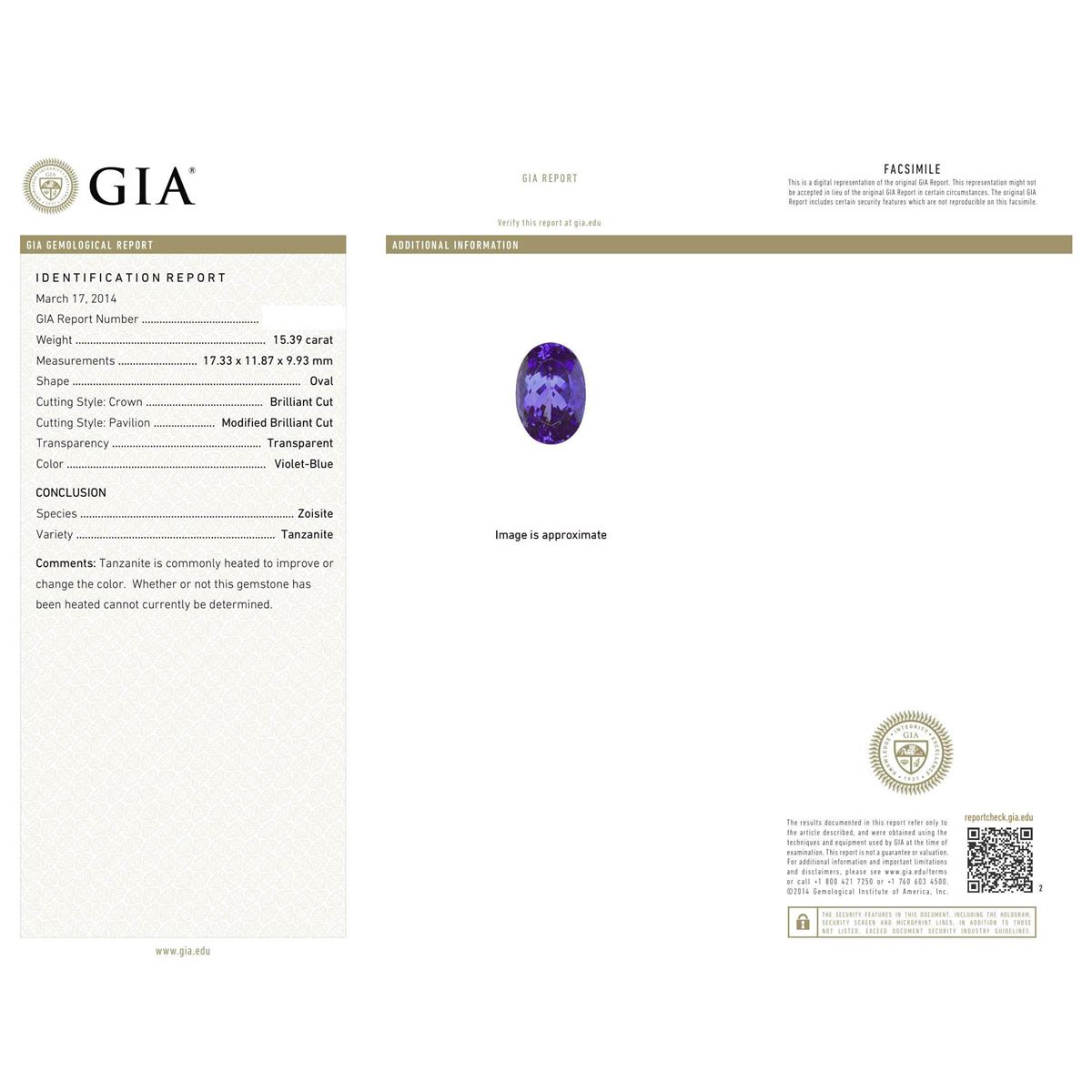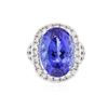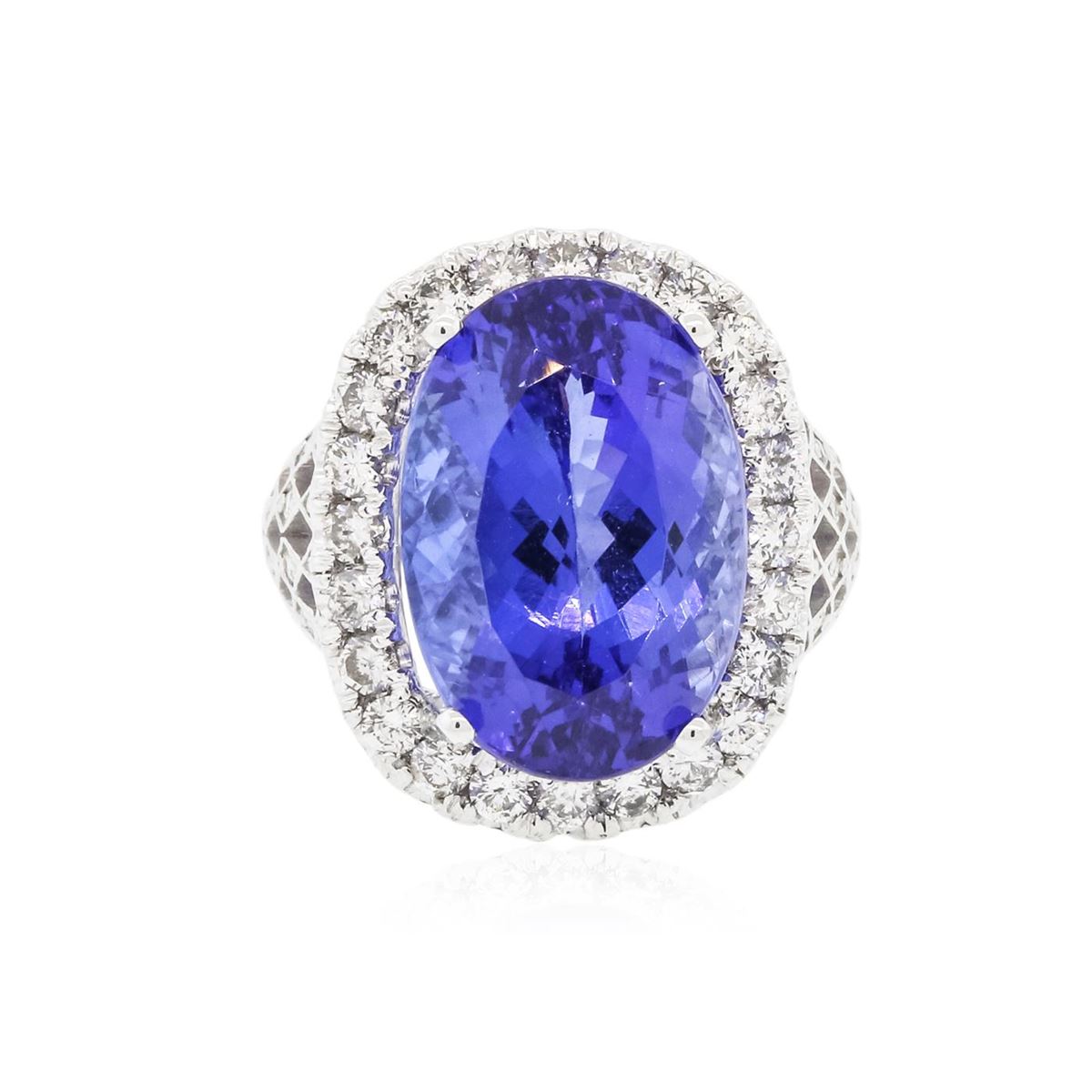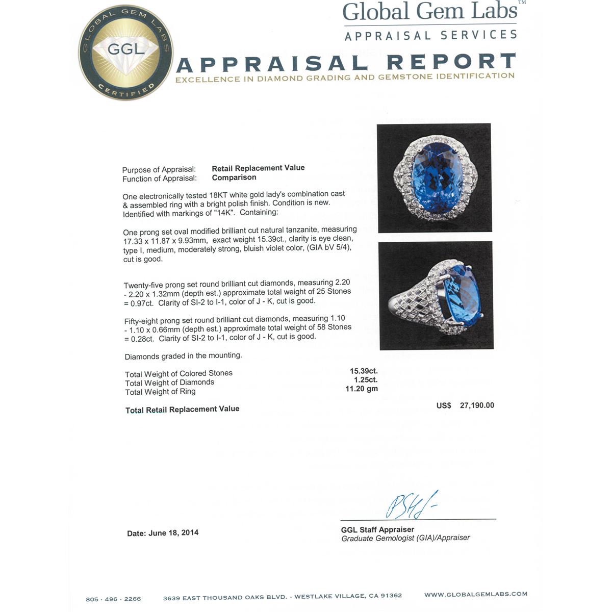 One electronically tested 18KT white gold Ladies combination cast & assembled ring with a bright polish finish. Condition is new. Identified with markings of "14K". Containing: One prong set oval modified brilliant cut natural tanzanite, measuring 17.33 x 11.87 x 9.93mm, exact weight 15.39ct., clarity is eye clean, type I, medium, moderately strong, bluish violet color, (GIA bV 5/4), cut is good. GIA Report: 6157964642.Twenty-Five prong set round brilliant cut diamonds, measuring 2.20 - 2.20 x 1.32mm (depth est.) approximate. Total Weight of 25 Stones = 0.97ct. Clarity: SI-2 to I-1. Color: J - K, Cut is Good. Fifty-Eight prong set round brilliant cut diamonds, measuring 1.10 - 1.10 x 0.66mm (depth est.) approximate. Total Weight of 58 Stones = 0.28ct. Clarity: SI-2 to I-1. Color: J - K, Cut is Good. Diamonds graded in the mounting. Total Weight of Colored Stones 15.39ct. Total Weight of Diamonds 1.25ct. Total Weight of Ring 11.20 grams. GGL Appraised at $27,190.00.