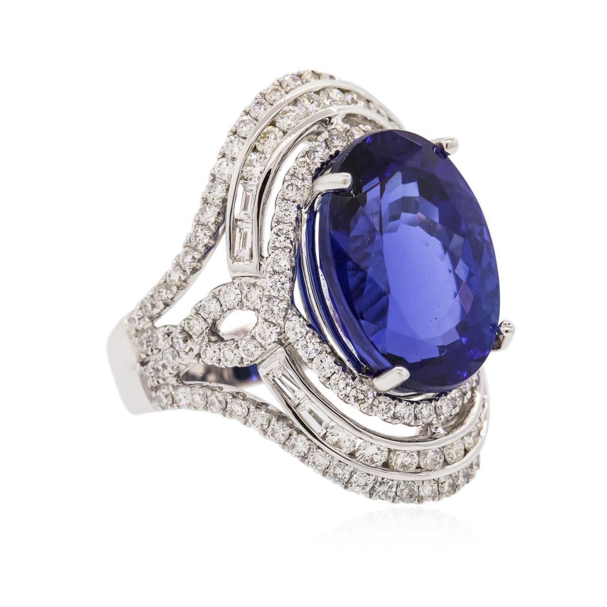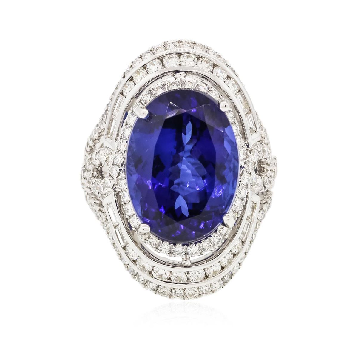 One electronically tested 18KT white gold ladies cast tanzanite and diamond ring with a bright polish finish. Condition is new, good workmanship. The featured tanzanite is set within an elaborate diamond lattice gallery, completed by a four millimeter wide band. Trademark is UCG. Identified with markings of "750". Containing: One prong set oval modified brilliant cut natural tanzanite, measuring 17.34 x 12.78 x 9.36mm, exact weight 15.73ct., type I Clarity is eye clean, medium dark, moderately strong, Violet-Blue color, (GIA VB 6/4), cut is good. Transmitting light with no distortion, transparent. GIA Gemological Report attached. Graded loose prior to setting in the GIA Laboratory, Report # 1166211991.Tanzanite is a very rare gemstone that is only found in the country of Tanzania. Originally discovered in 1967. Tiffany & Company, named the stone Tanzanite. It is found in the Usumburu Mountains that border the Umba Valley of northern Tanzania. Tanzanite occurs in gray, brown, violet, blue, reddish-purple, & green. The gem is interesting because of its exceptional pleochroism. Rotated in different directions a tanzanite will exhibit multiple changes of color. Tanzanite has a low tolerance to ultrasonic cleaning, and should not be cleaned using this method. One Hundred Sixteen prong and channel set round brilliant cut diamonds, measuring 2.00 - 1.50 x 1.05mm (depth est.) approximate total weight of 116 Stones = 2.27ct. Graded in the setting. Clarity: SI-1 to I-1 . Color: F - G Eight channel set baguette cut diamonds, measuring from 2.30 x 1.30 x 0.91mm (depth est.) to 2.50 x 1.40 x 0.98mm (depth est.) approximate total weight of 8 Stones = 0.23ct. Graded in the setting. Clarity: VVS-2 to VS-2. Color: F - G. Total Weight of Colored Stones 15.73ct. Total Weight of Diamonds 2.50ct. Total Weight of Ring 14.90 grams. AIG Appraised at $54,125.00.