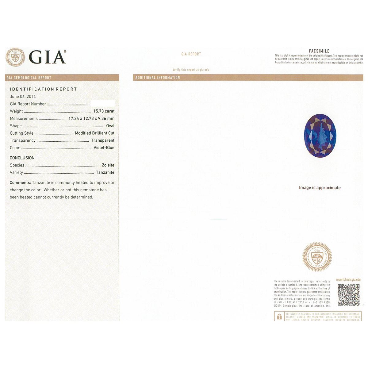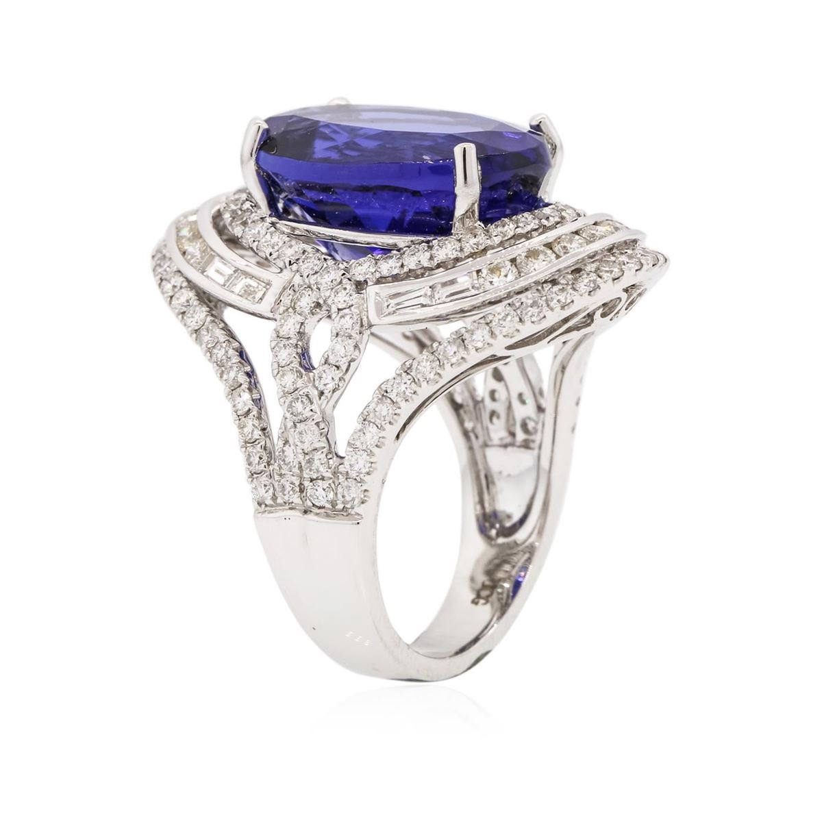One electronically tested 18KT white gold ladies cast tanzanite and diamond ring with a bright polish finish. Condition is new, good workmanship. The featured tanzanite is set within an elaborate diamond lattice gallery, completed by a four millimeter wide band. Trademark is UCG. Identified with markings of "750". Containing: One prong set oval modified brilliant cut natural tanzanite, measuring 17.34 x 12.78 x 9.36mm, exact weight 15.73ct., type I Clarity is eye clean, medium dark, moderately strong, Violet-Blue color, (GIA VB 6/4), cut is good. Transmitting light with no distortion, transparent. GIA Gemological Report attached. Graded loose prior to setting in the GIA Laboratory, Report # 1166211991.Tanzanite is a very rare gemstone that is only found in the country of Tanzania. Originally discovered in 1967. Tiffany & Company, named the stone Tanzanite. It is found in the Usumburu Mountains that border the Umba Valley of northern Tanzania. Tanzanite occurs in gray, brown, violet, blue, reddish-purple, & green. The gem is interesting because of its exceptional pleochroism. Rotated in different directions a tanzanite will exhibit multiple changes of color. Tanzanite has a low tolerance to ultrasonic cleaning, and should not be cleaned using this method. One Hundred Sixteen prong and channel set round brilliant cut diamonds, measuring 2.00 - 1.50 x 1.05mm (depth est.) approximate total weight of 116 Stones = 2.27ct. Graded in the setting. Clarity: SI-1 to I-1 . Color: F - G Eight channel set baguette cut diamonds, measuring from 2.30 x 1.30 x 0.91mm (depth est.) to 2.50 x 1.40 x 0.98mm (depth est.) approximate total weight of 8 Stones = 0.23ct. Graded in the setting. Clarity: VVS-2 to VS-2. Color: F - G. Total Weight of Colored Stones 15.73ct. Total Weight of Diamonds 2.50ct. Total Weight of Ring 14.90 grams. AIG Appraised at $54,125.00.