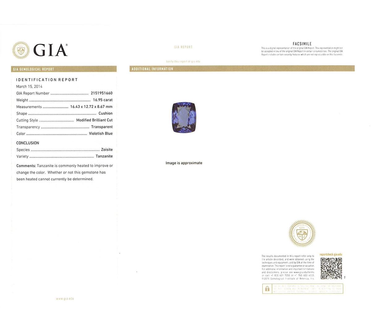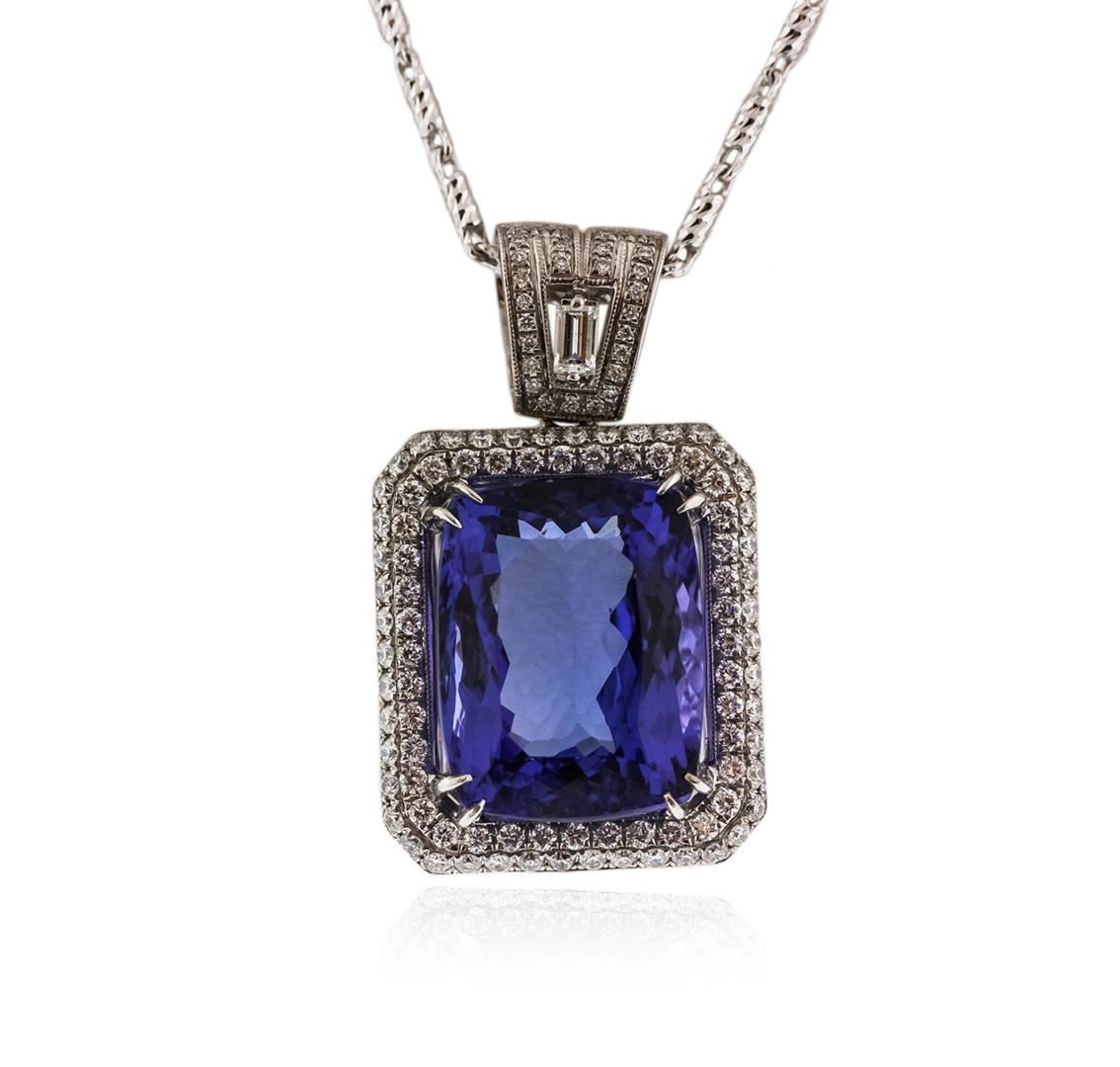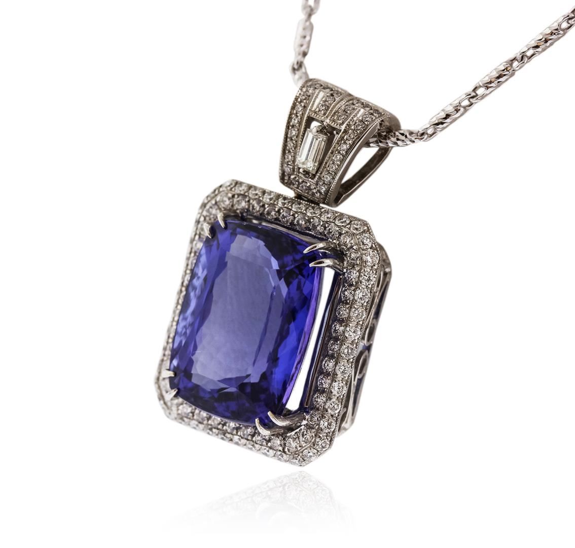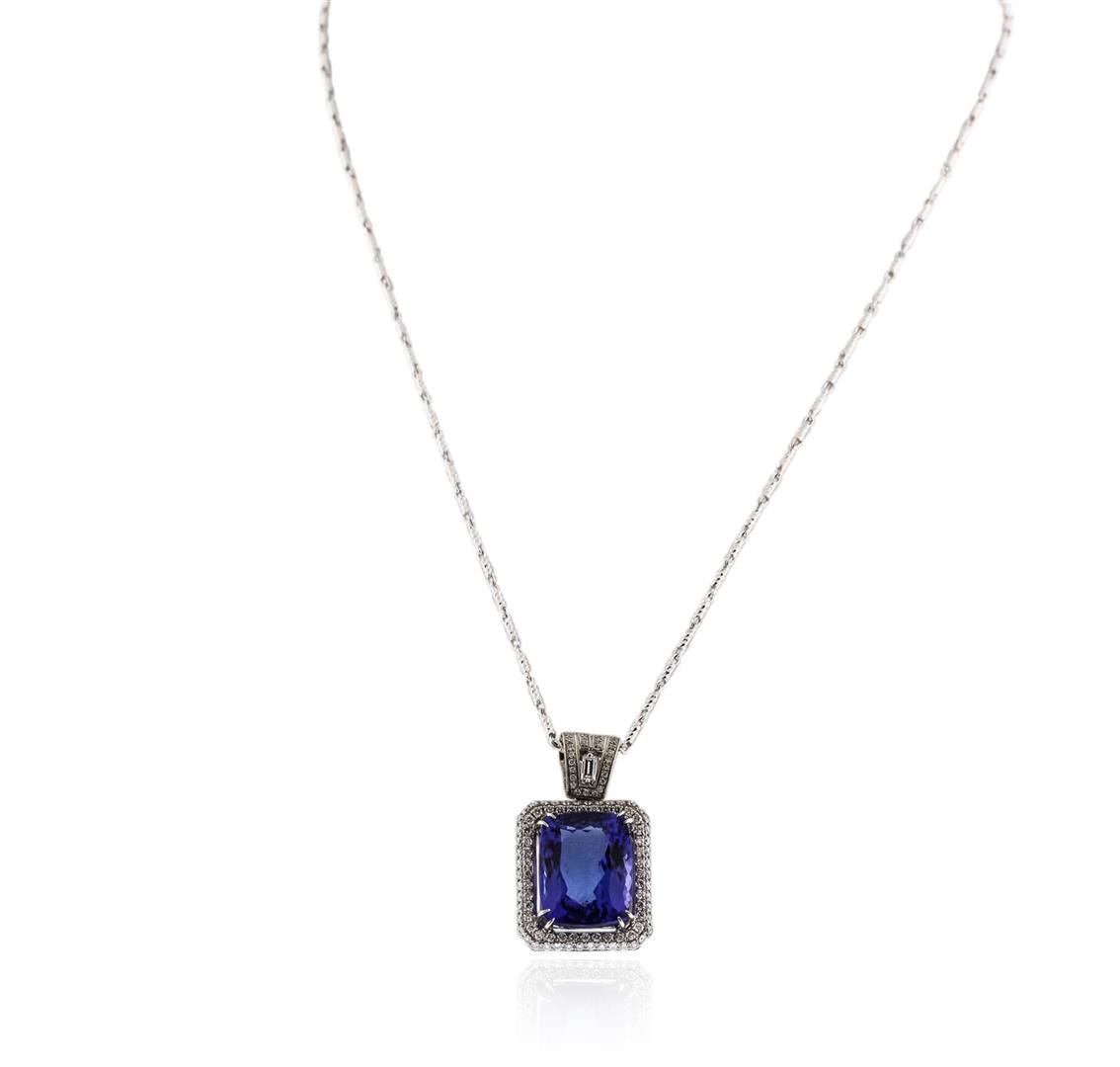 One electronically tested 18KT white gold ladies cast & assembled tanzanite and diamond pendant with chain. The pendant features a tanzanite set within a tiered diamond bezel supported by a diamond accented latice under gallery, completed by a diamond set bail. The pendant is supported by an eighteen inch length 14KT white gold designer style chain, terminating in a lobster claw clasp. Bright polish finish with milgrain detailing. Identified with markings of "18K". Condition is new, good workmanship. Containing: One prong set cushion modified brilliant cut natural tanzanite, measuring 16.43 x 12.72 x 8.67mm, exact weight 16.95ct., clarity is eye clean, type I, dark, moderately strong, violetish blue color, (GIA vB 7/4), cut is good. Transmitting light with no distortion, transparent. GIA Gemological Report attached. Graded loose prior to setting in the GIA Laboratory, Report #2151951660.Tanzanite is a very rare gemstone that is only found in the country of Tanzania. Originally discovered in 1967. Tiffany & Company, named the stone Tanzanite. It is found in the Usumburu Mountains that border the Umba Valley of northern Tanzania. Tanzanite occurs in gray, brown, violet, blue, reddish-purple, & green. The gem is interesting because of its exceptional pleochroism. Rotated in different directions a tanzanite will exhibit multiple changes of color. Tanzanite has a low tolerance to ultrasonic cleaning, and should not be cleaned using this method. Eighty-Six prong set round brilliant cut diamonds, measuring 1.50 - 1.40 x 0.87mm (depth est.) approximate total weight of 86 Stones = 1.05ct. Graded in the setting. Clarity: VS-2 to SI-1. Color: G - I Forty-Five prong set round brilliant cut diamonds, measuring 1.10 - 1.00 x 0.63mm (depth est.) approximate total weight of 45 Stones = 0.20ct. Graded in the setting. Clarity: VS-2 to SI-1. Color: G - I One prong set baguette cut diamond, measuring 3.40 x 2.00 x 1.40mm (depth est.) approximate weight of 0.08ct. Graded in the setting. Clarity: SI-1. Color: G. Total Weight of Colored Stones 16.95ct. Total Weight of Diamonds 1.33ct. Total Weight of Pendant With Chain 16.59 grams. AIG Appraised at $47,745.00.