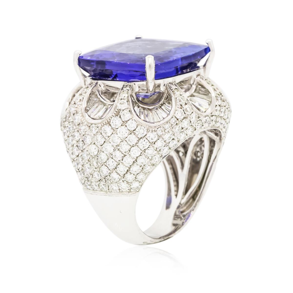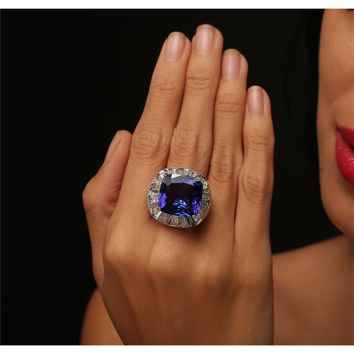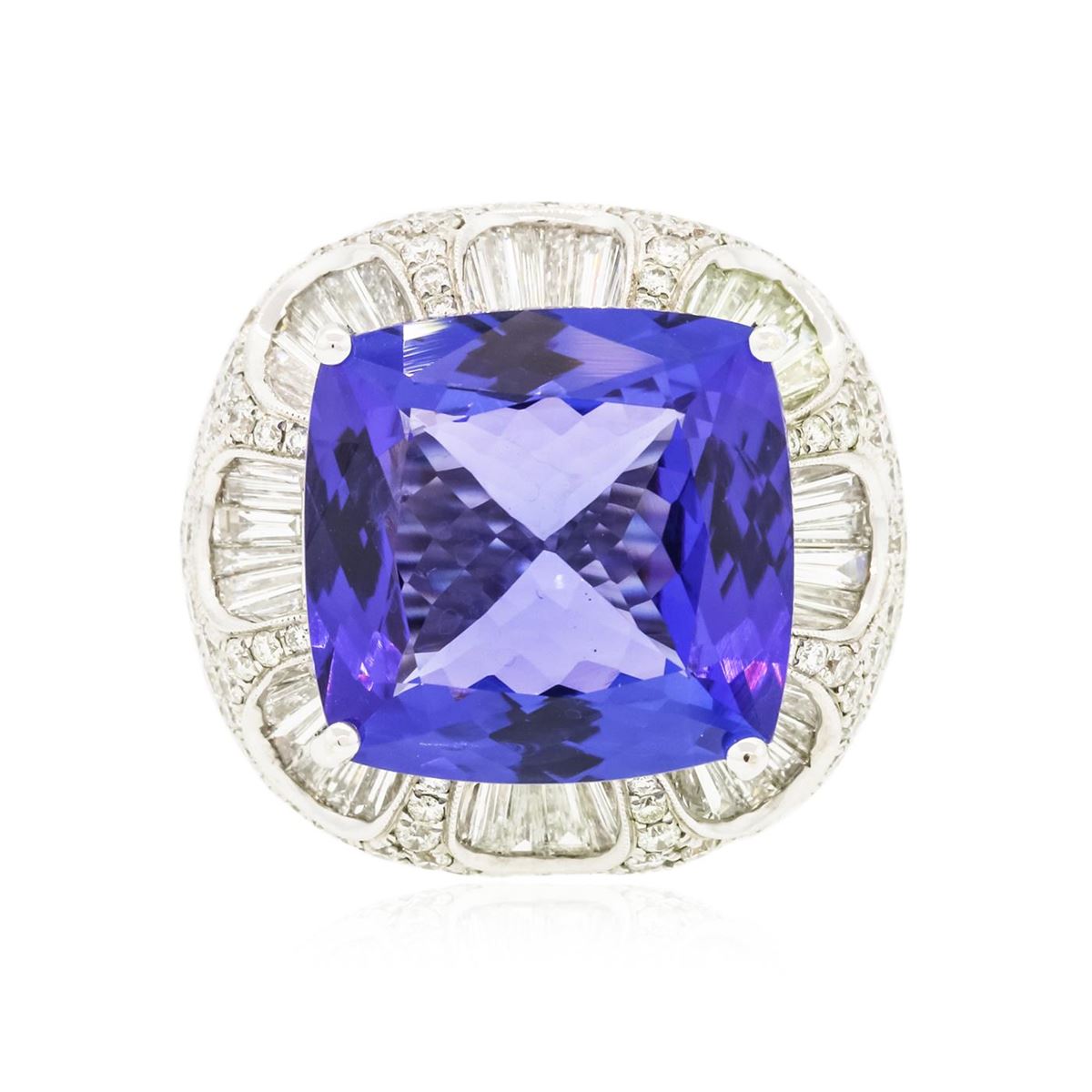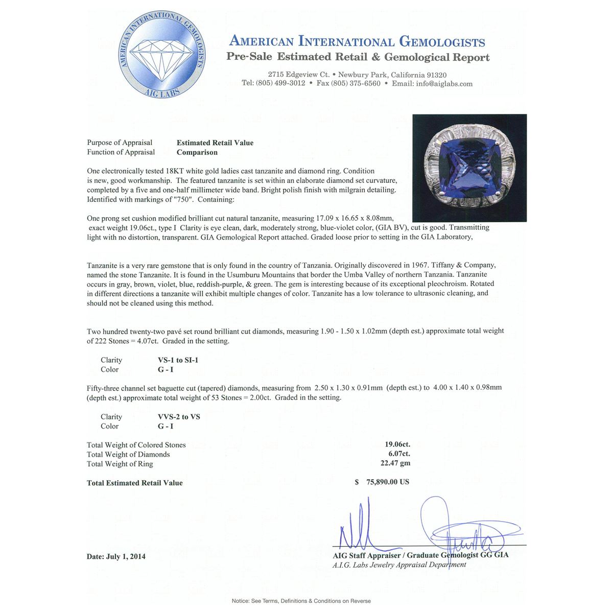 One electronically tested 18KT white gold ladies cast tanzanite and diamond ring. The featured tanzanite is set within an elaborate diamond set curvature, completed by a five and one-half millimeter wide band. Bright polish finish with milgrain detailing. Identified with markings of "750". Containing: One prong set cushion modified brilliant cut natural tanzanite, measuring 17.09 x 16.65 x 8.08mm, exact weight 19.06ct., type I Clarity is eye clean, dark, moderately strong, blue-violet color, (GIA BV), cut is good. Transmitting light with no distortion, transparent. GIA Gemological Report attached. Graded loose prior to setting in the GIA Laboratory, Report #6167211965. Tanzanite is a very rare gemstone that is only found in the country of Tanzania. Originally discovered in 1967. Tiffany & Company, named the stone Tanzanite. It is found in the Usumburu Mountains that border the Umba Valley of northern Tanzania. Tanzanite occurs in gray, brown, violet, blue, reddish-purple, & green. The gem is interesting because of its exceptional pleochroism. Rotated in different directions a tanzanite will exhibit multiple changes of color. Tanzanite has a low tolerance to ultrasonic cleaning, and should not be cleaned using this method. Two Hundred Twenty-Two pave set round brilliant cut diamonds, measuring 1.90 - 1.50 x 1.02mm (depth est.) approximate total weight of 222 Stones = 4.07ct. Graded in the setting. Clarity: VS-1 to SI-1 . Color: G - I Fifty-Three channel set baguette cut (tapered) diamonds, measuring from 2.50 x 1.30 x 0.91mm (depth est.) to 4.00 x 1.40 x 0.98mm (depth est.) approximate total weight of 53 Stones = 2.00ct. Graded in the setting. Clarity: VVS-2 to VS . Color: G - I. Total Weight of Colored Stones 19.06ct. Total Weight of Diamonds 6.07ct. Total Weight of Ring 22.47 grams. AIG Appraised at $75,890.00.