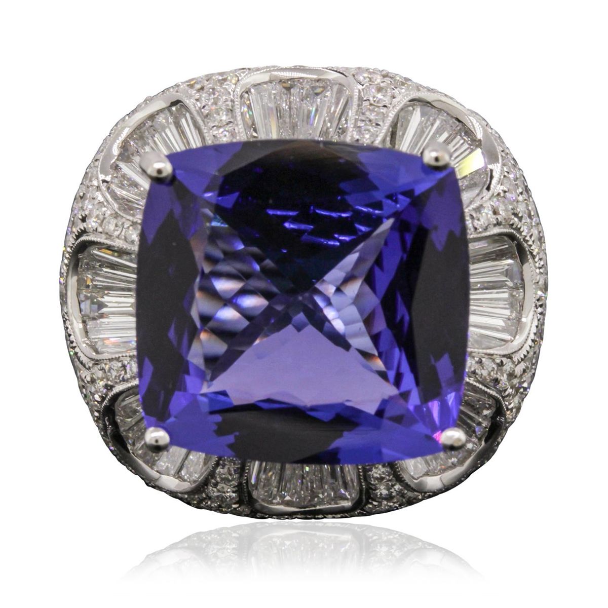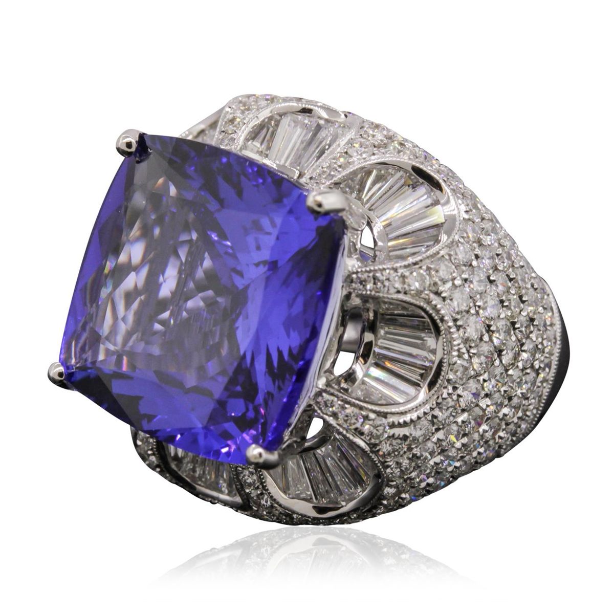 One electronically tested 18KT white gold ladies cast tanzanite and diamond ring. The featured tanzanite is set within an elaborate diamond set curvature, completed by a five and one-half millimeter wide band. Bright polish finish with milgrain detailing. Identified with markings of "750". Containing: One prong set cushion modified brilliant cut natural tanzanite, measuring 17.09 x 16.65 x 8.08mm, exact weight 19.06ct., type I Clarity is eye clean, dark, moderately strong, blue-violet color, (GIA BV), cut is good. Transmitting light with no distortion, transparent. GIA Gemological Report attached. Graded loose prior to setting in the GIA Laboratory, Report #6167211965. Tanzanite is a very rare gemstone that is only found in the country of Tanzania. Originally discovered in 1967. Tiffany & Company, named the stone Tanzanite. It is found in the Usumburu Mountains that border the Umba Valley of northern Tanzania. Tanzanite occurs in gray, brown, violet, blue, reddish-purple, & green. The gem is interesting because of its exceptional pleochroism. Rotated in different directions a tanzanite will exhibit multiple changes of color. Tanzanite has a low tolerance to ultrasonic cleaning, and should not be cleaned using this method. Two Hundred Twenty-Two pave set round brilliant cut diamonds, measuring 1.90 - 1.50 x 1.02mm (depth est.) approximate total weight of 222 Stones = 4.07ct. Graded in the setting. Clarity: VS-1 to SI-1 . Color: G - I Fifty-Three channel set baguette cut (tapered) diamonds, measuring from 2.50 x 1.30 x 0.91mm (depth est.) to 4.00 x 1.40 x 0.98mm (depth est.) approximate total weight of 53 Stones = 2.00ct. Graded in the setting. Clarity: VVS-2 to VS . Color: G - I. Total Weight of Colored Stones 19.06ct. Total Weight of Diamonds 6.07ct. Total Weight of Ring 22.47 grams. AIG Appraised at $75,890.00.