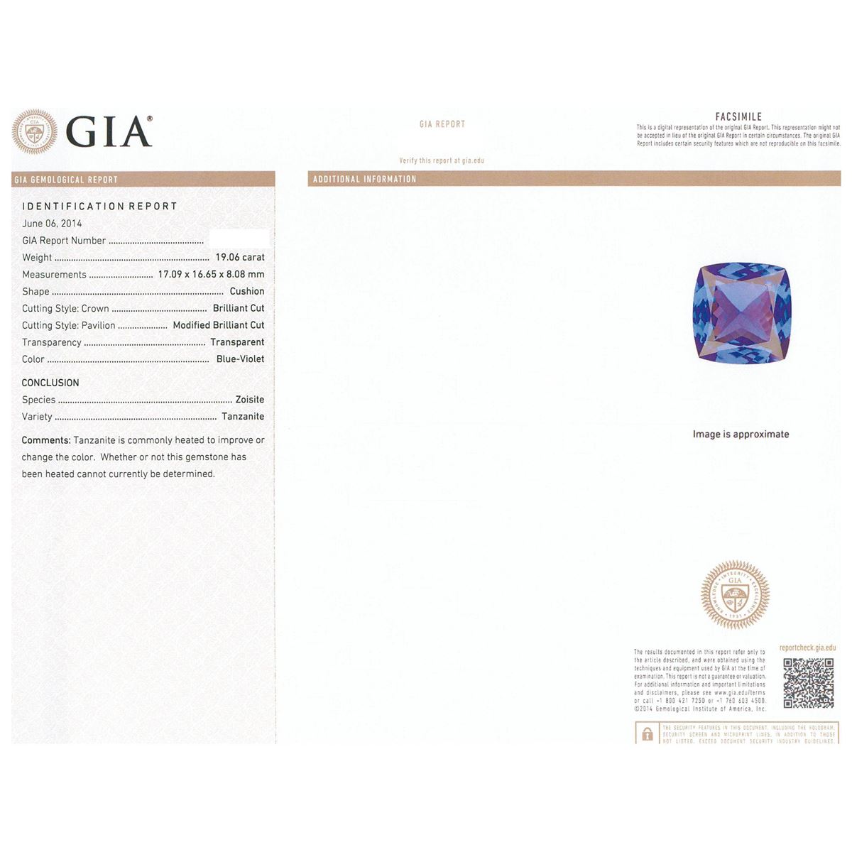 One electronically tested 18KT white gold ladies cast tanzanite and diamond ring. The featured tanzanite is set within an elaborate diamond set curvature, completed by a five and one-half millimeter wide band. Bright polish finish with milgrain detailing. Identified with markings of "750". Containing: One prong set cushion modified brilliant cut natural tanzanite, measuring 17.09 x 16.65 x 8.08mm, exact weight 19.06ct., type I Clarity is eye clean, dark, moderately strong, blue-violet color, (GIA BV), cut is good. Transmitting light with no distortion, transparent. GIA Gemological Report attached. Graded loose prior to setting in the GIA Laboratory, Report #6167211965. Tanzanite is a very rare gemstone that is only found in the country of Tanzania. Originally discovered in 1967. Tiffany & Company, named the stone Tanzanite. It is found in the Usumburu Mountains that border the Umba Valley of northern Tanzania. Tanzanite occurs in gray, brown, violet, blue, reddish-purple, & green. The gem is interesting because of its exceptional pleochroism. Rotated in different directions a tanzanite will exhibit multiple changes of color. Tanzanite has a low tolerance to ultrasonic cleaning, and should not be cleaned using this method. Two Hundred Twenty-Two pave set round brilliant cut diamonds, measuring 1.90 - 1.50 x 1.02mm (depth est.) approximate total weight of 222 Stones = 4.07ct. Graded in the setting. Clarity: VS-1 to SI-1 . Color: G - I Fifty-Three channel set baguette cut (tapered) diamonds, measuring from 2.50 x 1.30 x 0.91mm (depth est.) to 4.00 x 1.40 x 0.98mm (depth est.) approximate total weight of 53 Stones = 2.00ct. Graded in the setting. Clarity: VVS-2 to VS . Color: G - I. Total Weight of Colored Stones 19.06ct. Total Weight of Diamonds 6.07ct. Total Weight of Ring 22.47 grams. AIG Appraised at $75,890.00.