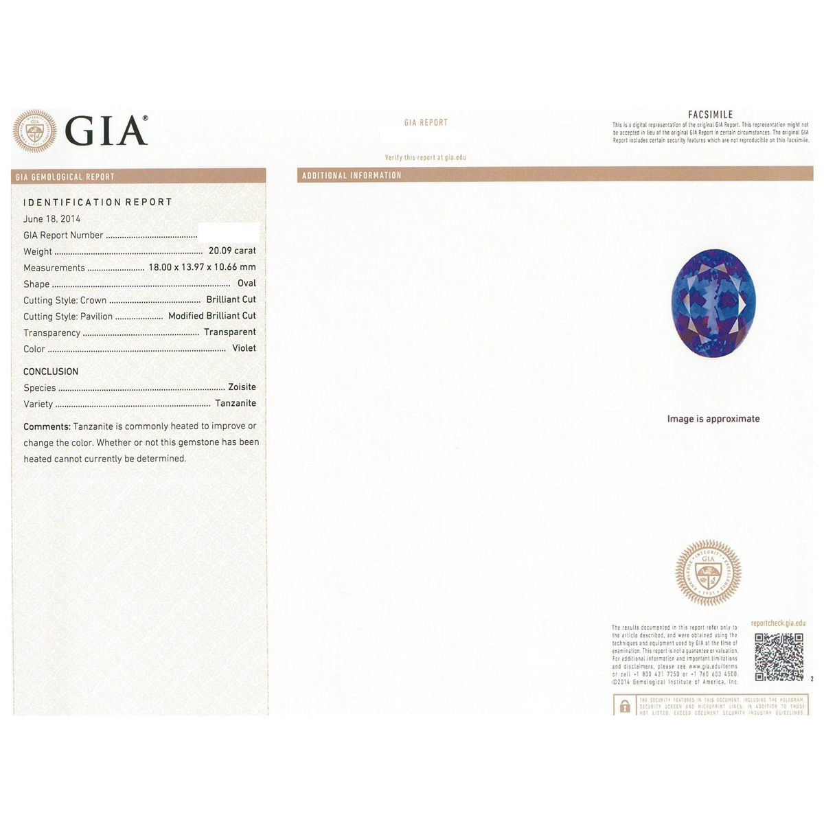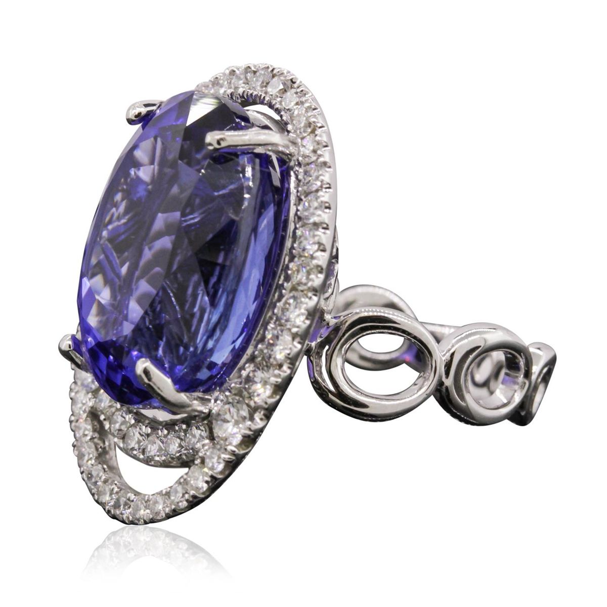 One electronically tested 18KT white gold ladies cast tanzanite and diamond ring with a bright polish finish. Condition is new, good workmanship. The featured tanzanite is set within a two tiered diamond lattice gallery, supported by designer style shoulders and completed by a four millimeter wide band. Trademark is UCG. Identified with markings of "18K 750". Containing: One prong set oval modified brilliant cut natural tanzanite, measuring 18.00 x 13.97 x 10.66mm, exact weight 20.09ct., clarity is eye clean, type I, medium dark, moderately strong, violet color, (GIA V 6/4), cut is good. Transmitting light with no distortion, transparent. GIA Gemological Report attached. Graded loose prior to setting in the GIA Laboratory, Report # 2161211898.Tanzanite is a very rare gemstone that is only found in the country of Tanzania. Originally discovered in 1967. Tiffany & Company, named the stone Tanzanite. It is found in the Usumburu Mountains that border the Umba Valley of northern Tanzania. Tanzanite occurs in gray, brown, violet, blue, reddish-purple, & green. The gem is interesting because of its exceptional pleochroism. Rotated in different directions a tanzanite will exhibit multiple changes of color. Tanzanite has a low tolerance to ultrasonic cleaning, and should not be cleaned using this method. Forty prong set round brilliant cut diamonds, measuring 3.00 - 1.70 x 1.41mm (depth est.) approximate total weight of 40 Stones = 1.14ct. Graded in the setting. Clarity: VS-2 to SI-2 . Color: F - G. Total Weight of Colored Stones 20.09ct. Total Weight of Diamonds 1.14ct. Total Weight of Ring 13.30 grams. AIG Appraised at $63,115.00.