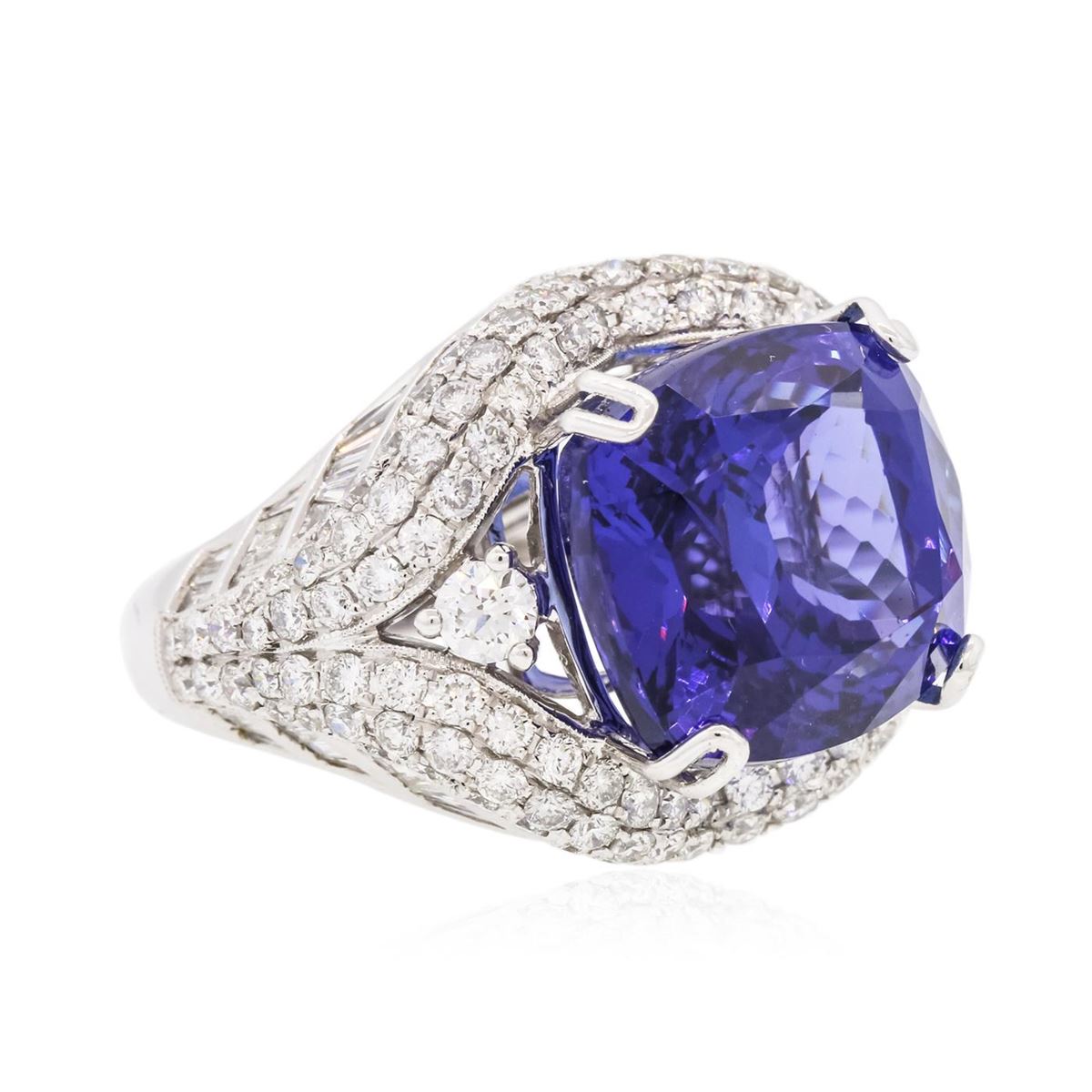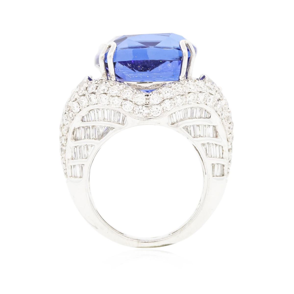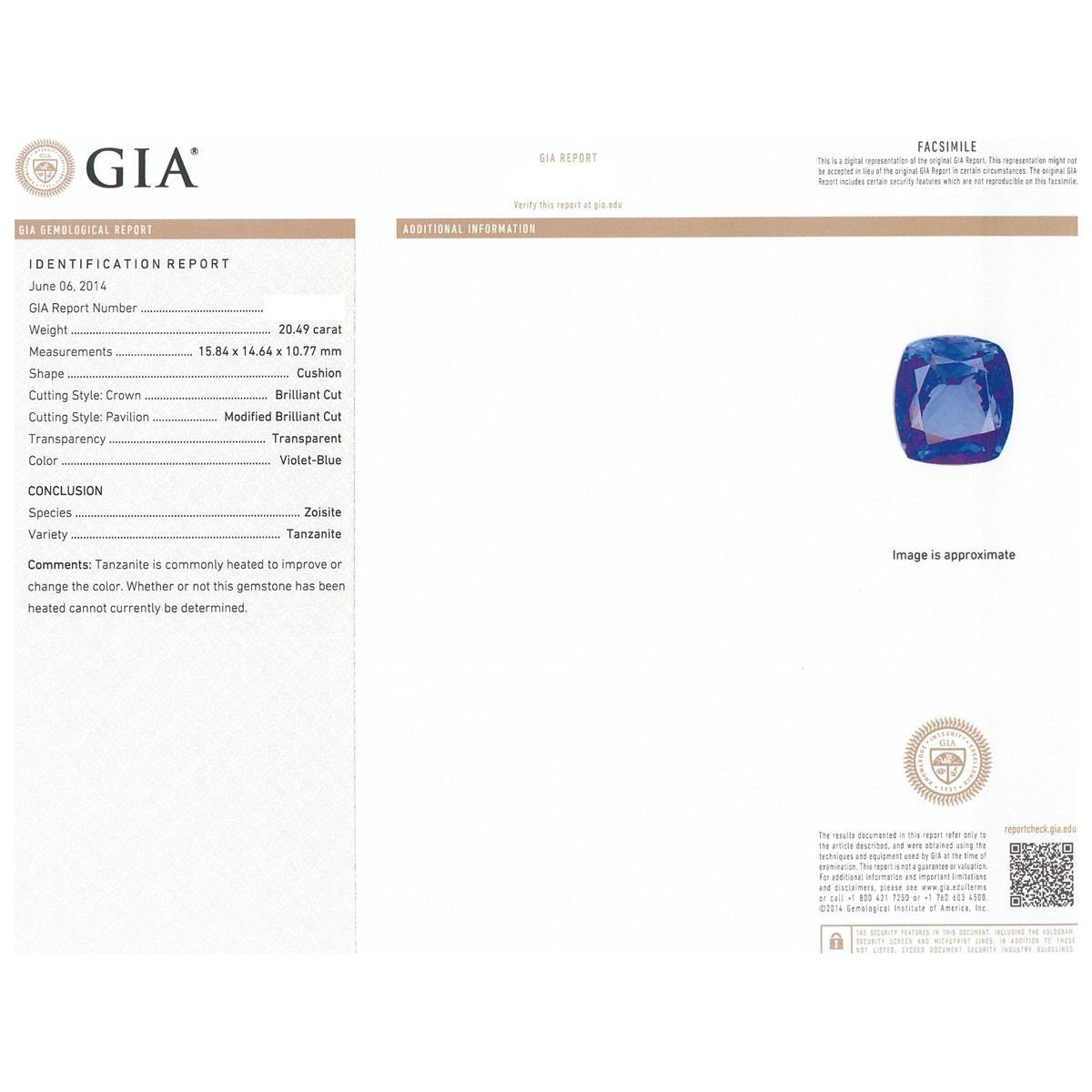 One electronically tested 18KT white gold ladies cast tanzanite and diamond ring with a bright polish & milgrain finish. Condition is new, good workmanship. The featured tanzanite is set within a diamond lattice gallery, completed by a four millimeter wide band. Trademark is UCG. Identified with markings of "18K 750". Containing: One prong set rectangular cushion modified brilliant cut natural tanzanite, measuring 15.84 x 14.64 x 10.77mm, approximate weight of 20.49ct., type I Clarity is eye clean, medium dark, very slightly grayish, Violet-Blue color, (GIA VB 6/3), cut is good. Transmitting light with no distortion, transparent. GIA Gemological Report attached. Graded loose prior to setting in the GIA Laboratory, Report # 1166212009.Tanzanite is a very rare gemstone that is only found in the country of Tanzania. Originally discovered in 1967. Tiffany & Company, named the stone Tanzanite. It is found in the Usumburu Mountains. Tanzanite occurs in gray, brown, violet, blue, reddish-purple, & green. The gem is interesting because of its exceptional pleochroism. Rotated in different directions a tanzanite will exhibit multiple changes of color. Tanzanite has a low tolerance to ultrasonic cleaning, and should not be cleaned using this method. Two prong set round brilliant cut diamonds, measuring 3.50 - 3.40 x 2.07mm (depth est.) approximate total weight of 2 Stones = 0.40ct. Graded in the setting. Clarity: VS-1 to VS-2 . Color: F - G One Hundred Thirty-Two prong set round brilliant cut diamonds, measuring 1.80 - 1.40 x 0.96mm (depth est.) approximate total weight of 132 Stones = 2.58ct. Graded in the setting. Clarity: SI-1 to I-1 . Color: F - H Ninety-Two channel set baguette cut diamonds, measuring from 1.00 x 0.90 x 0.63mm (depth est.) to 2.20 x 0.90 x 0.63mm (depth est.) approximate total weight of 92 Stones = 0.76ct. Graded in the setting. Clarity: VVS-2 to VS-2. Color: F - H. Total Weight of Colored Stones 20.49ct. Total Weight of Diamonds 3.74ct. Total Weight of Ring 19.40 grams. AIG Appraised at $73,775.00.