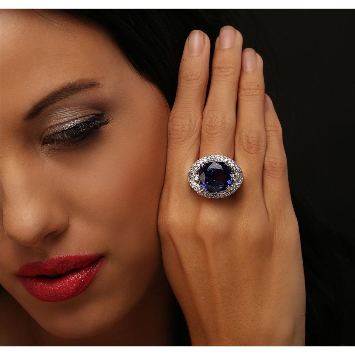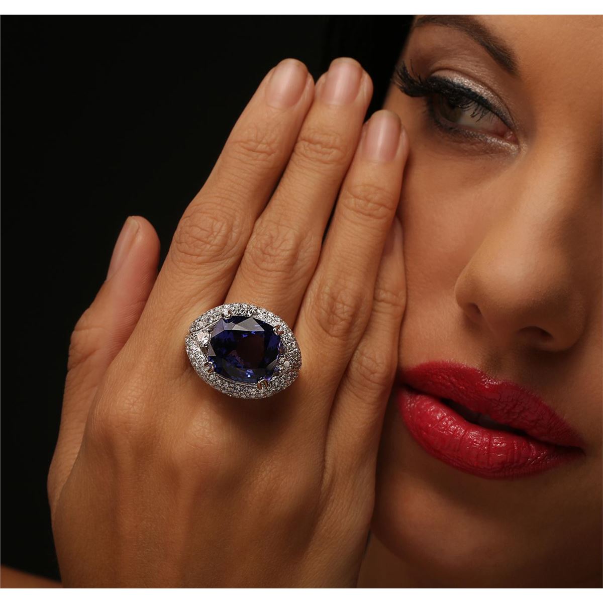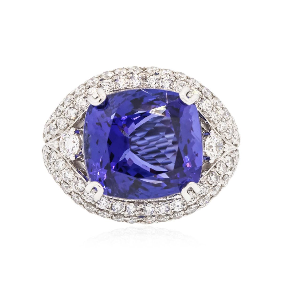One electronically tested 18KT white gold ladies cast tanzanite and diamond ring with a bright polish & milgrain finish. Condition is new, good workmanship. The featured tanzanite is set within a diamond lattice gallery, completed by a four millimeter wide band. Trademark is UCG. Identified with markings of "18K 750". Containing: One prong set rectangular cushion modified brilliant cut natural tanzanite, measuring 15.84 x 14.64 x 10.77mm, approximate weight of 20.49ct., type I Clarity is eye clean, medium dark, very slightly grayish, Violet-Blue color, (GIA VB 6/3), cut is good. Transmitting light with no distortion, transparent. GIA Gemological Report attached. Graded loose prior to setting in the GIA Laboratory, Report # 1166212009.Tanzanite is a very rare gemstone that is only found in the country of Tanzania. Originally discovered in 1967. Tiffany & Company, named the stone Tanzanite. It is found in the Usumburu Mountains. Tanzanite occurs in gray, brown, violet, blue, reddish-purple, & green. The gem is interesting because of its exceptional pleochroism. Rotated in different directions a tanzanite will exhibit multiple changes of color. Tanzanite has a low tolerance to ultrasonic cleaning, and should not be cleaned using this method. Two prong set round brilliant cut diamonds, measuring 3.50 - 3.40 x 2.07mm (depth est.) approximate total weight of 2 Stones = 0.40ct. Graded in the setting. Clarity: VS-1 to VS-2 . Color: F - G One Hundred Thirty-Two prong set round brilliant cut diamonds, measuring 1.80 - 1.40 x 0.96mm (depth est.) approximate total weight of 132 Stones = 2.58ct. Graded in the setting. Clarity: SI-1 to I-1 . Color: F - H Ninety-Two channel set baguette cut diamonds, measuring from 1.00 x 0.90 x 0.63mm (depth est.) to 2.20 x 0.90 x 0.63mm (depth est.) approximate total weight of 92 Stones = 0.76ct. Graded in the setting. Clarity: VVS-2 to VS-2. Color: F - H. Total Weight of Colored Stones 20.49ct. Total Weight of Diamonds 3.74ct. Total Weight of Ring 19.40 grams. AIG Appraised at $73,775.00.