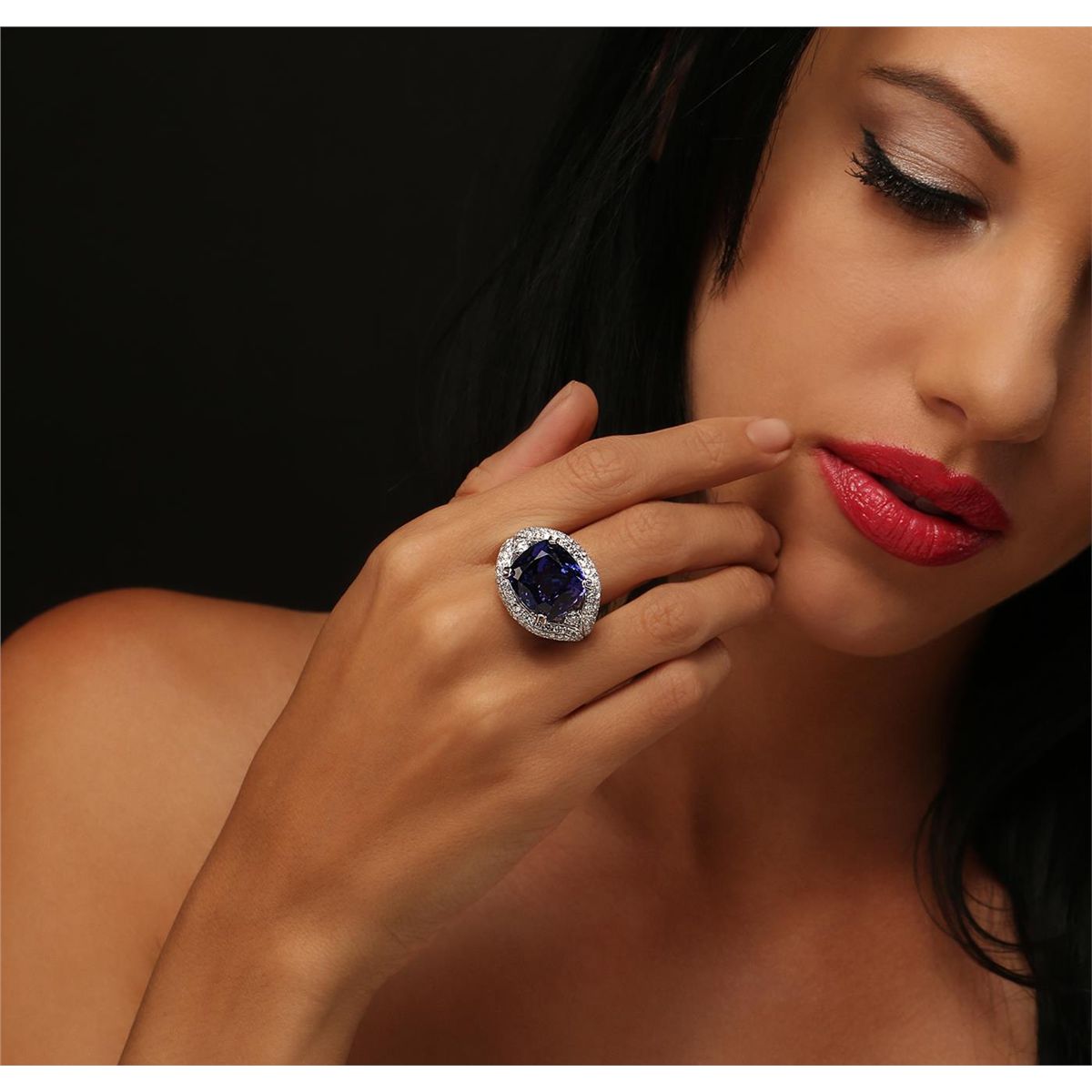 One electronically tested 18KT white gold ladies cast tanzanite and diamond ring with a bright polish & milgrain finish. Condition is new, good workmanship. The featured tanzanite is set within a diamond lattice gallery, completed by a four millimeter wide band. Trademark is UCG. Identified with markings of "18K 750". Containing: One prong set rectangular cushion modified brilliant cut natural tanzanite, measuring 15.84 x 14.64 x 10.77mm, approximate weight of 20.49ct., type I Clarity is eye clean, medium dark, very slightly grayish, Violet-Blue color, (GIA VB 6/3), cut is good. Transmitting light with no distortion, transparent. GIA Gemological Report attached. Graded loose prior to setting in the GIA Laboratory, Report # 1166212009.Tanzanite is a very rare gemstone that is only found in the country of Tanzania. Originally discovered in 1967. Tiffany & Company, named the stone Tanzanite. It is found in the Usumburu Mountains. Tanzanite occurs in gray, brown, violet, blue, reddish-purple, & green. The gem is interesting because of its exceptional pleochroism. Rotated in different directions a tanzanite will exhibit multiple changes of color. Tanzanite has a low tolerance to ultrasonic cleaning, and should not be cleaned using this method. Two prong set round brilliant cut diamonds, measuring 3.50 - 3.40 x 2.07mm (depth est.) approximate total weight of 2 Stones = 0.40ct. Graded in the setting. Clarity: VS-1 to VS-2 . Color: F - G One Hundred Thirty-Two prong set round brilliant cut diamonds, measuring 1.80 - 1.40 x 0.96mm (depth est.) approximate total weight of 132 Stones = 2.58ct. Graded in the setting. Clarity: SI-1 to I-1 . Color: F - H Ninety-Two channel set baguette cut diamonds, measuring from 1.00 x 0.90 x 0.63mm (depth est.) to 2.20 x 0.90 x 0.63mm (depth est.) approximate total weight of 92 Stones = 0.76ct. Graded in the setting. Clarity: VVS-2 to VS-2. Color: F - H. Total Weight of Colored Stones 20.49ct. Total Weight of Diamonds 3.74ct. Total Weight of Ring 19.40 grams. AIG Appraised at $73,775.00.