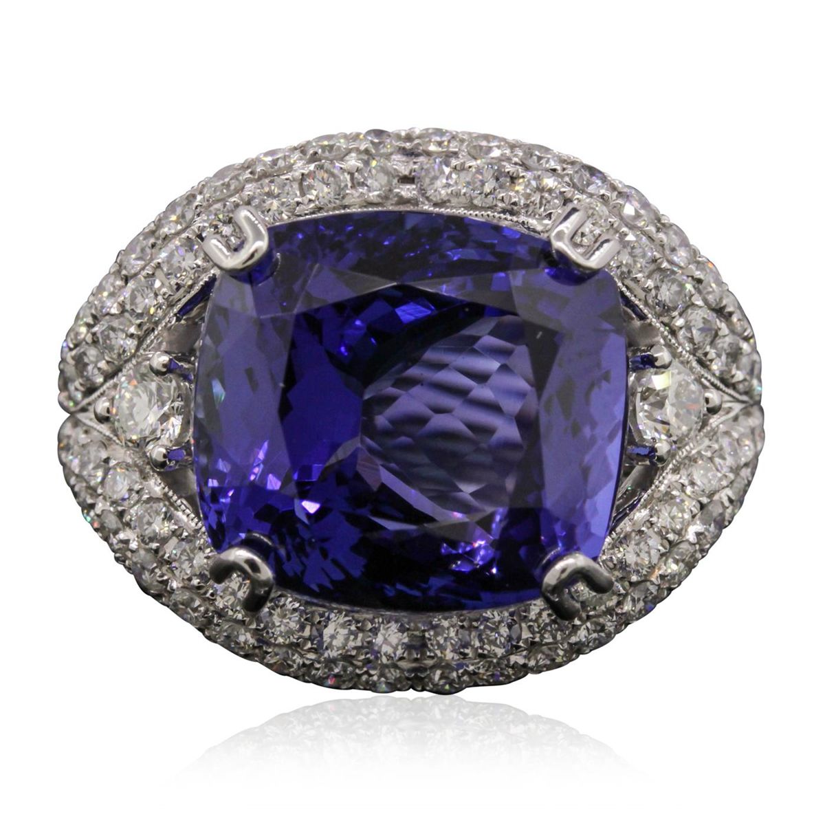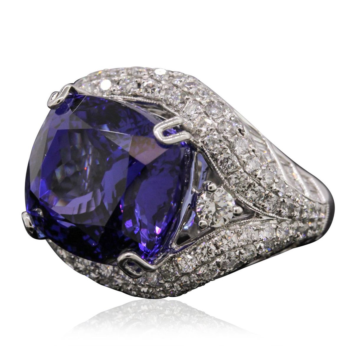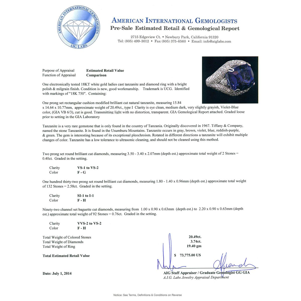 One electronically tested 18KT white gold ladies cast tanzanite and diamond ring with a bright polish & milgrain finish. Condition is new, good workmanship. The featured tanzanite is set within a diamond lattice gallery, completed by a four millimeter wide band. Trademark is UCG. Identified with markings of "18K 750". Containing: One prong set rectangular cushion modified brilliant cut natural tanzanite, measuring 15.84 x 14.64 x 10.77mm, approximate weight of 20.49ct., type I Clarity is eye clean, medium dark, very slightly grayish, Violet-Blue color, (GIA VB 6/3), cut is good. Transmitting light with no distortion, transparent. GIA Gemological Report attached. Graded loose prior to setting in the GIA Laboratory, Report # 1166212009.Tanzanite is a very rare gemstone that is only found in the country of Tanzania. Originally discovered in 1967. Tiffany & Company, named the stone Tanzanite. It is found in the Usumburu Mountains. Tanzanite occurs in gray, brown, violet, blue, reddish-purple, & green. The gem is interesting because of its exceptional pleochroism. Rotated in different directions a tanzanite will exhibit multiple changes of color. Tanzanite has a low tolerance to ultrasonic cleaning, and should not be cleaned using this method. Two prong set round brilliant cut diamonds, measuring 3.50 - 3.40 x 2.07mm (depth est.) approximate total weight of 2 Stones = 0.40ct. Graded in the setting. Clarity: VS-1 to VS-2 . Color: F - G One Hundred Thirty-Two prong set round brilliant cut diamonds, measuring 1.80 - 1.40 x 0.96mm (depth est.) approximate total weight of 132 Stones = 2.58ct. Graded in the setting. Clarity: SI-1 to I-1 . Color: F - H Ninety-Two channel set baguette cut diamonds, measuring from 1.00 x 0.90 x 0.63mm (depth est.) to 2.20 x 0.90 x 0.63mm (depth est.) approximate total weight of 92 Stones = 0.76ct. Graded in the setting. Clarity: VVS-2 to VS-2. Color: F - H. Total Weight of Colored Stones 20.49ct. Total Weight of Diamonds 3.74ct. Total Weight of Ring 19.40 grams. AIG Appraised at $73,775.00.