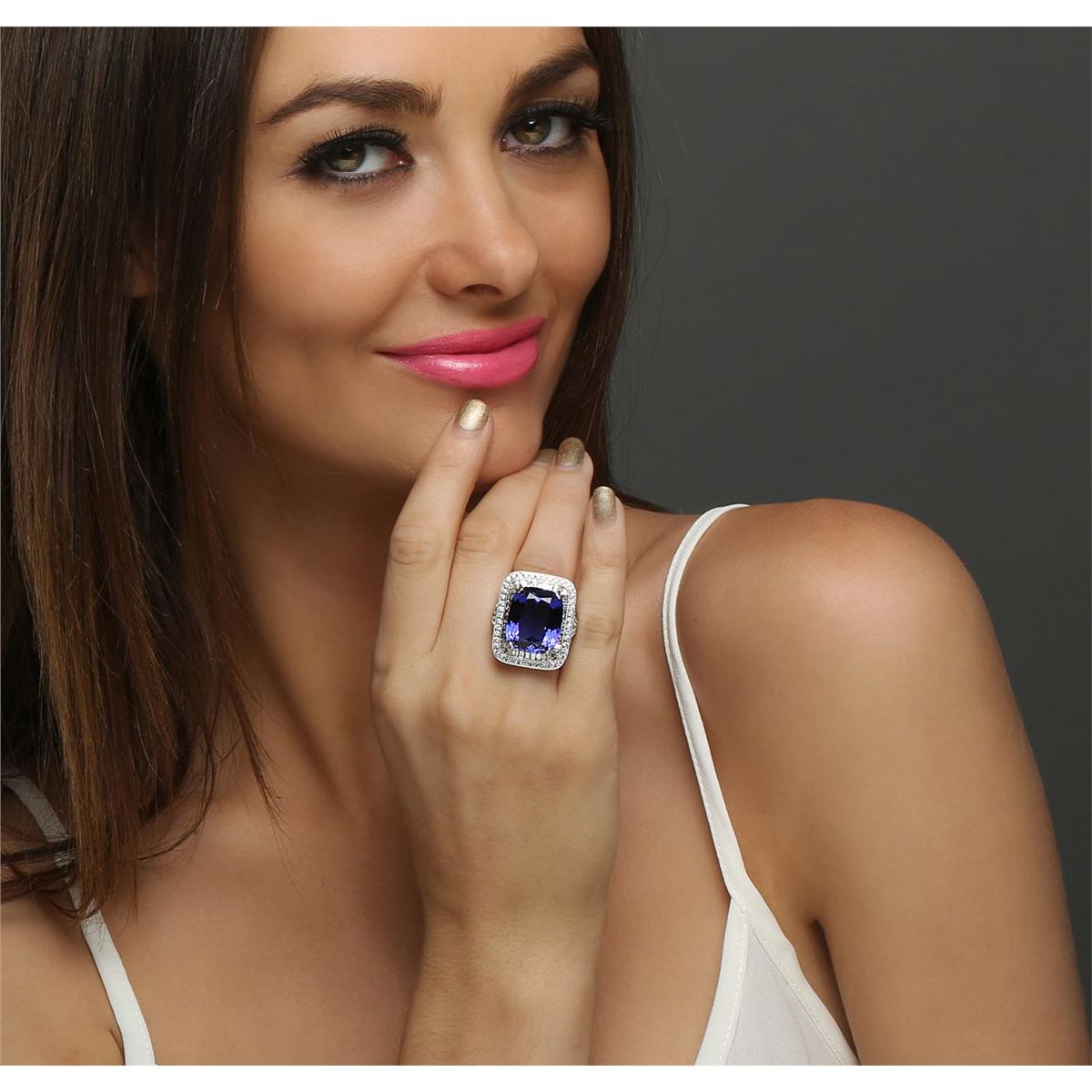 One electronically tested 18KT white gold ladies combination cast & assembled prong set ring with a flat shank with a bright polish finish. Identified with markings of "18K". Condition is new. Containing: One prong set rectangular cushion modified brilliant cut natural tanzanite, measuring 18.82 x 15.45 x 8.88mm, exact weight 21.75ct., clarity is eye clean, type I, medium dark, moderately strong, violetish blue color, (GIA vB 6/4), cut is very good. Graded loose prior to setting by GIA Gemological Laboratory, GIA Laboratory Report # 6167080562.Seventy-Eight prong set round brilliant cut diamonds, measuring 1.80 - 1.70 x 1.05mm (depth est.) approximate total weight of 78 Stones = 1.53ct. Clarity: SI-1 to I-1. Color: H - I, Cut is Good. Four prong set round brilliant cut diamonds, measuring 2.40 - 2.40 x 1.44mm (depth est.) approximate total weight of 4 Stones = 0.20ct. Clarity: SI-2. Color: J, Cut is Good. Twenty-Seven channel set baguette cut diamonds, measuring 2.50 x 1.80 x 1.53mm (depth est.) approximate total weight of 27 Stones = 1.70ct. Clarity: VS-1 to VS-2. Color: I, Cut is Good. Fifteen channel set baguette cut (tapered) diamonds, measuring from 1.80 x 1.10 x 0.94mm (depth est.) to 2.00 x 1.50 x 1.28mm (depth est.) approximate total weight of 15 Stones = 0.38ct. Clarity: VS-1 to VS-2. Color: I, Cut is Good. Colored gemstones are presumed to have been subjected to commonly used enhancement processes. All diamonds and colored gemstones are graded in the mounting, unless otherwise stated. Total Weight of Colored Stones 21.75ct. Total Weight of Diamonds 3.81ct. Total Weight of Ring 17.40 grams. GGL Appraised at $62,175.00.