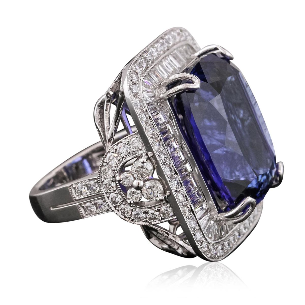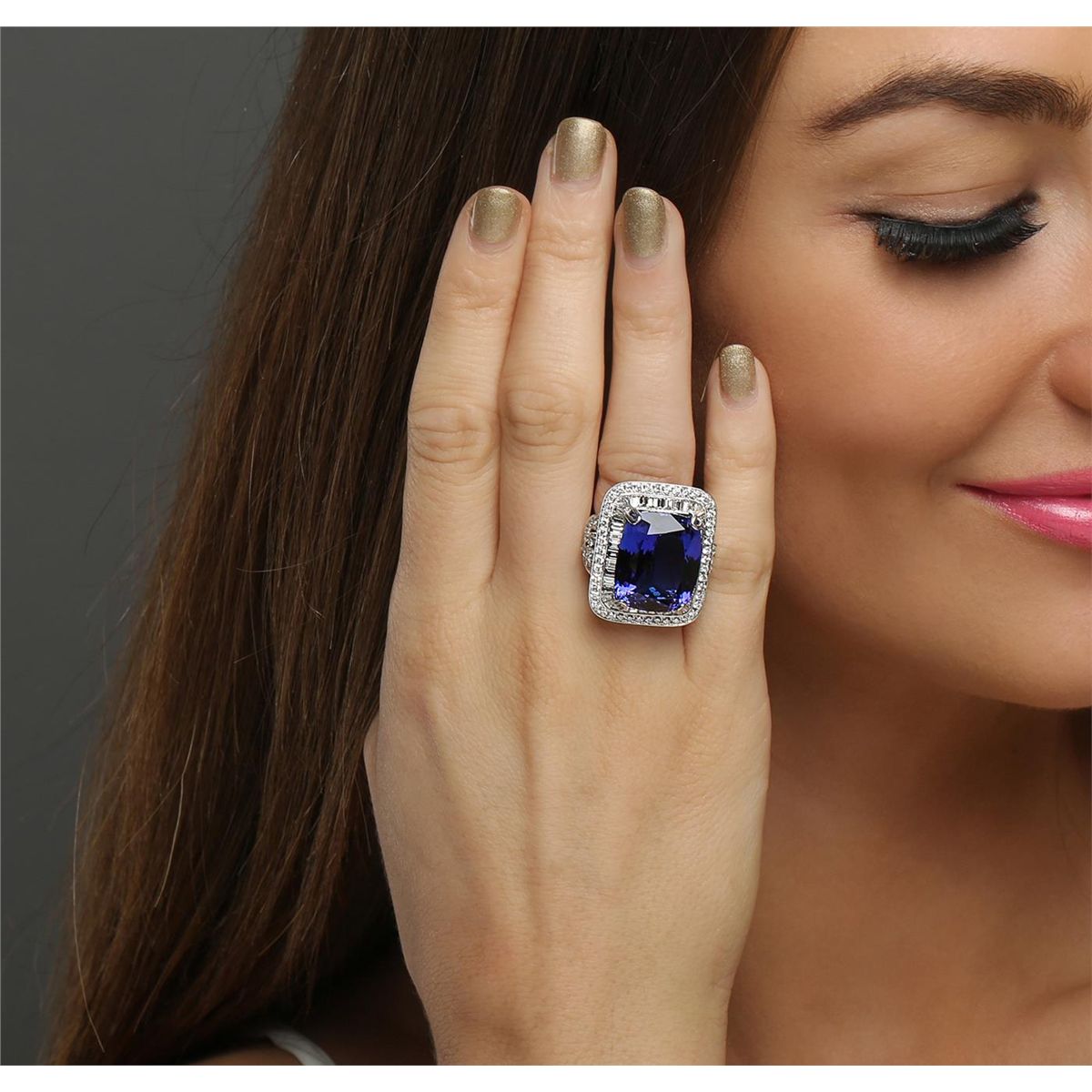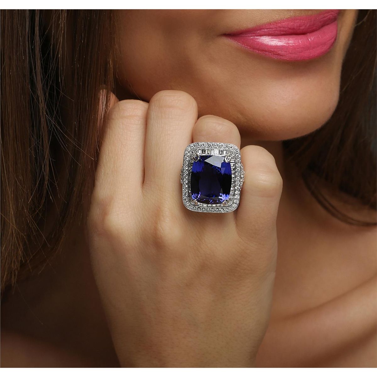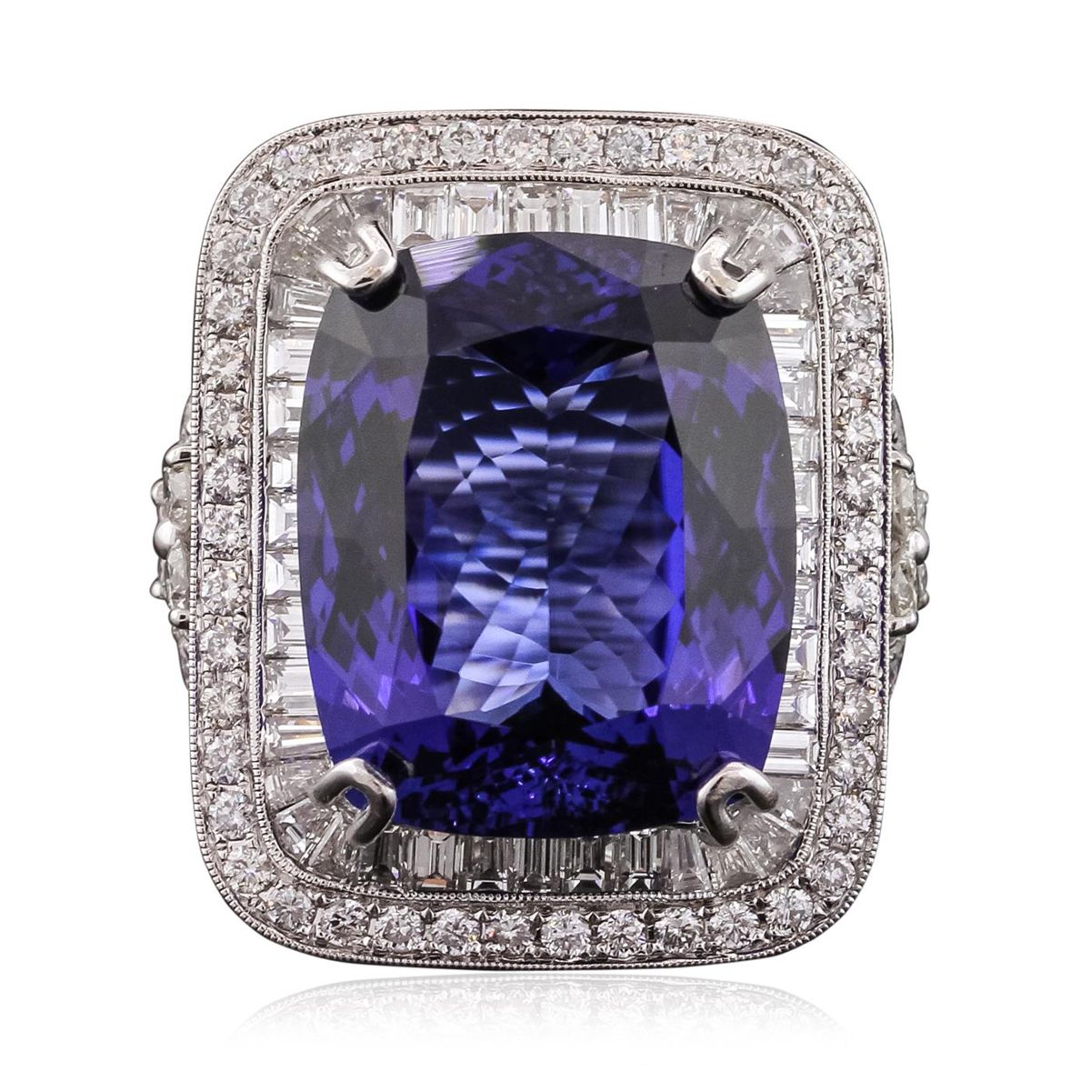 One electronically tested 18KT white gold ladies combination cast & assembled prong set ring with a flat shank with a bright polish finish. Identified with markings of "18K". Condition is new. Containing: One prong set rectangular cushion modified brilliant cut natural tanzanite, measuring 18.82 x 15.45 x 8.88mm, exact weight 21.75ct., clarity is eye clean, type I, medium dark, moderately strong, violetish blue color, (GIA vB 6/4), cut is very good. Graded loose prior to setting by GIA Gemological Laboratory, GIA Laboratory Report # 6167080562.Seventy-Eight prong set round brilliant cut diamonds, measuring 1.80 - 1.70 x 1.05mm (depth est.) approximate total weight of 78 Stones = 1.53ct. Clarity: SI-1 to I-1. Color: H - I, Cut is Good. Four prong set round brilliant cut diamonds, measuring 2.40 - 2.40 x 1.44mm (depth est.) approximate total weight of 4 Stones = 0.20ct. Clarity: SI-2. Color: J, Cut is Good. Twenty-Seven channel set baguette cut diamonds, measuring 2.50 x 1.80 x 1.53mm (depth est.) approximate total weight of 27 Stones = 1.70ct. Clarity: VS-1 to VS-2. Color: I, Cut is Good. Fifteen channel set baguette cut (tapered) diamonds, measuring from 1.80 x 1.10 x 0.94mm (depth est.) to 2.00 x 1.50 x 1.28mm (depth est.) approximate total weight of 15 Stones = 0.38ct. Clarity: VS-1 to VS-2. Color: I, Cut is Good. Colored gemstones are presumed to have been subjected to commonly used enhancement processes. All diamonds and colored gemstones are graded in the mounting, unless otherwise stated. Total Weight of Colored Stones 21.75ct. Total Weight of Diamonds 3.81ct. Total Weight of Ring 17.40 grams. GGL Appraised at $62,175.00.