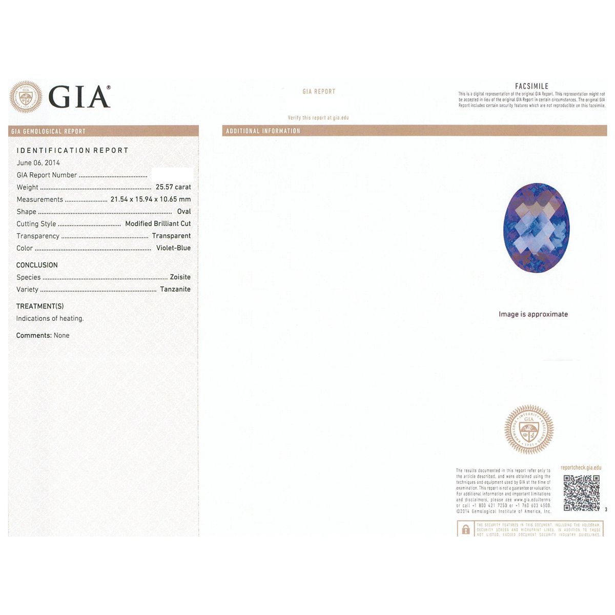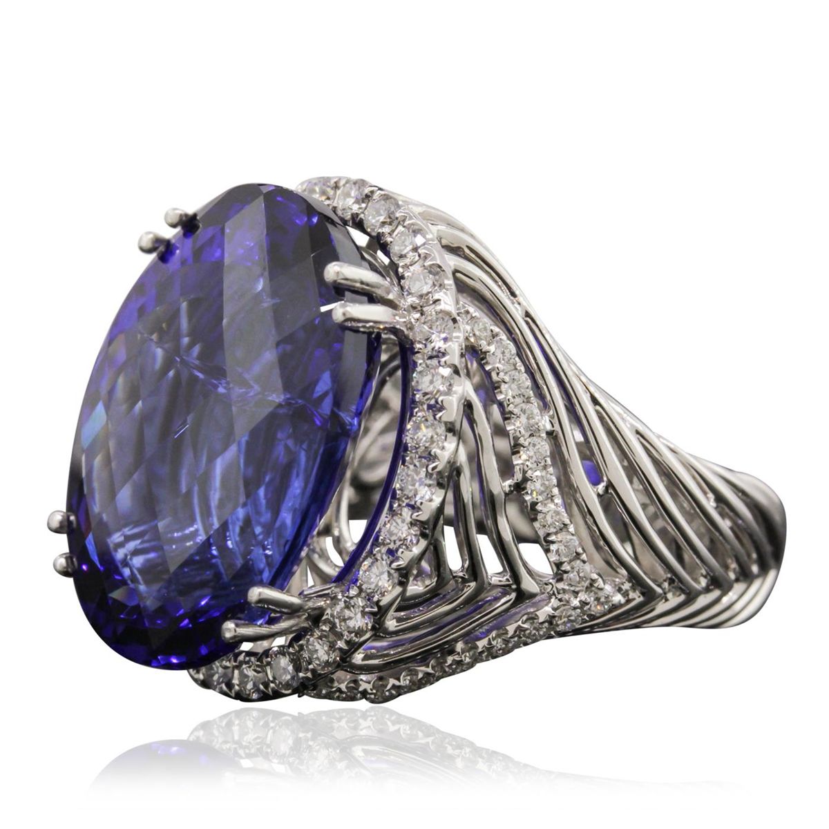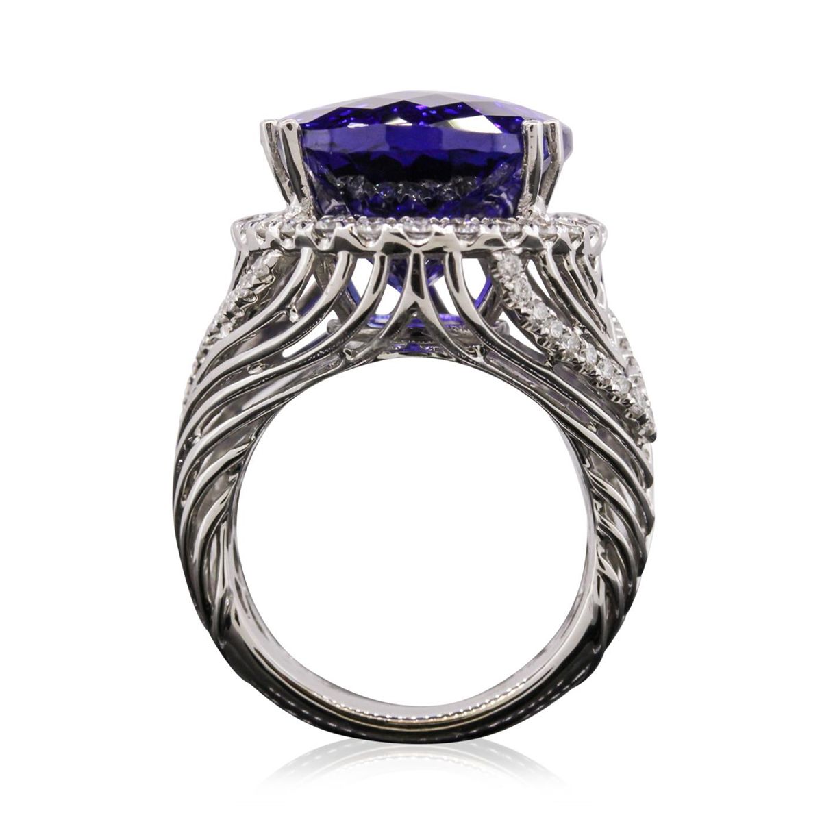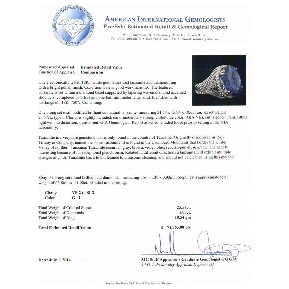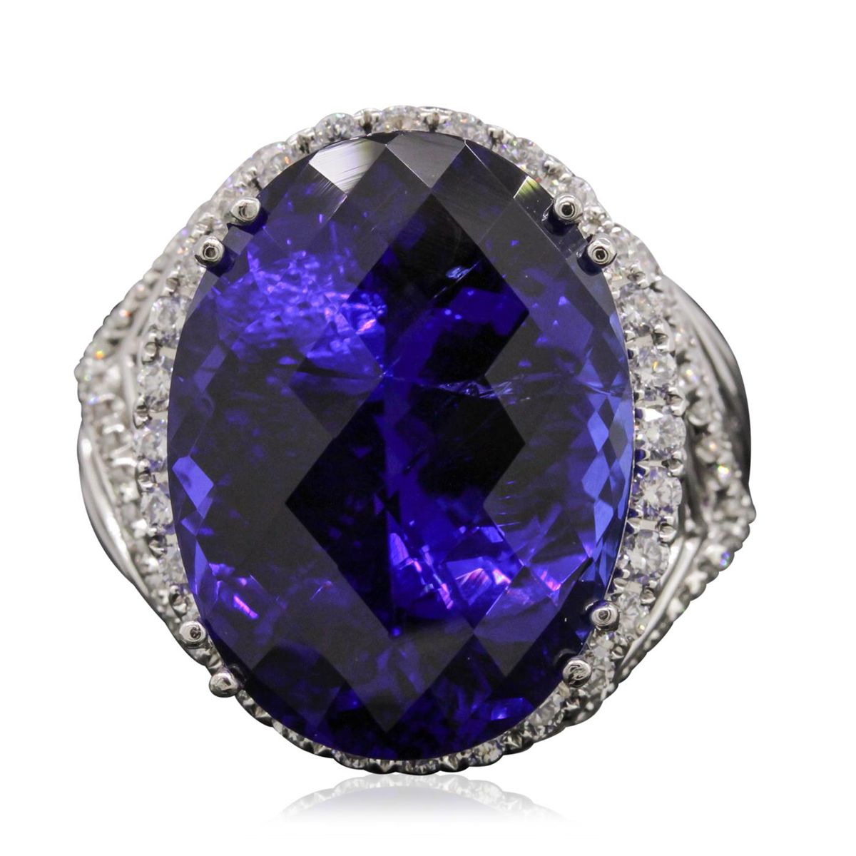 One electronically tested 18KT white gold ladies cast tanzanite and diamond ring with a bright polish finish. Condition is new, good workmanship. The featured tanzanite is set within a diamond bezel supported by tapering woven diamond accented shoulders, completed by a five and one-half millimeter wide band. Identified with markings of "18K 750". Containing: One prong set oval modified brilliant cut natural tanzanite, measuring 21.54 x 15.94 x 10.65mm, exact weight 25.57ct., type I Clarity is slightly included, dark, moderately strong, violet-blue color, (GIA VB), cut is good. Transmitting light with no distortion, transparent. GIA Gemological Report attached. Graded loose prior to setting in the GIA Laboratory, Report #2161211975. Tanzanite is a very rare gemstone that is only found in the country of Tanzania. Originally discovered in 1967. Tiffany & Company, named the stone Tanzanite. It is found in the Usumburu Mountains that border the Umba Valley of northern Tanzania. Tanzanite occurs in gray, brown, violet, blue, reddish-purple, & green. The gem is interesting because of its exceptional pleochroism. Rotated in different directions a tanzanite will exhibit multiple changes of color. Tanzanite has a low tolerance to ultrasonic cleaning, and should not be cleaned using this method. Sixty-Six prong set round brilliant cut diamonds, measuring 1.80 - 1.30 x 0.93mm (depth est.) approximate total weight of 66 Stones = 1.00ct. Graded in the setting. Clarity: VS-2 to SI-2 . Color: G - I. Total Weight of Colored Stones 25.57ct. Total Weight of Diamonds 1.00ct. Total Weight of Ring 18.54 grams. AIG Appraised at $71,365.00.