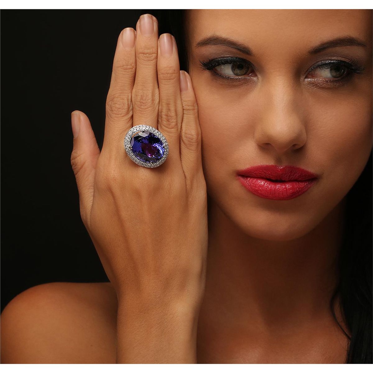 One electronically tested 18KT white gold ladies cast tanzanite and diamond ring. The featured tanzanite is set within a tiered diamond bezel supported by intertwining shoulders, completed by a two and one-half millimeter wide band. Bright polish finish with milgrain detailing. Trademark is UCG. Identified with markings of "18K 750". Containing: One prong set oval modified brilliant cut natural tanzanite, measuring 21.30 x 17.40 x 11.32mm, exact weight 30.19ct., clarity is eye clean, type I, medium dark, moderately strong, bluish violet color, (GIA bV 6/4), cut is good. Transmitting light with no distortion, transparent. GIA Gemological Report attached. Graded loose prior to setting in the GIA Laboratory, Report #2161211925.Tanzanite is a very rare gemstone that is only found in the country of Tanzania. Originally discovered in 1967. Tiffany & Company, named the stone Tanzanite. It is found in the Usumburu Mountains that border the Umba Valley of northern Tanzania. Tanzanite occurs in gray, brown, violet, blue, reddish-purple, & green. The gem is interesting because of its exceptional pleochroism. Rotated in different directions a tanzanite will exhibit multiple changes of color. Tanzanite has a low tolerance to ultrasonic cleaning, and should not be cleaned using this method. Seventy-Eight prong set round brilliant cut diamonds, measuring 1.60 - 1.60 x 0.96mm (depth est.) approximate total weight of 78 Stones = 1.26ct. Graded in the setting. Clarity: SI-1 to I-1 . Color: G - I. Total Weight of Colored Stones 30.19ct. Total Weight of Diamonds 1.26ct. Total Weight of Ring 16.30 grams. AIGAppraised at $82,275.00.