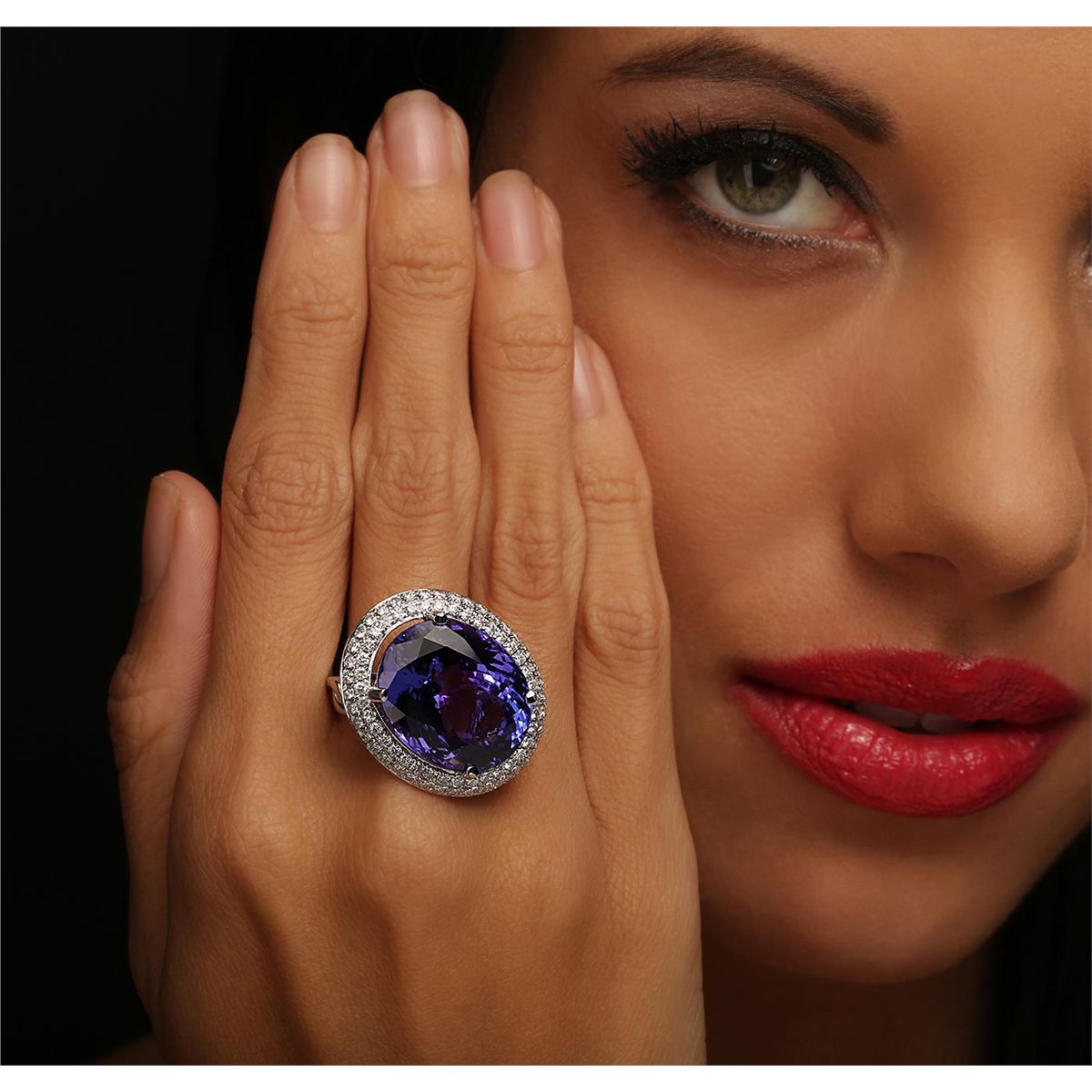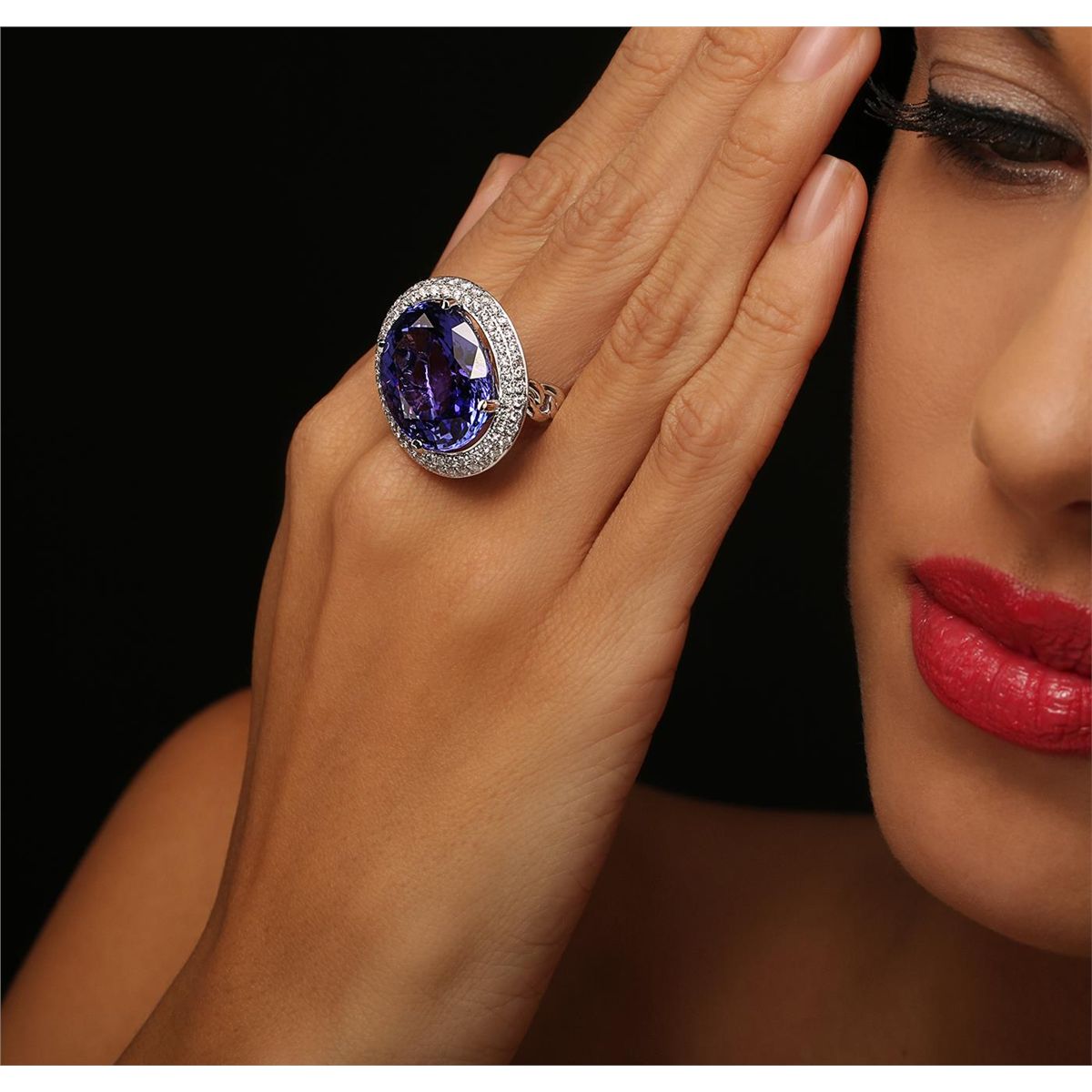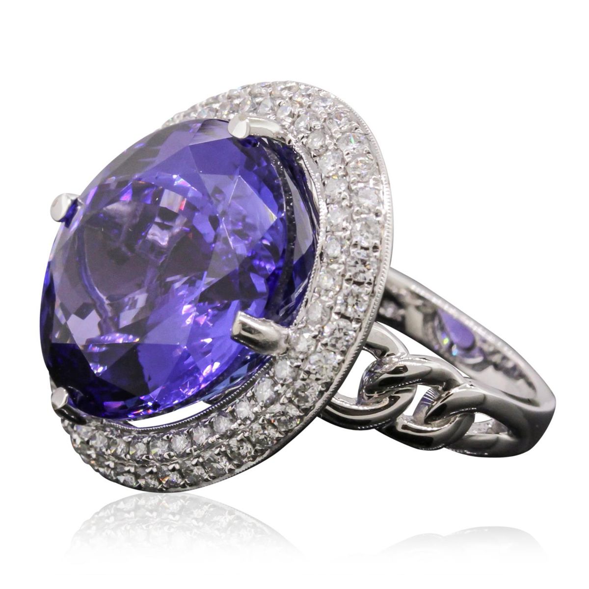 One electronically tested 18KT white gold ladies cast tanzanite and diamond ring. The featured tanzanite is set within a tiered diamond bezel supported by intertwining shoulders, completed by a two and one-half millimeter wide band. Bright polish finish with milgrain detailing. Trademark is UCG. Identified with markings of "18K 750". Containing: One prong set oval modified brilliant cut natural tanzanite, measuring 21.30 x 17.40 x 11.32mm, exact weight 30.19ct., clarity is eye clean, type I, medium dark, moderately strong, bluish violet color, (GIA bV 6/4), cut is good. Transmitting light with no distortion, transparent. GIA Gemological Report attached. Graded loose prior to setting in the GIA Laboratory, Report #2161211925.Tanzanite is a very rare gemstone that is only found in the country of Tanzania. Originally discovered in 1967. Tiffany & Company, named the stone Tanzanite. It is found in the Usumburu Mountains that border the Umba Valley of northern Tanzania. Tanzanite occurs in gray, brown, violet, blue, reddish-purple, & green. The gem is interesting because of its exceptional pleochroism. Rotated in different directions a tanzanite will exhibit multiple changes of color. Tanzanite has a low tolerance to ultrasonic cleaning, and should not be cleaned using this method. Seventy-Eight prong set round brilliant cut diamonds, measuring 1.60 - 1.60 x 0.96mm (depth est.) approximate total weight of 78 Stones = 1.26ct. Graded in the setting. Clarity: SI-1 to I-1 . Color: G - I. Total Weight of Colored Stones 30.19ct. Total Weight of Diamonds 1.26ct. Total Weight of Ring 16.30 grams. AIG Appraised at $82,275.00.